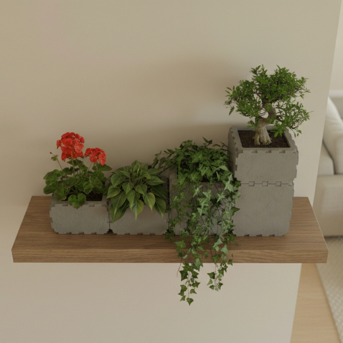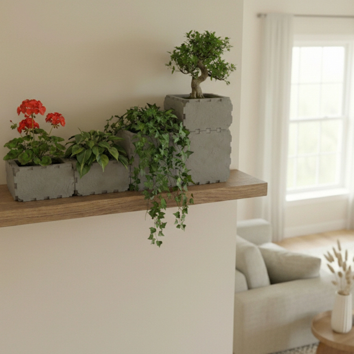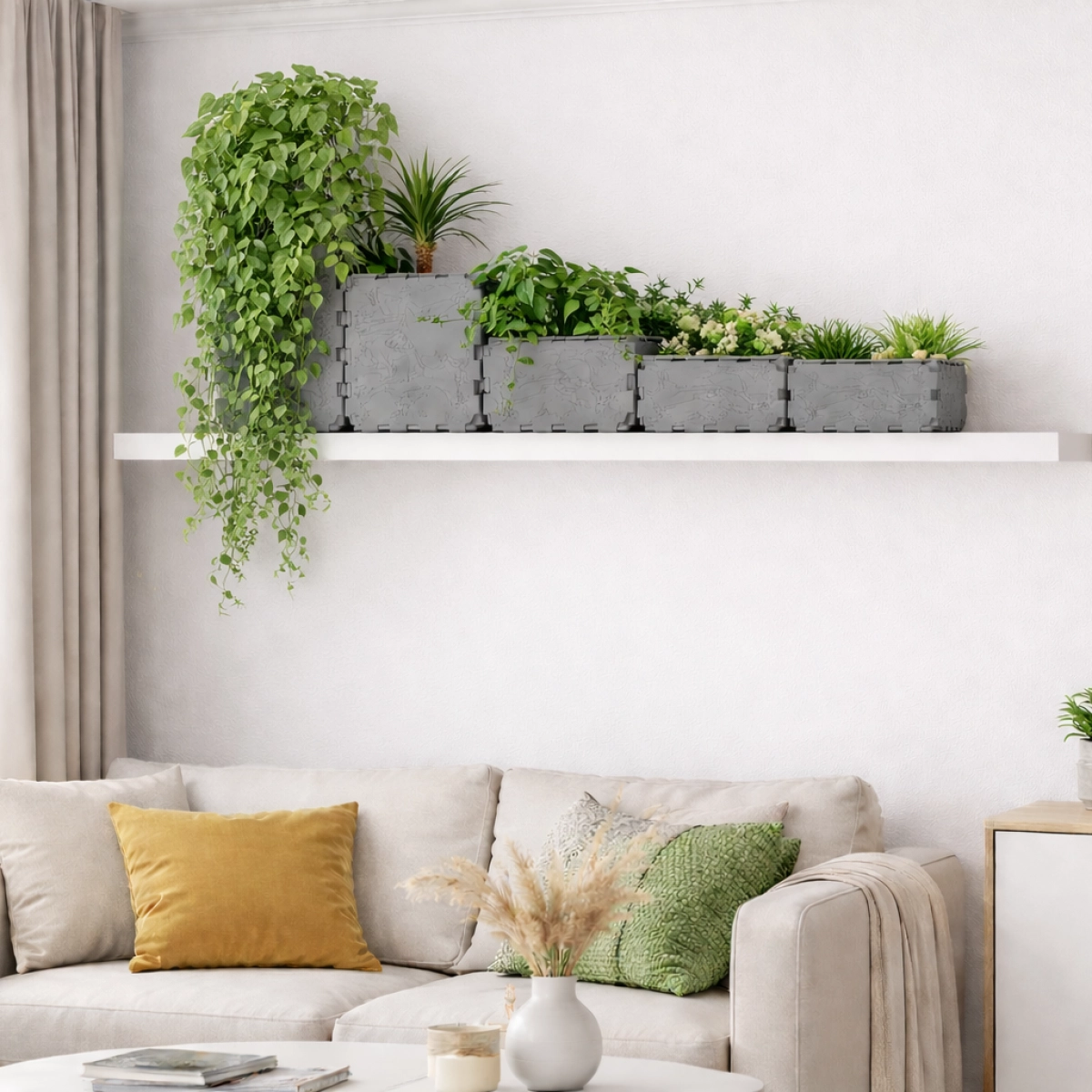 A modern stepped wall planter made from durable Cubik.one modular cubes. Designed to sit perfectly on a shelf or mounted surface, it creates a clean green accent in any apartment interior. The open modular format allows you to combine different plants in one композиция, from compact herbs to cascading trailing greenery.