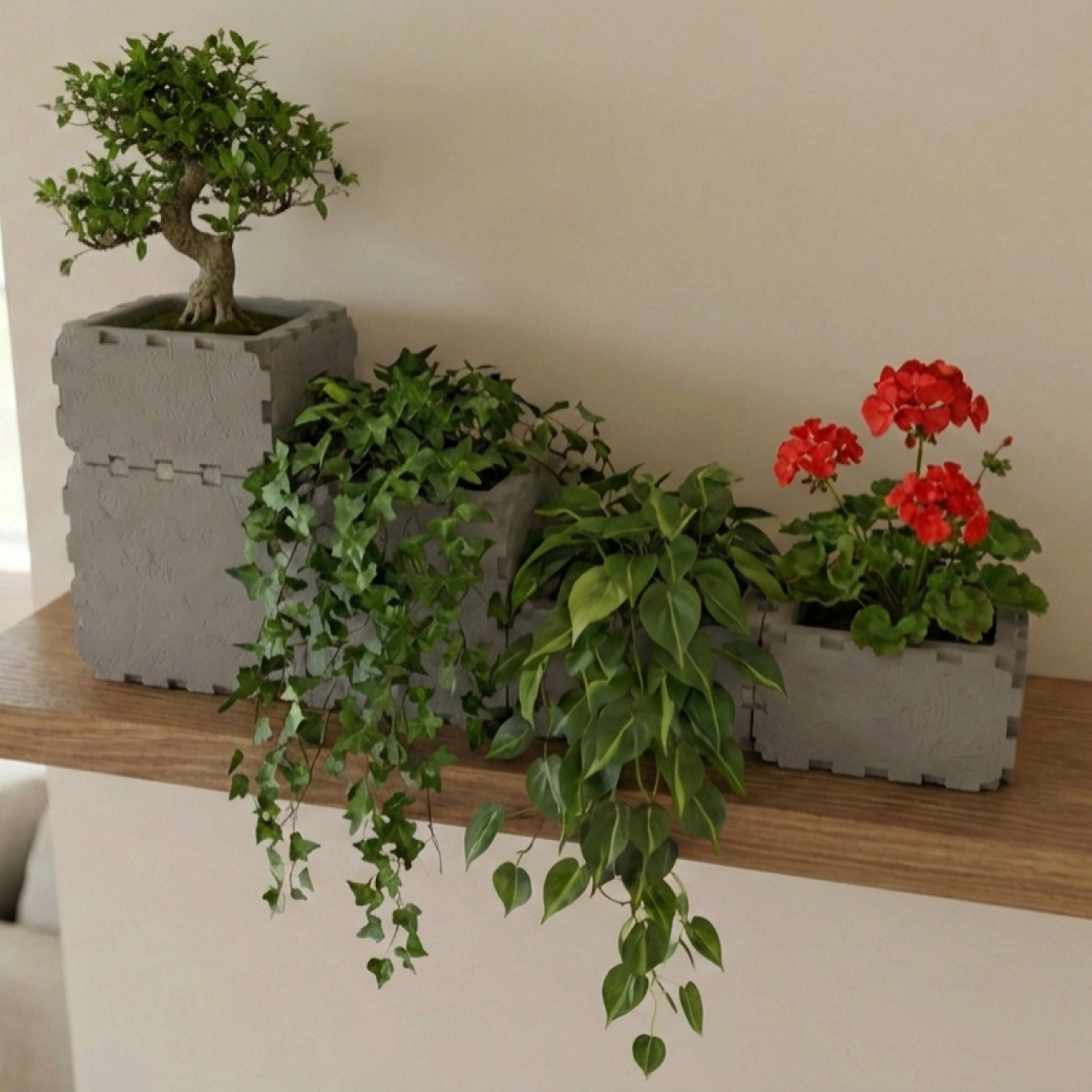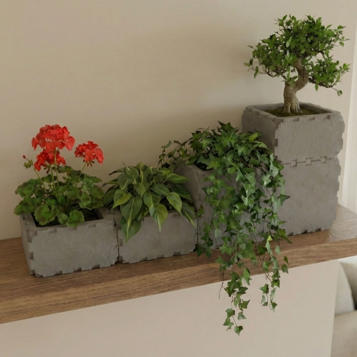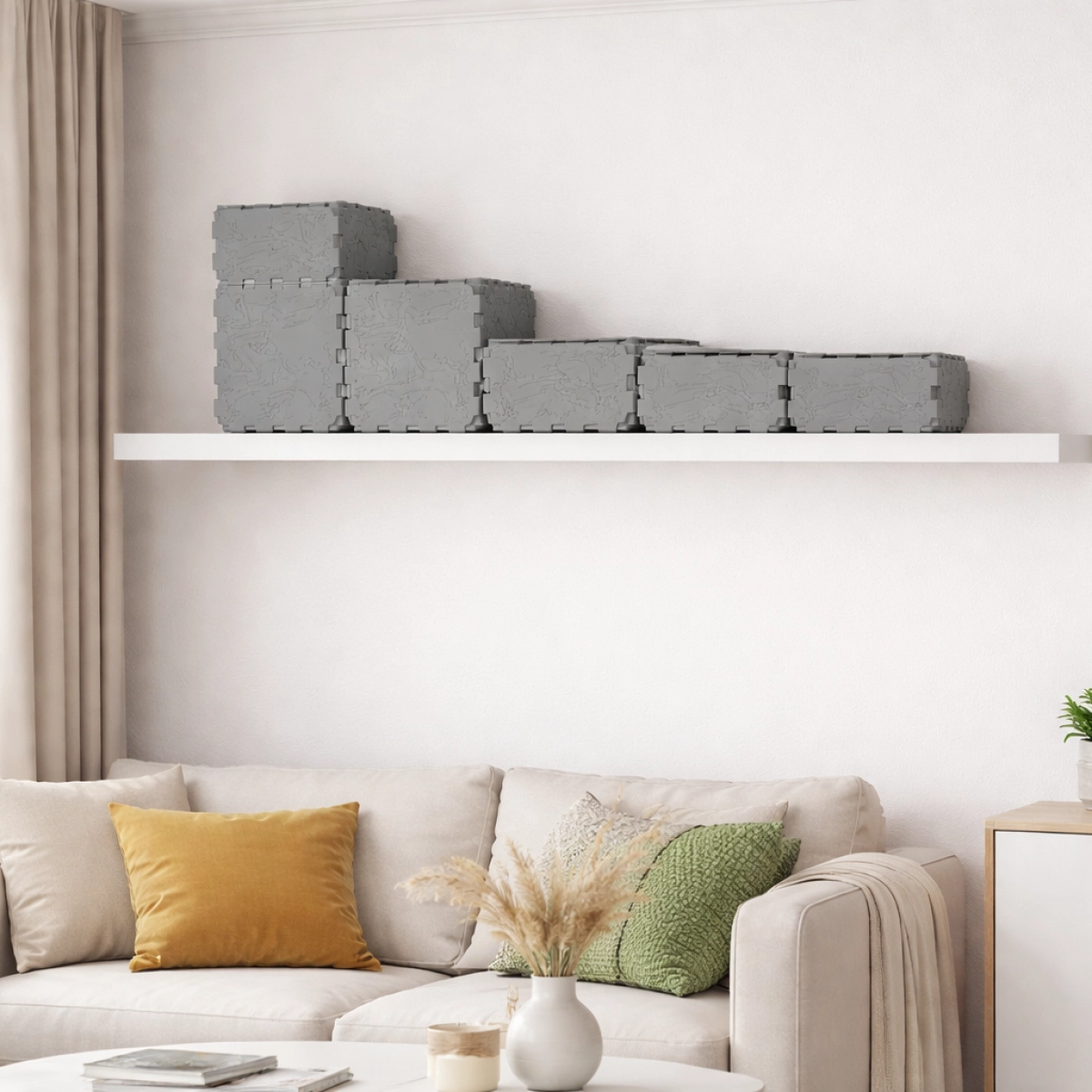 A modern stepped wall planter made from durable Cubik.one modular cubes. Designed to sit perfectly on a shelf or mounted surface, it creates a clean green accent in any apartment interior. The open modular format allows you to combine different plants in one композиция, from compact herbs to cascading trailing greenery.