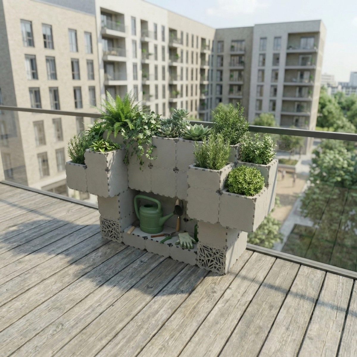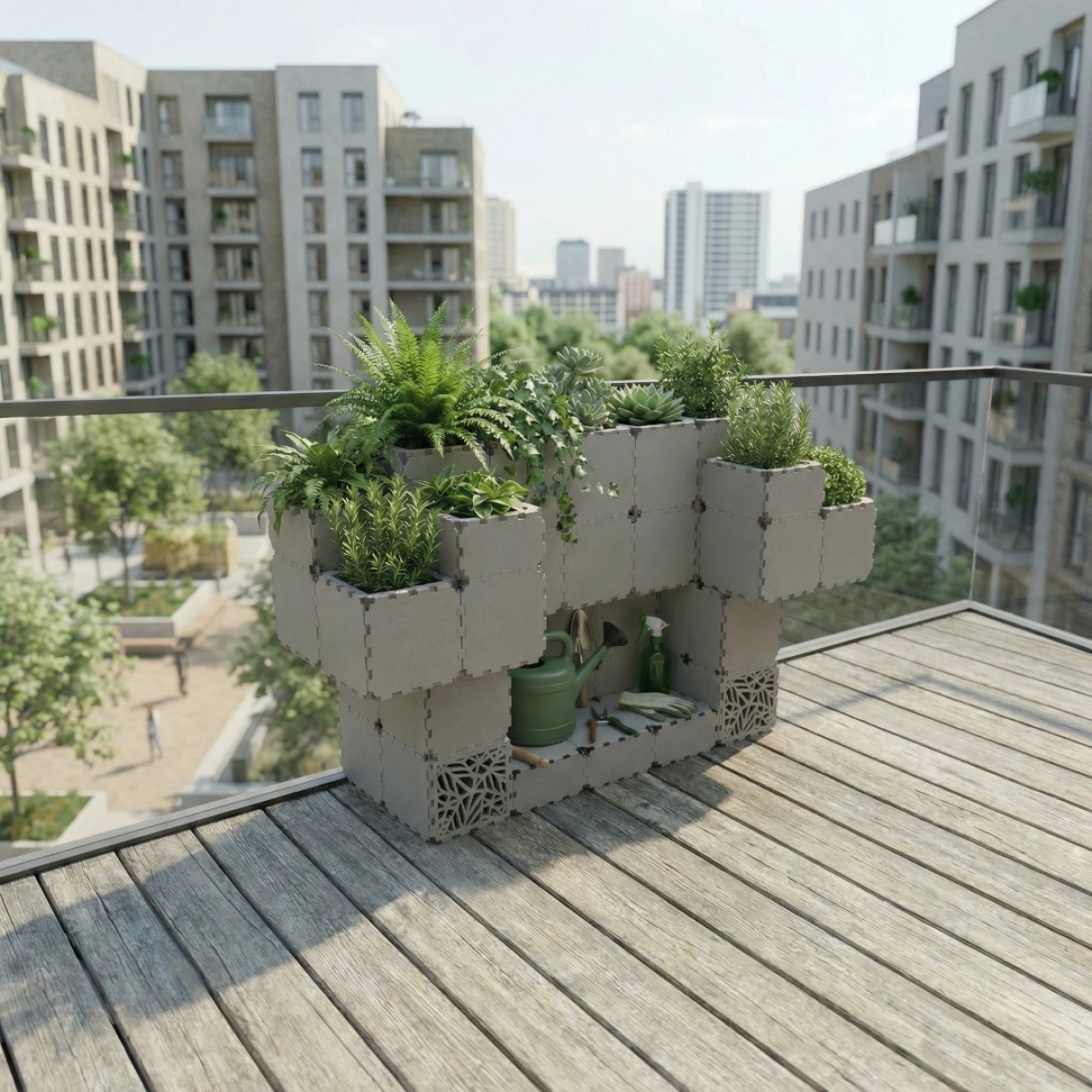 Balcony Garden Station Planter is a modular stepped planter designed specifically for balconies and compact terraces. The structure creates a layered planting layout for herbs, ornamentals, and trailing greenery, while the central open bay works as a built-in storage niche for tools, watering cans, and accessories. Its block-based system lets you expand or reconfigure the layout seasonally, combining greenery and practical utility in one clean architectural unit. Suitable for outdoor use.