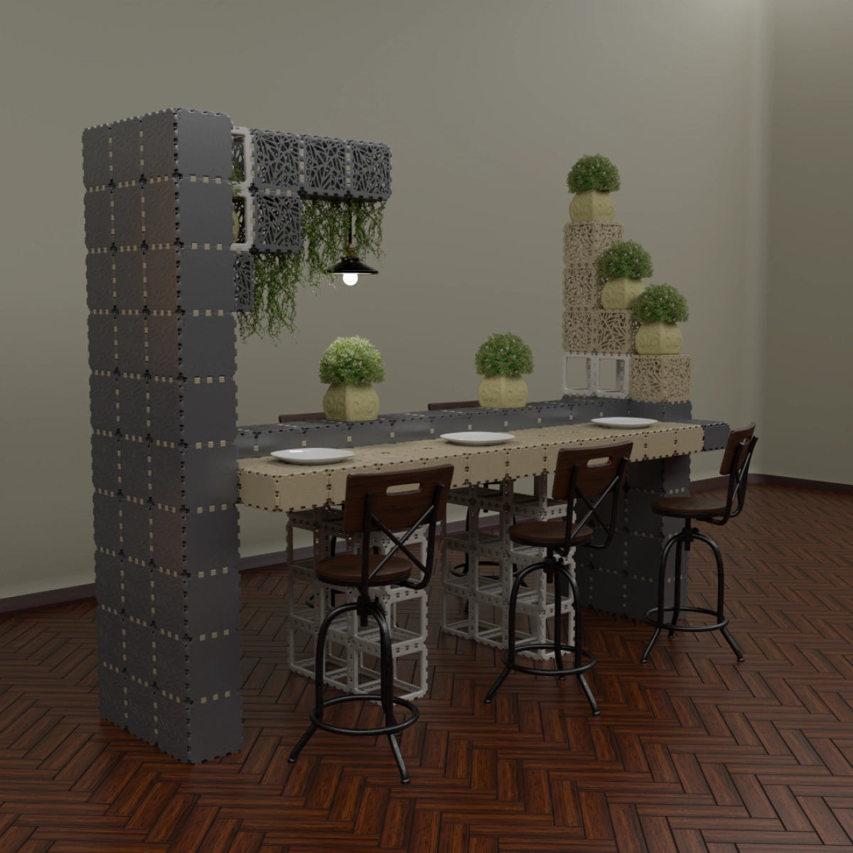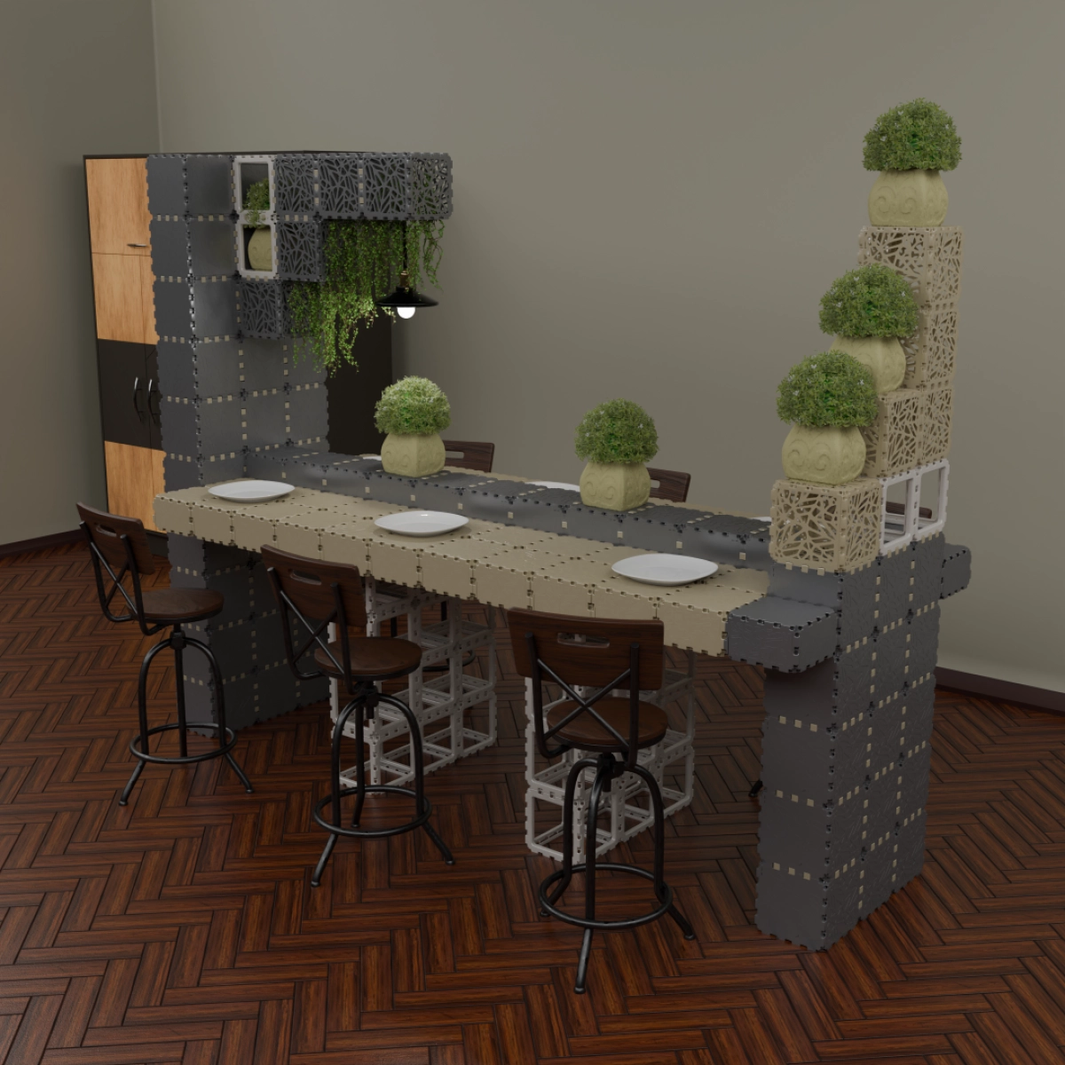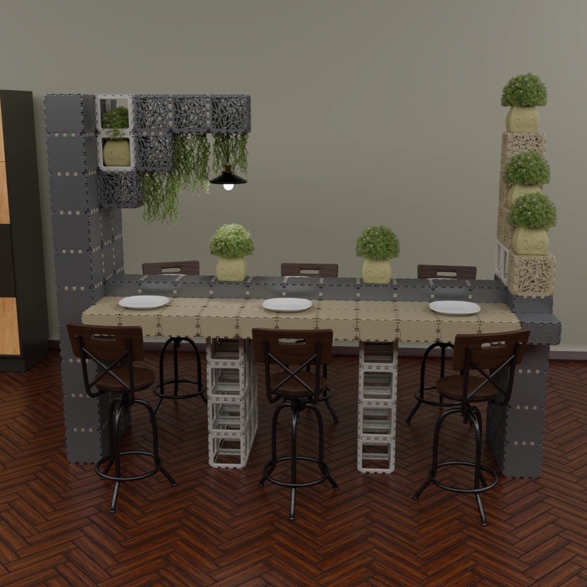 A modular bar-style counter built entirely from our cubes. Provides comfortable seating for several people and includes decorative vertical elements for plants and ambient lighting. The structure is stable, fully modular, and can be reassembled into many other objects if needed