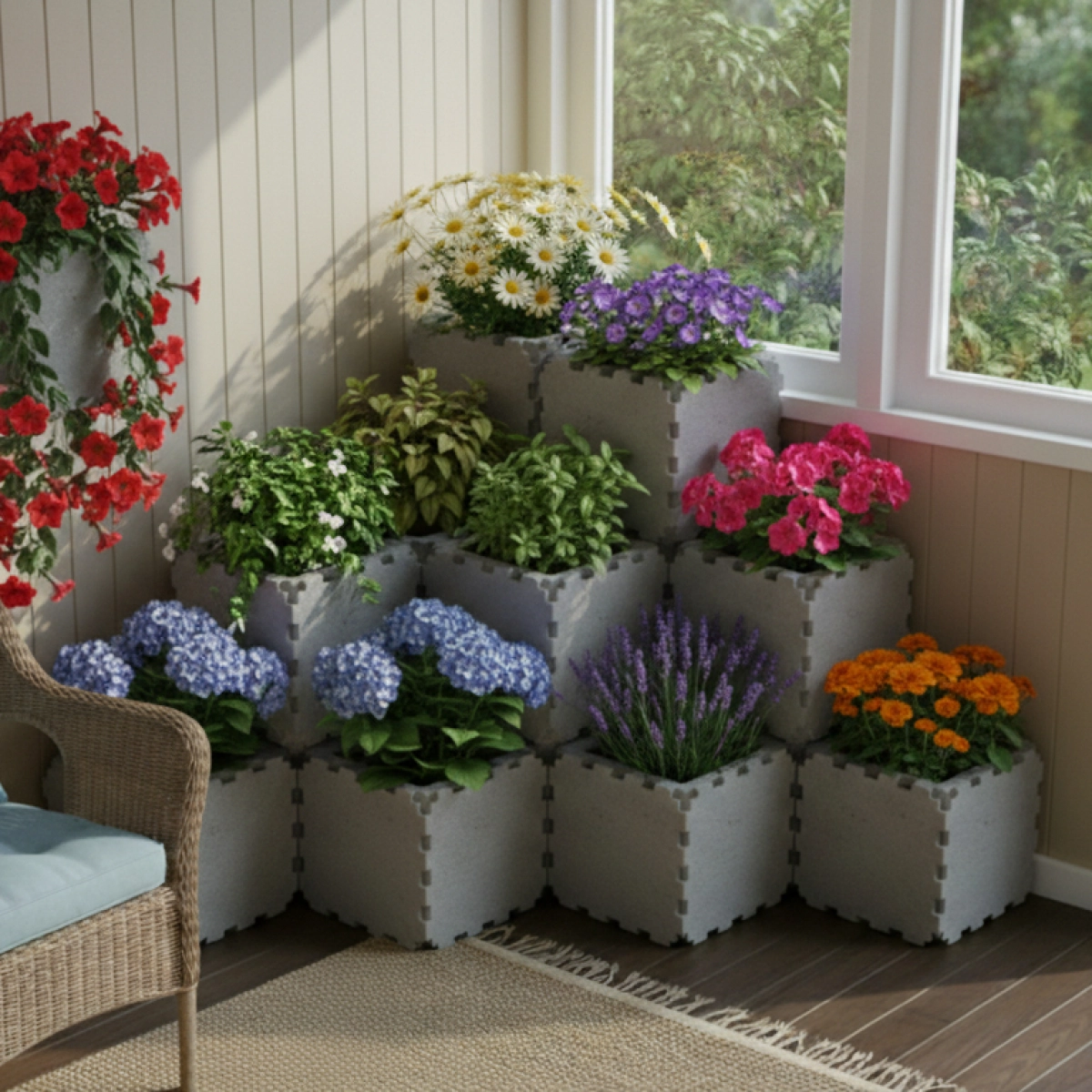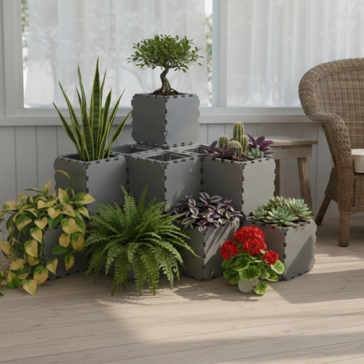 A modern corner modular planter designed to create a beautiful stepped plant композиция in any interior or balcony space. Built from Cubik.one cubes, this structure allows you to grow multiple декоративные plants in one компактный vertical layout while saving floor space.