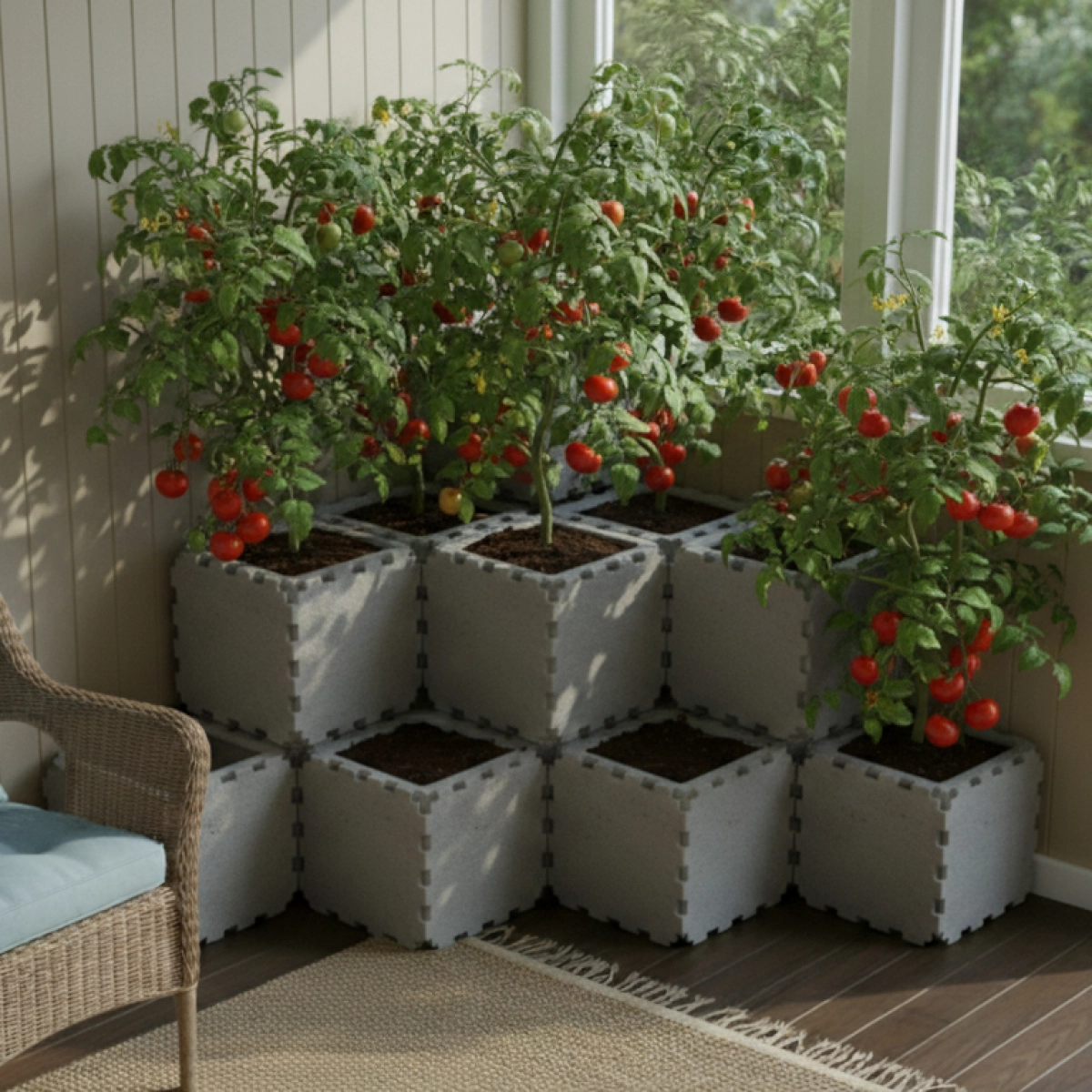 A corner modular planter stand made from Cubik.one cubes, combining a strong solid ZEN core for support and hollow VOID planting modules for свободное and healthy root growth.