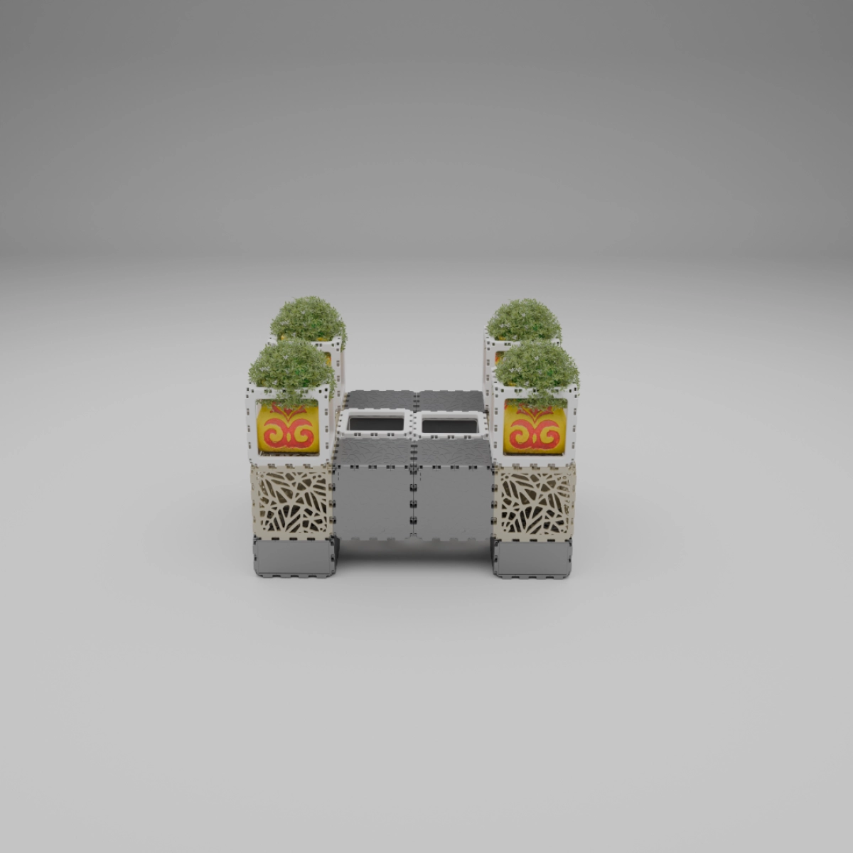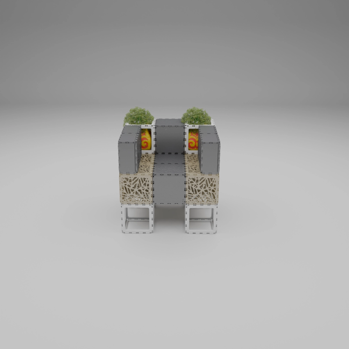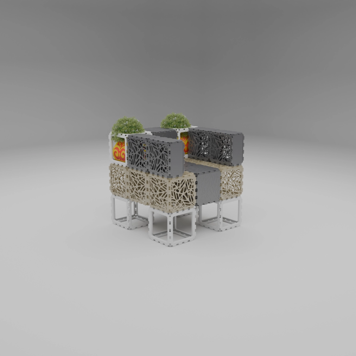 This set allows you to build a variety of objects — from benches and armchairs to decorative compositions with plants. Assembly of any structure takes up to one hour. The examples shown demonstrate just a few possible configurations — the rest depends entirely on your imagination.