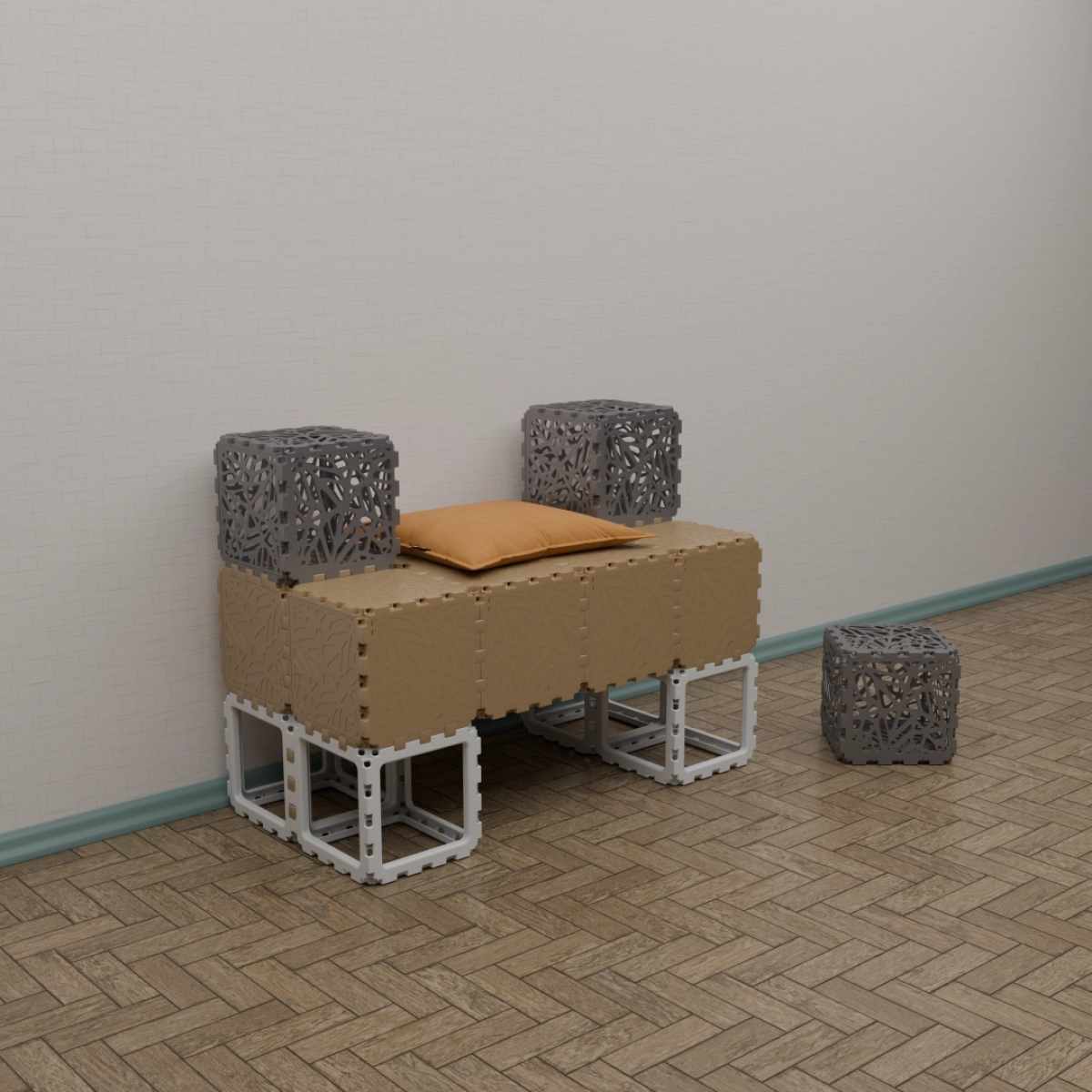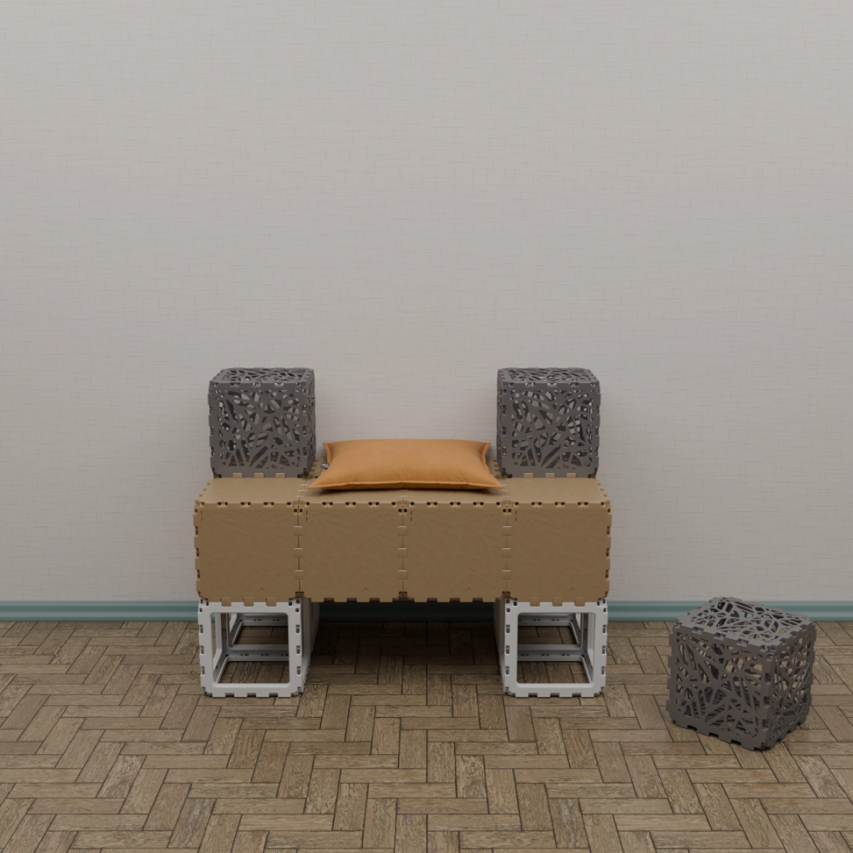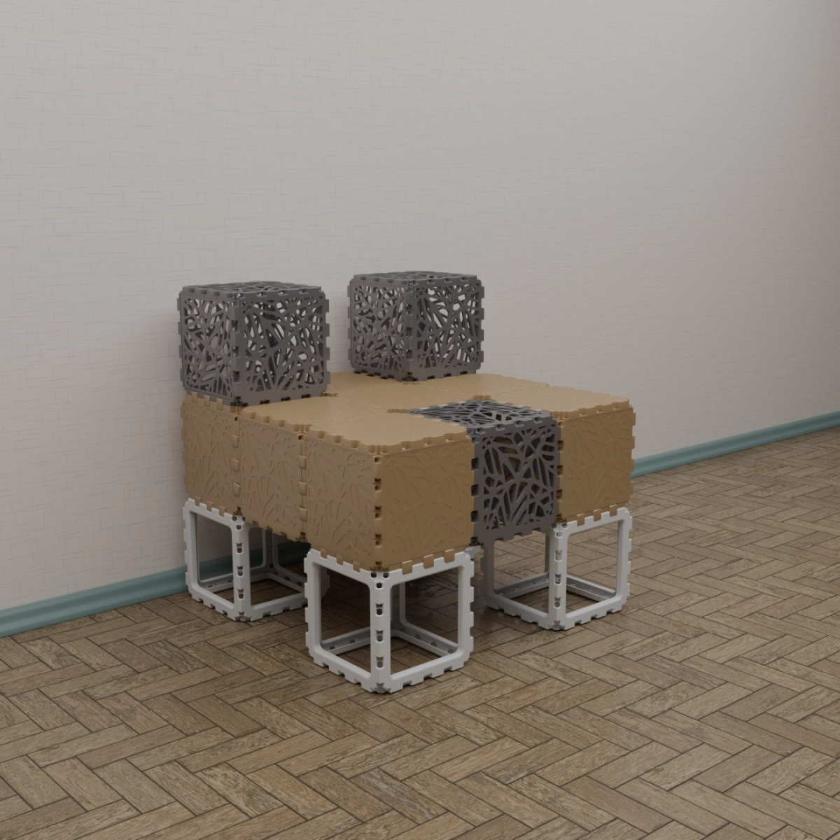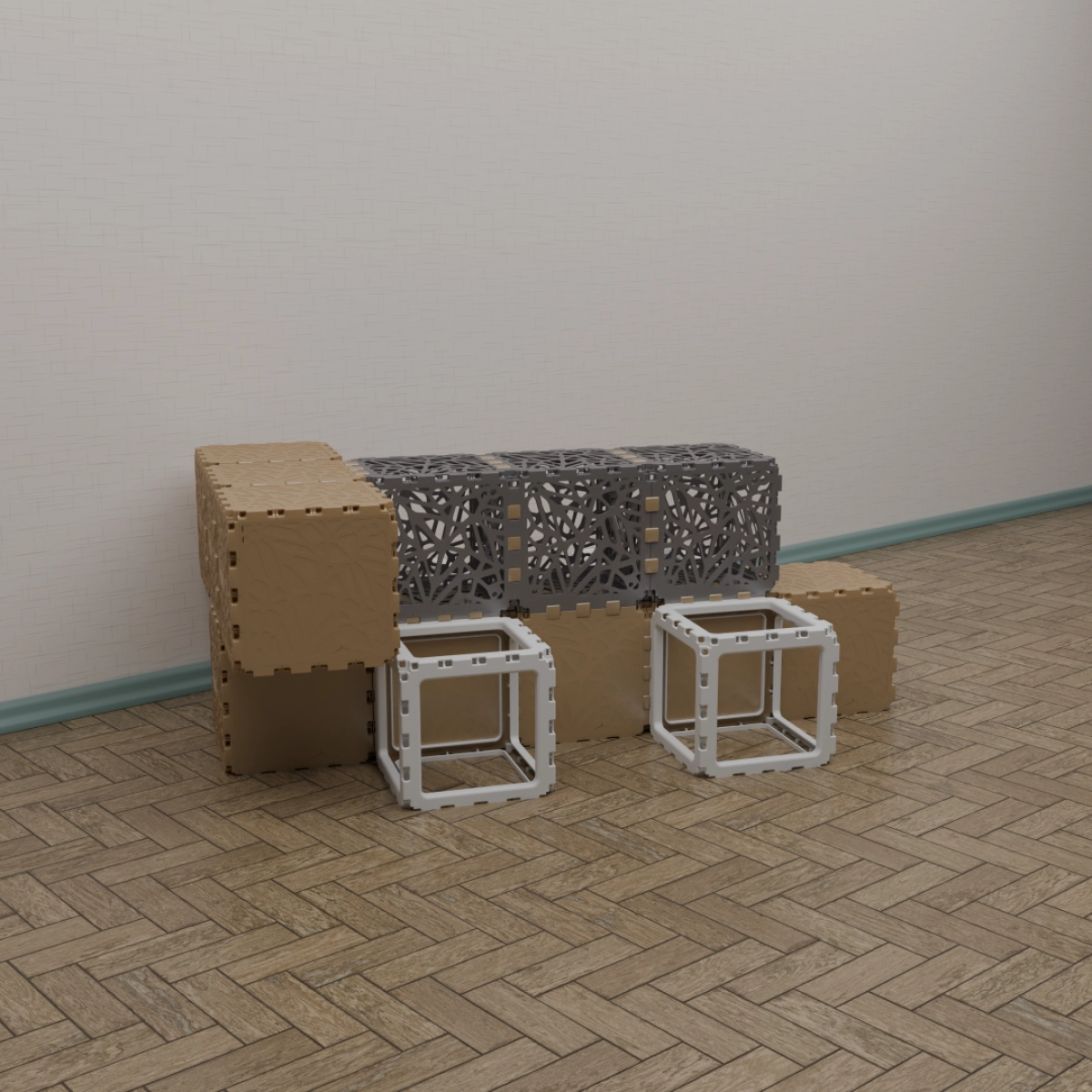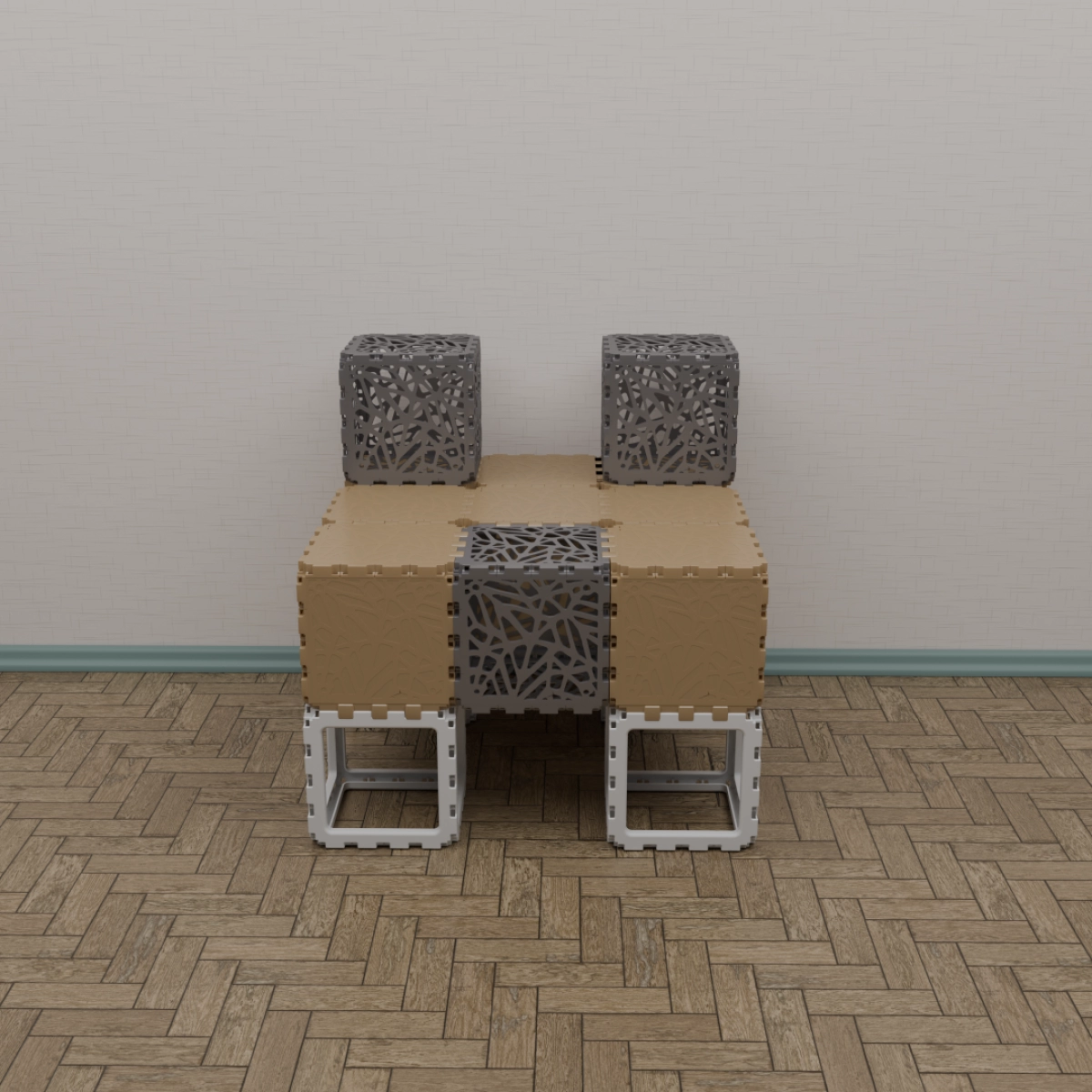 A modular kit that lets you build a variety of functional and decorative objects — from benches and stands to shelves and planters. The photos show only a few examples; your own combinations can be completely different. Each cube connects freely, allowing endless experimentation with shapes and uses. Suitable for both indoor and outdoor creativity. The weight is 15 kg. You can assemble any item within half an hour