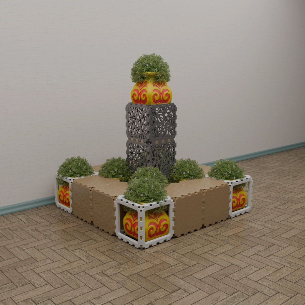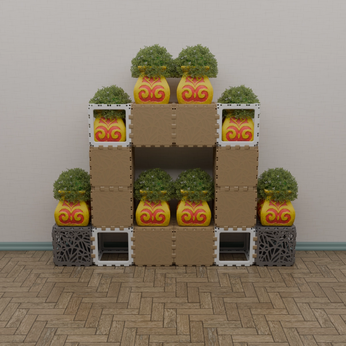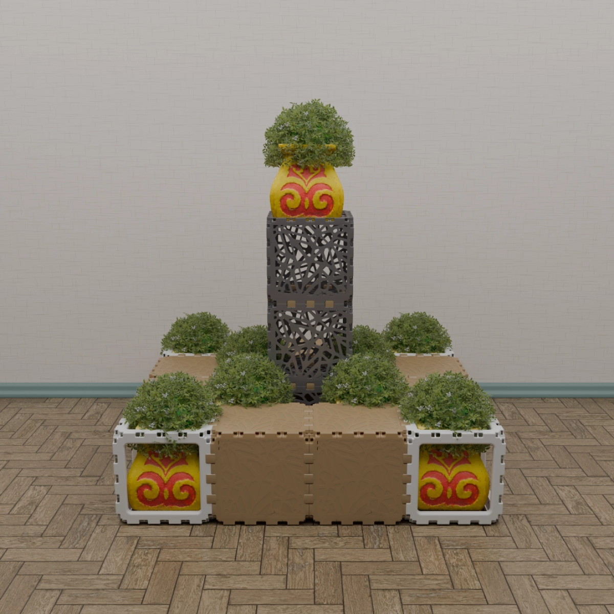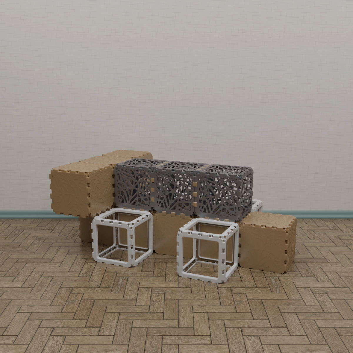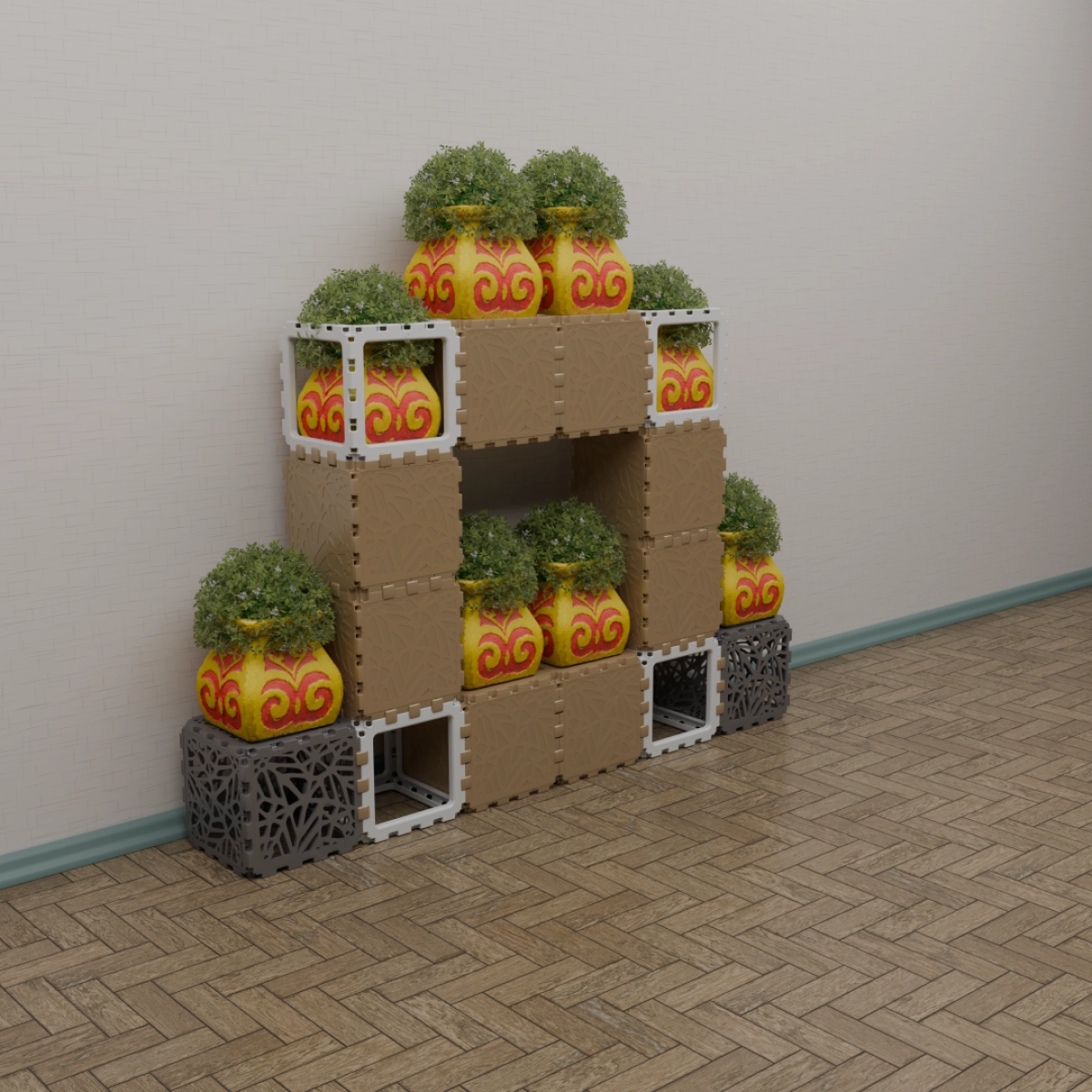 A modular kit that lets you build a variety of functional and decorative objects — from benches and stands to shelves and planters. The photos show only a few examples; your own combinations can be completely different. Each cube connects freely, allowing endless experimentation with shapes and uses. Suitable for both indoor and outdoor creativity. The weight is 15 kg. You can assemble any item within half an hour