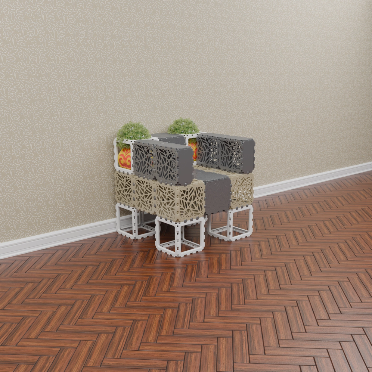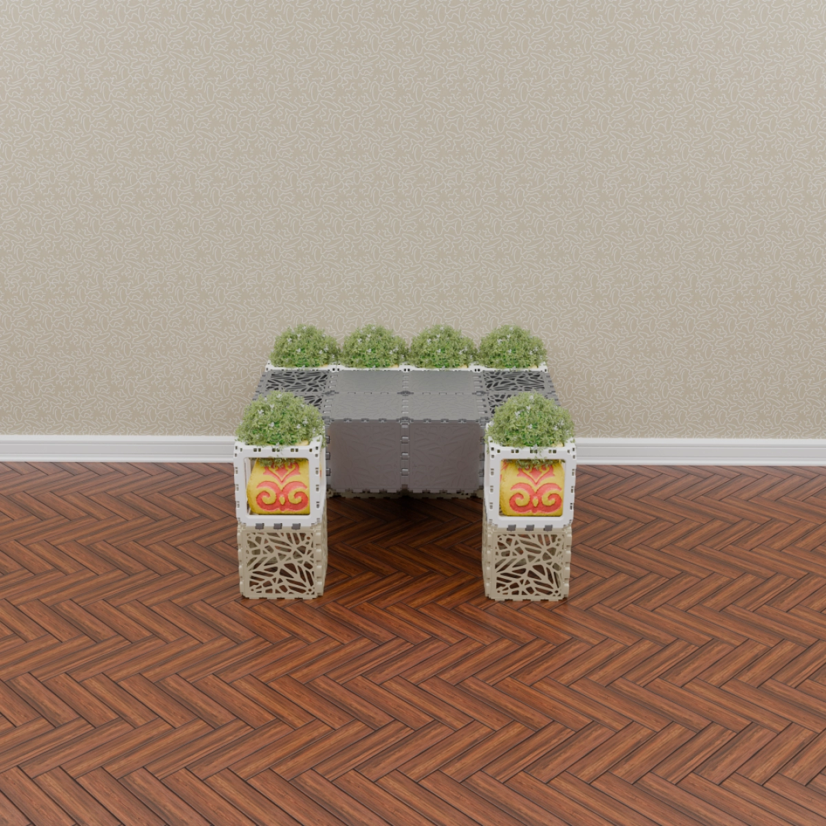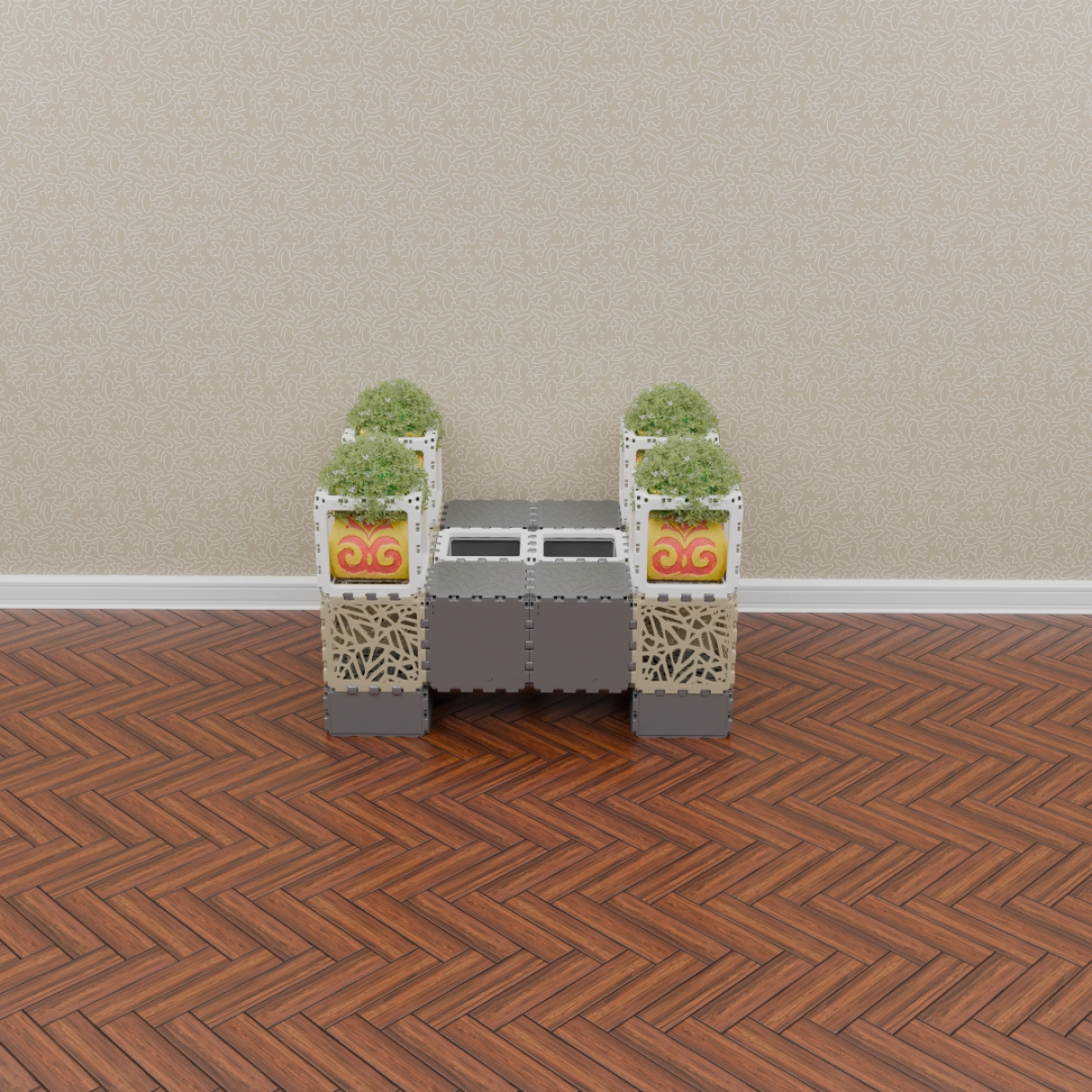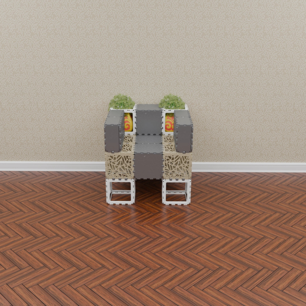 This set allows you to build a variety of objects — from benches and armchairs to decorative compositions with plants. Assembly of any structure takes up to one hour. The examples shown demonstrate just a few possible configurations — the rest depends entirely on your imagination.