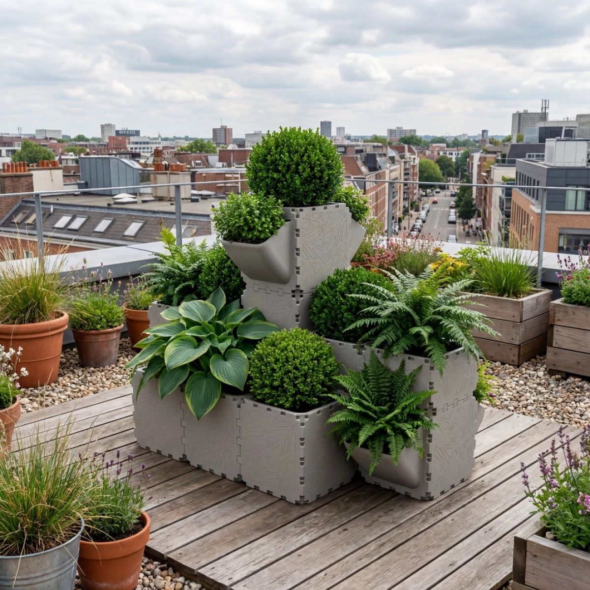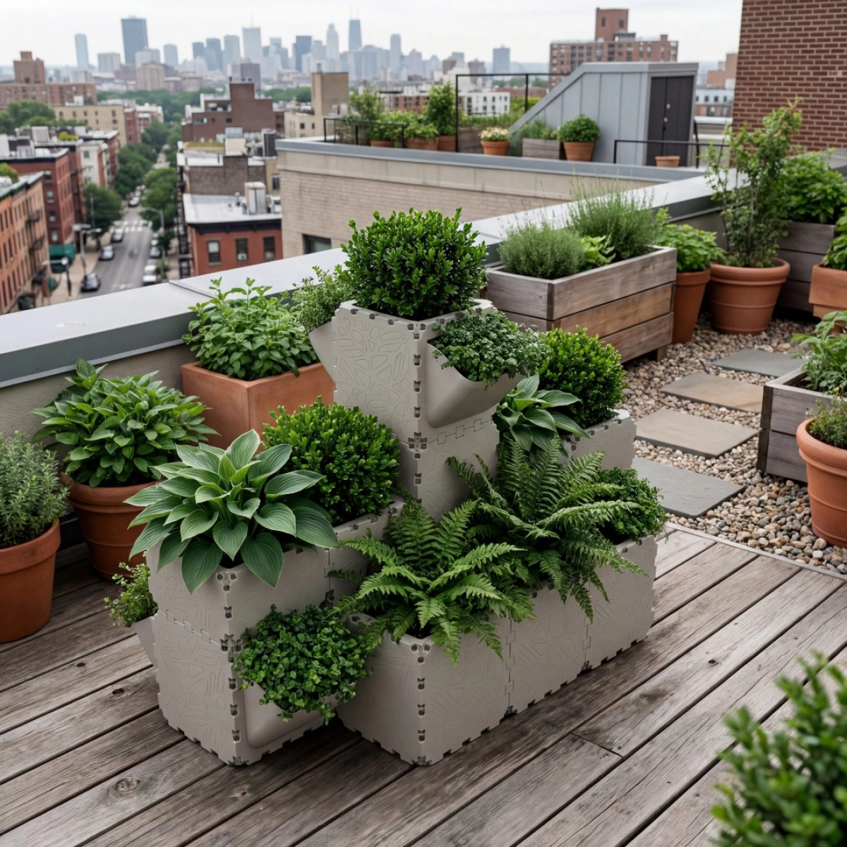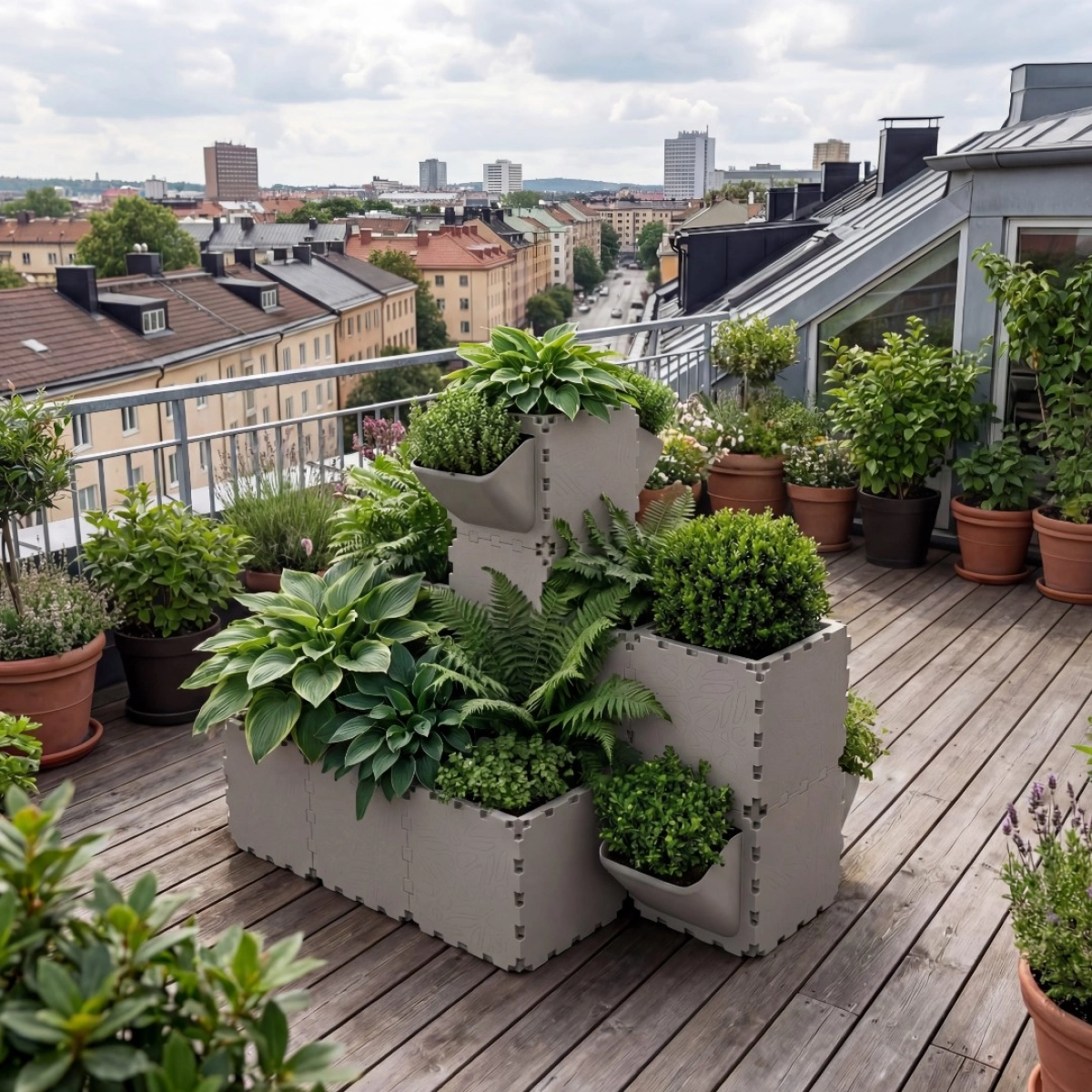The Corner Pyramid Planter is a modular vertical planting system designed to efficiently utilize corner spaces on terraces, balconies, and rooftop gardens.