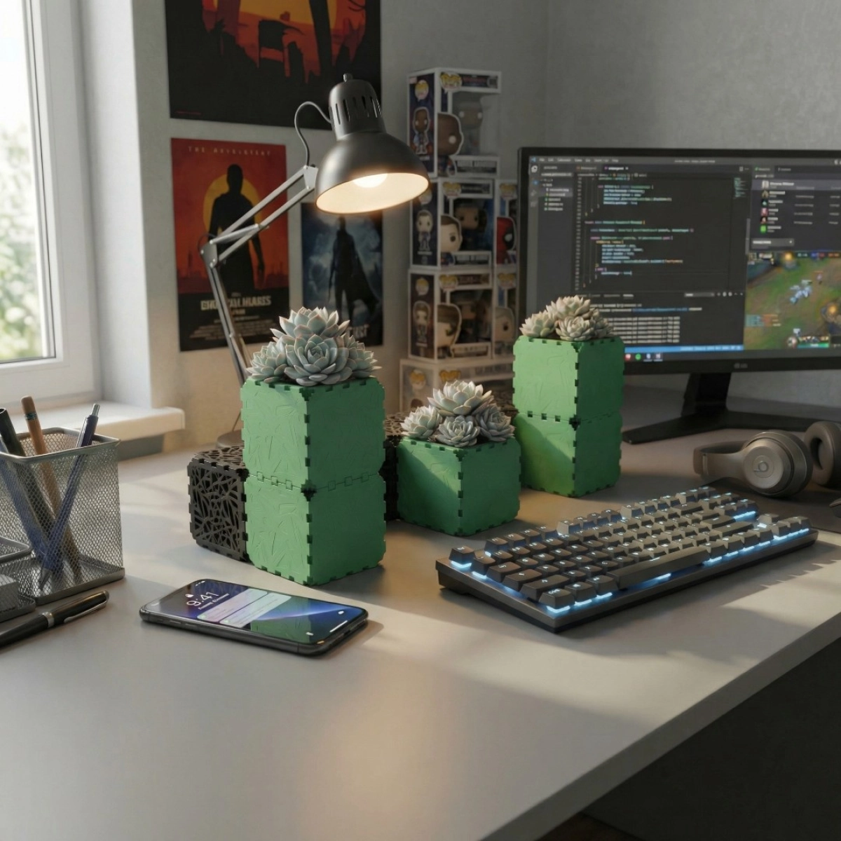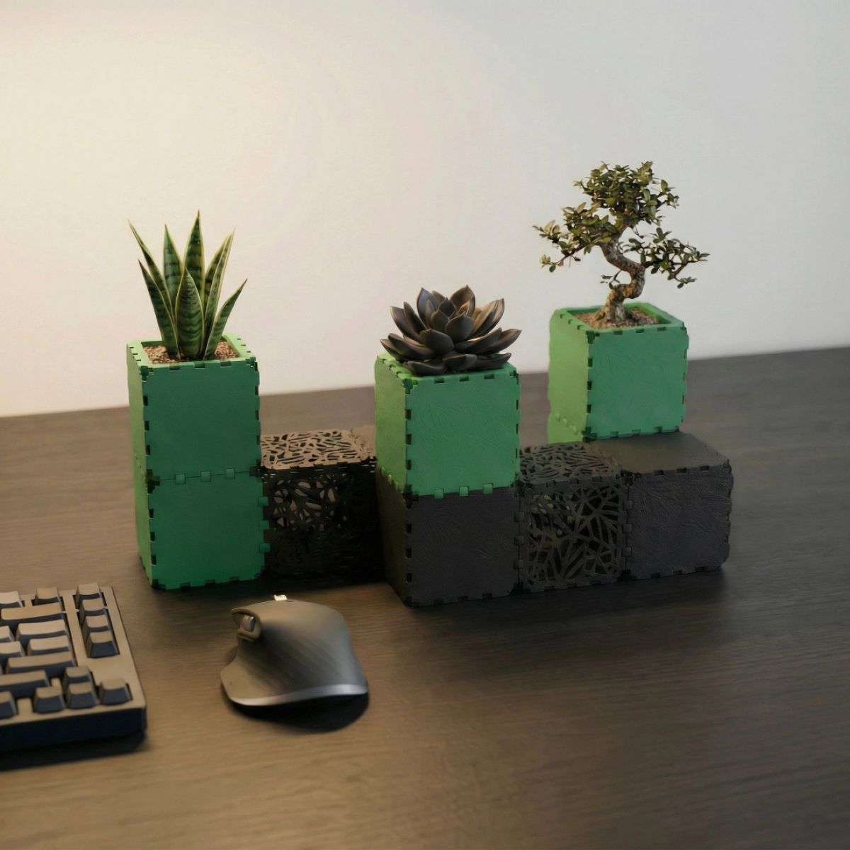 A modular set of 10 mini cubiks designed to create flexible planter configurations in small spaces. The clean geometric modules can be aligned, stacked, or arranged into stepped and corner compositions to suit any layout. Easily reassemble and expand the system as your plants grow or your space changes. Ideal for succulents, herbs, and compact houseplants on desks, shelves, and window sills.