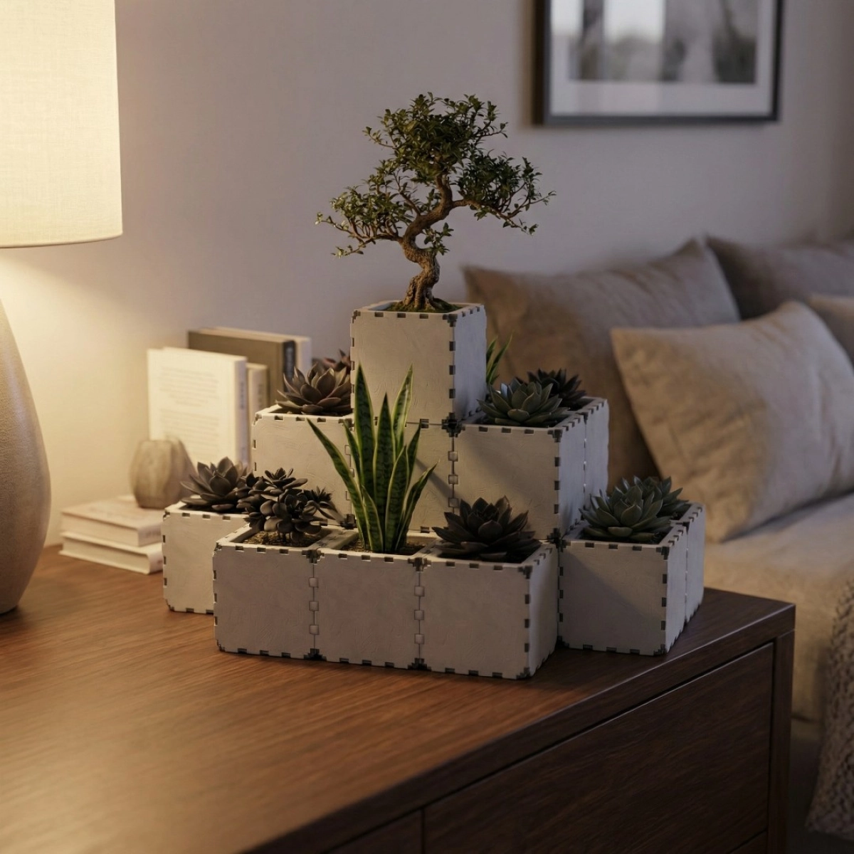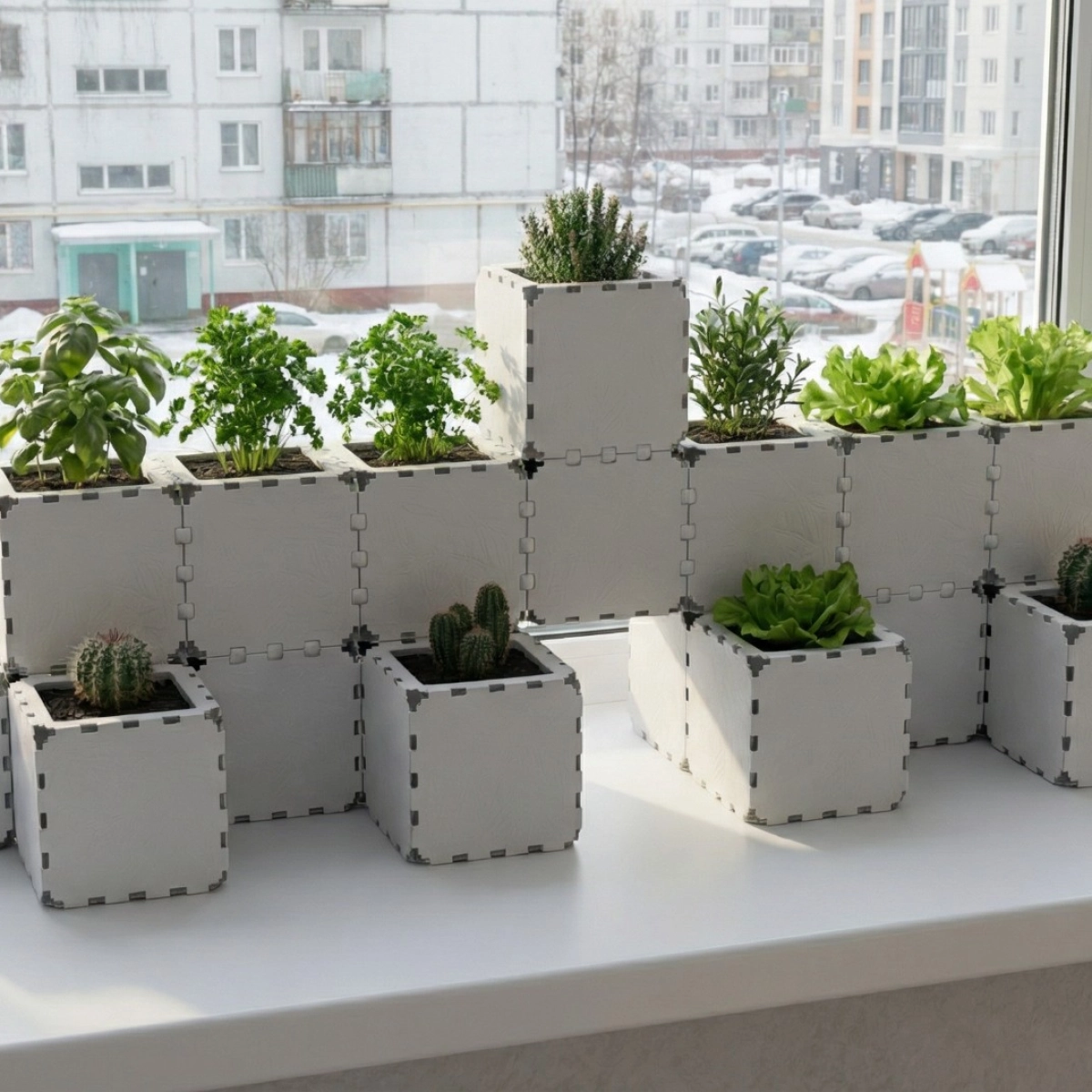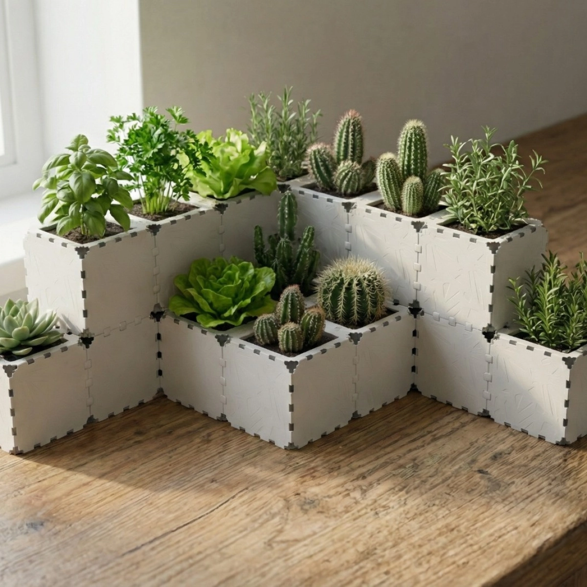 A modular set of 20 mini cubiks designed for creating larger and more expressive planter compositions in compact interiors. The clean cubic modules can be arranged into linear systems, stepped structures, corner layouts, or multi-level green displays. Reconfigure, expand, and adapt the composition as your plant collection grows. Ideal for succulents, herbs, and small houseplants on shelves, window sills, countertops, and workspaces.