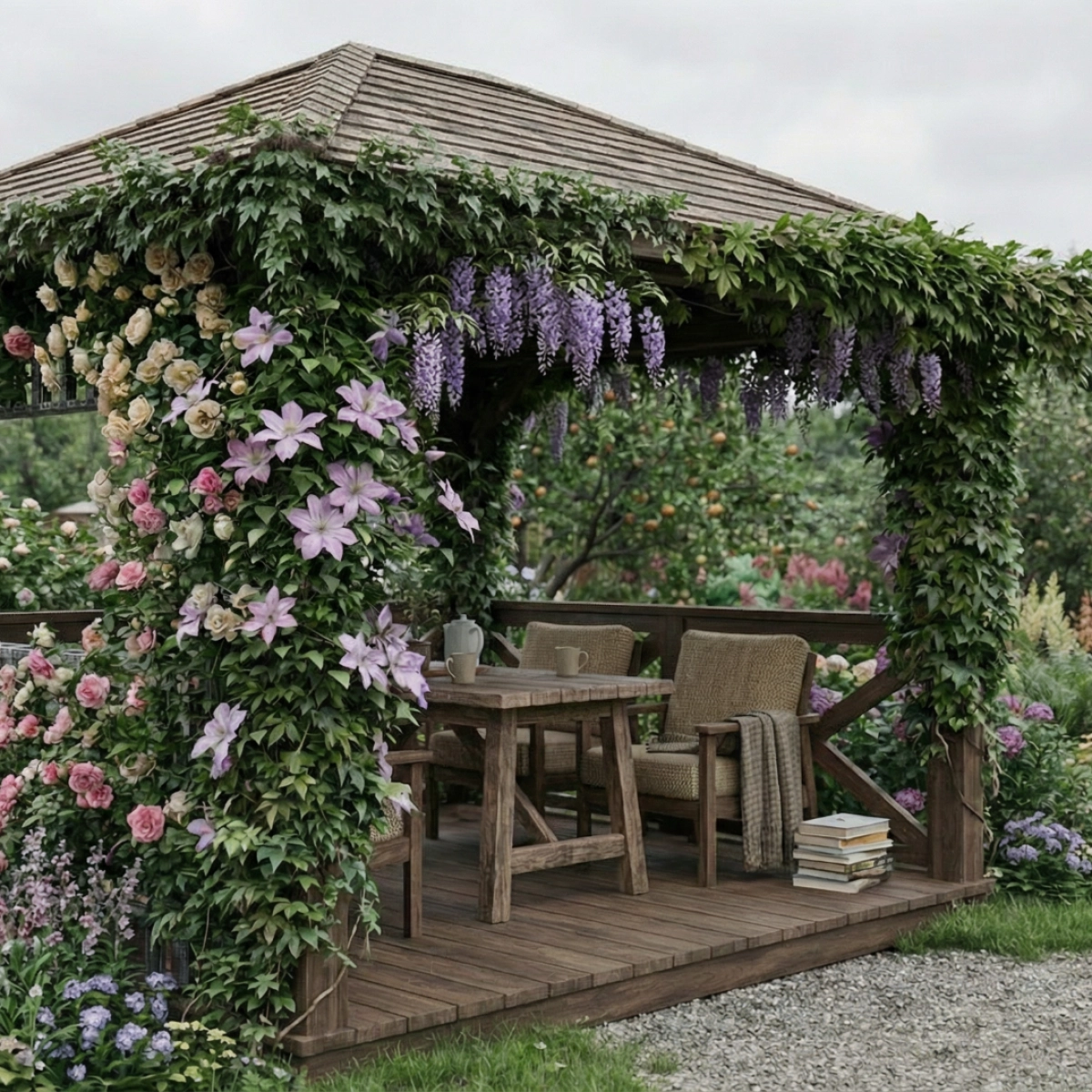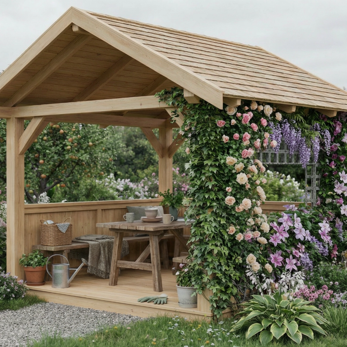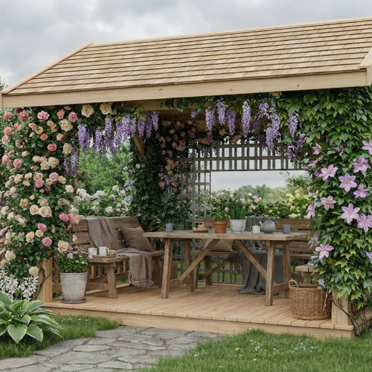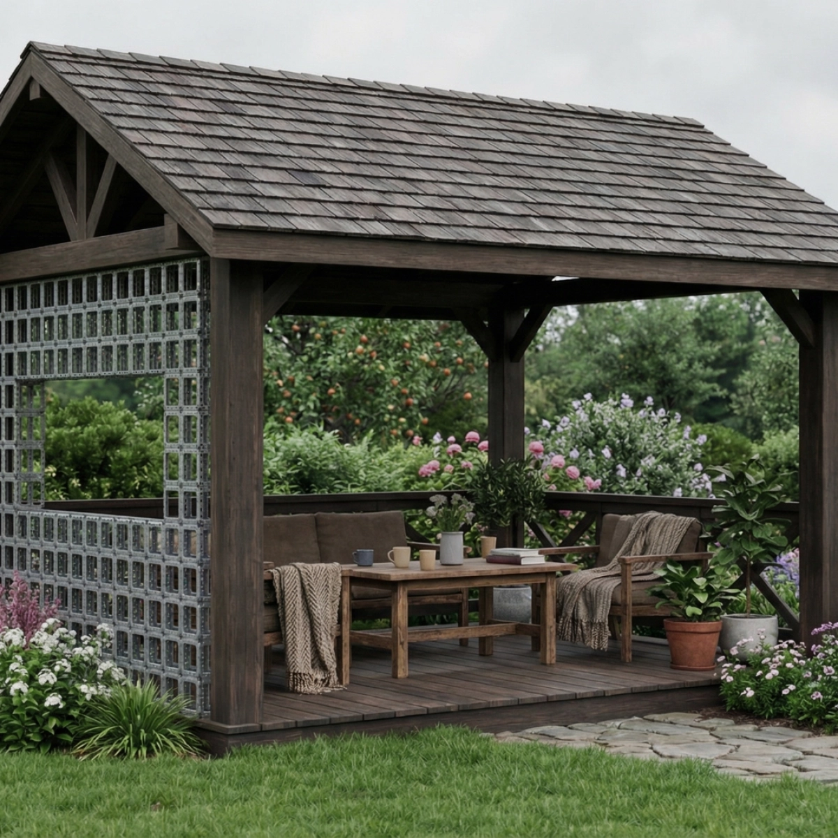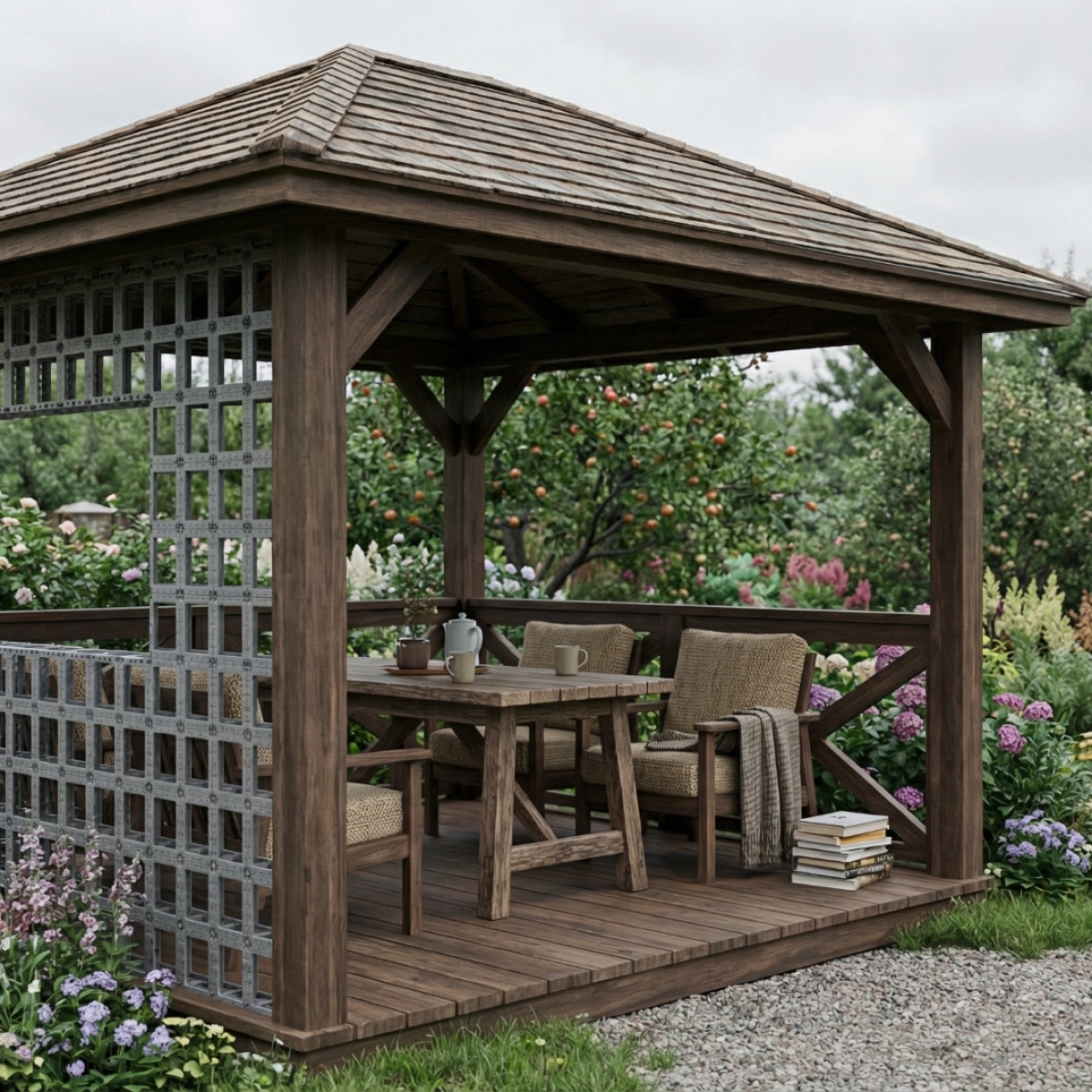 The wooden structure is complemented by trellis panels that can remain open or be gradually covered with climbing plants, transforming the pavilion into a green, sheltered space. Suitable for relaxation, dining, or quiet work in a private garden, seamlessly blending architecture and nature.