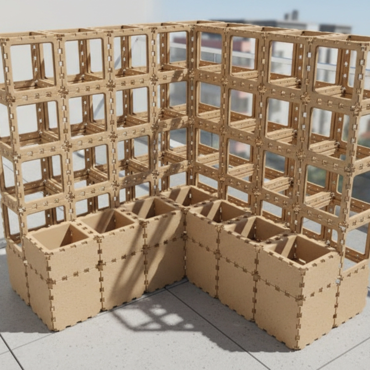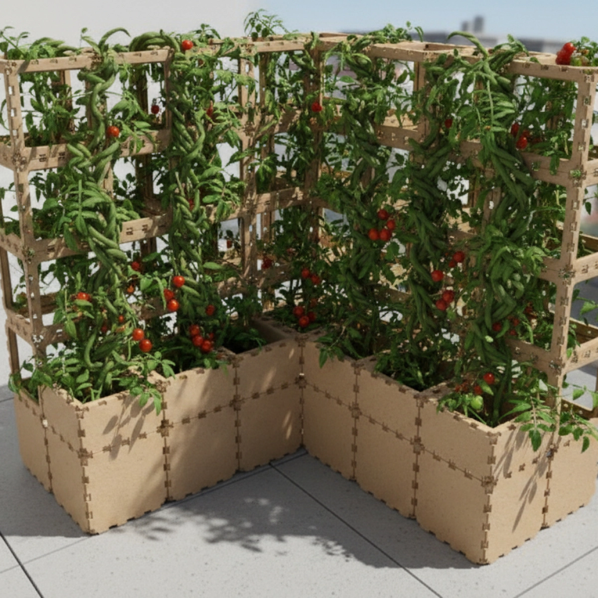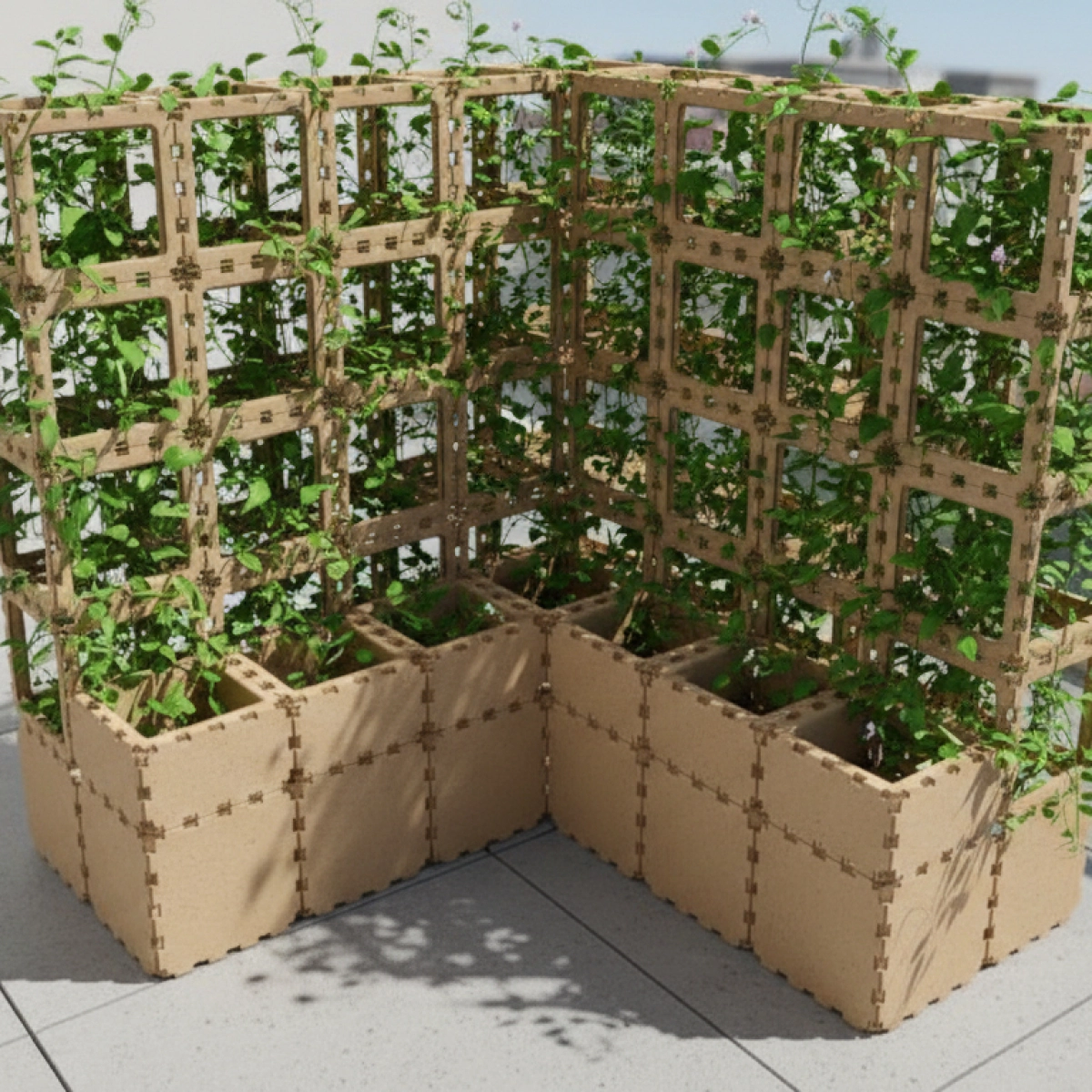 This modular corner stand is designed for vertical greenery and climbing plants. The lower solid cubes form stable planters, while the upper open-frame structure creates a lightweight support system for vines to grow and intertwine naturally.