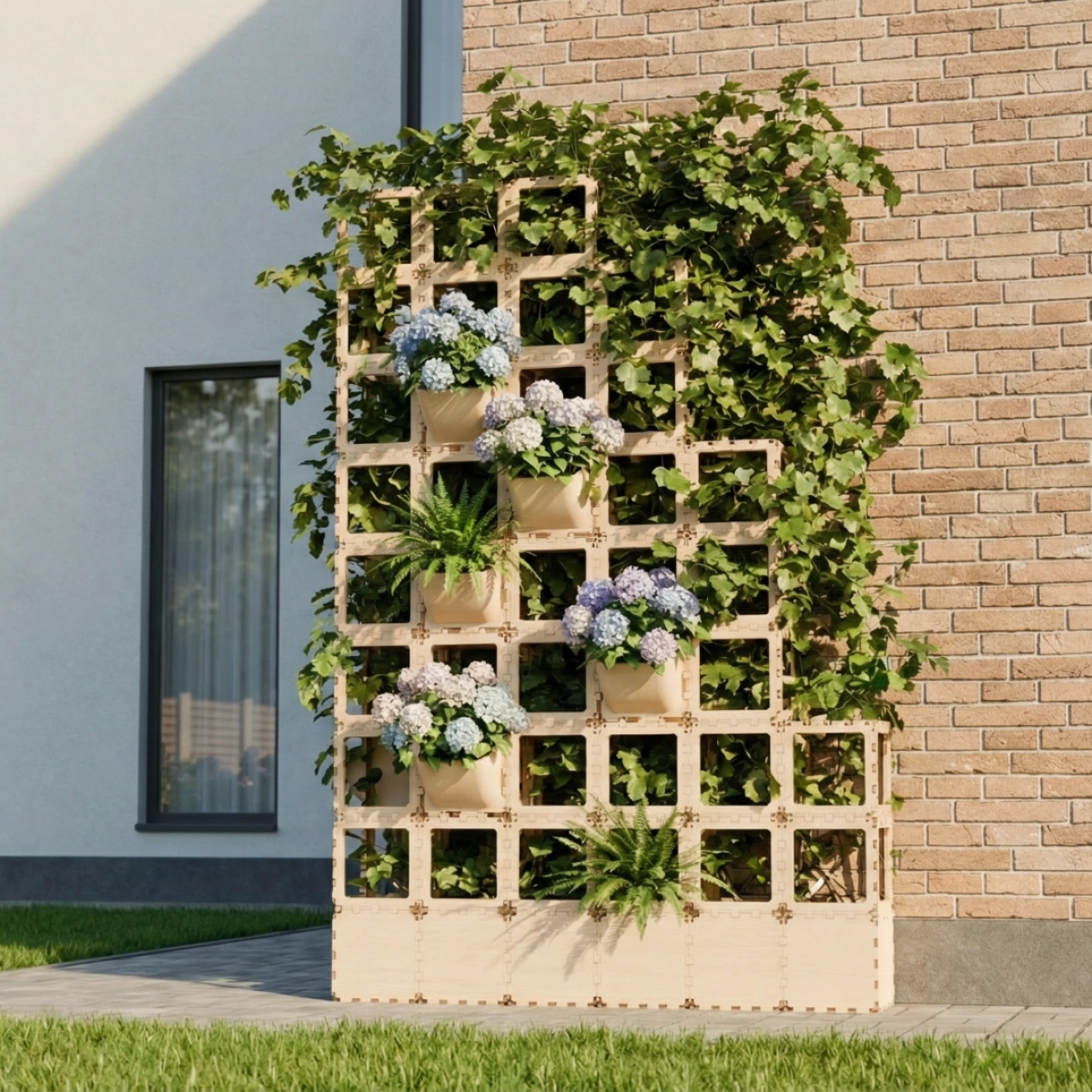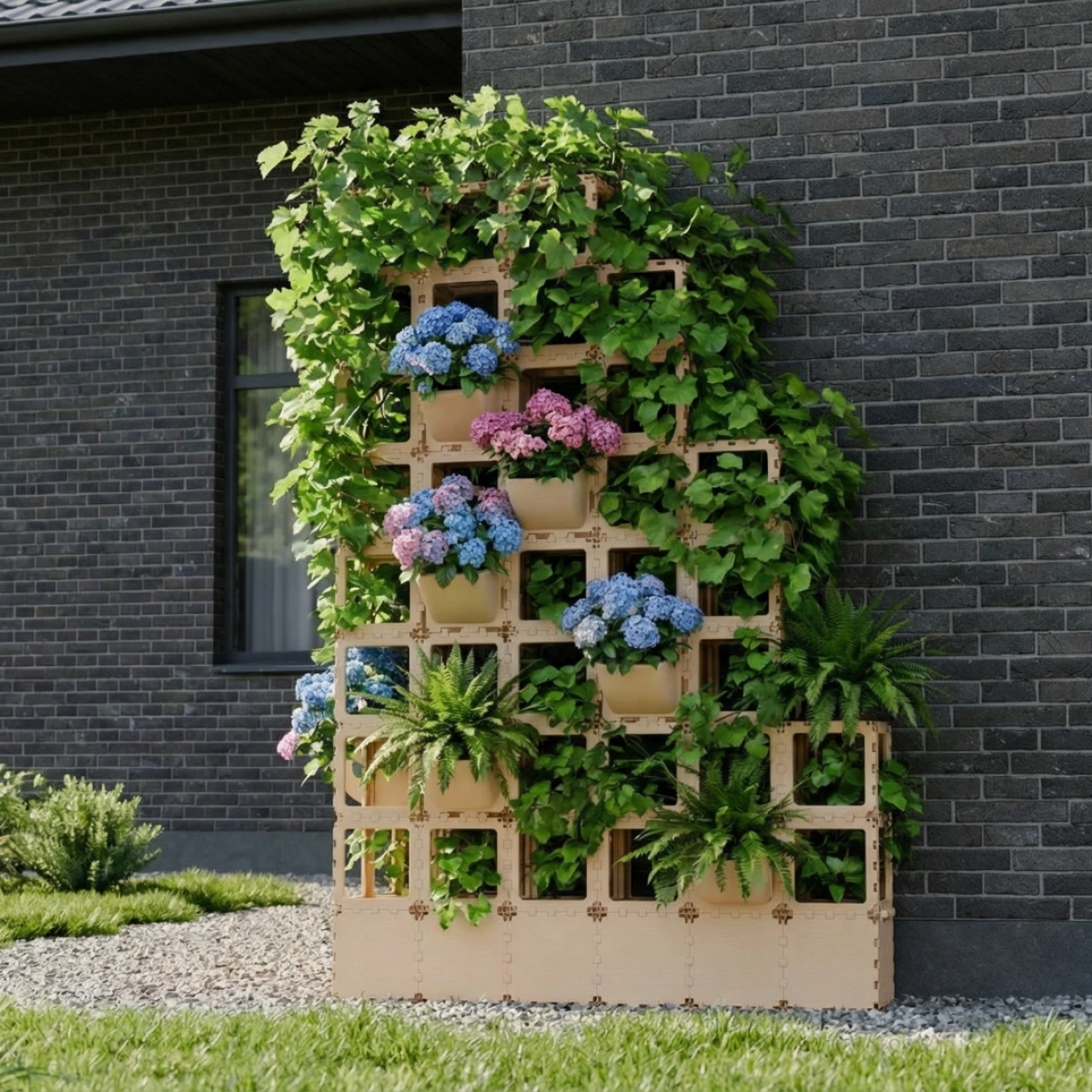 Flora's decorative panels create a dense, multi-layered green facade, while the structure supports flowers, climbing plants, and ornamental greenery. The vertical layout allows for a full-fledged courtyard garden without taking up much space, making it ideal for modern residential architecture. Designed for year-round outdoor use.