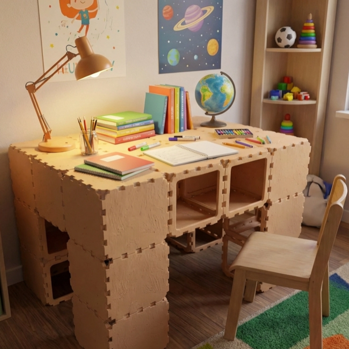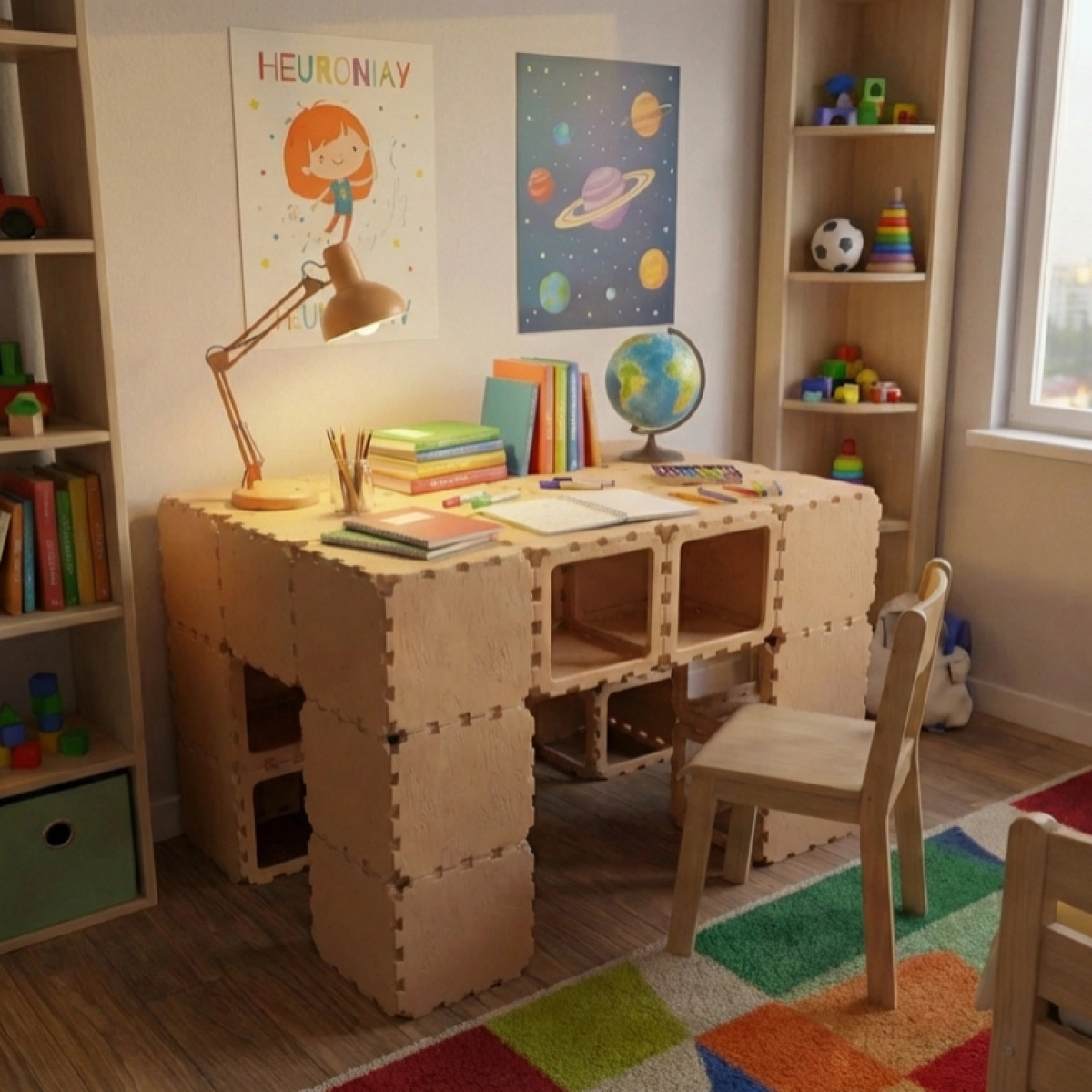 A safe and functional desk for a child’s room, built from durable modular Cubik.one cubes. Perfect for studying, drawing, reading, and everyday play. The structure is stable, has no sharp corners, and looks clean and modern.