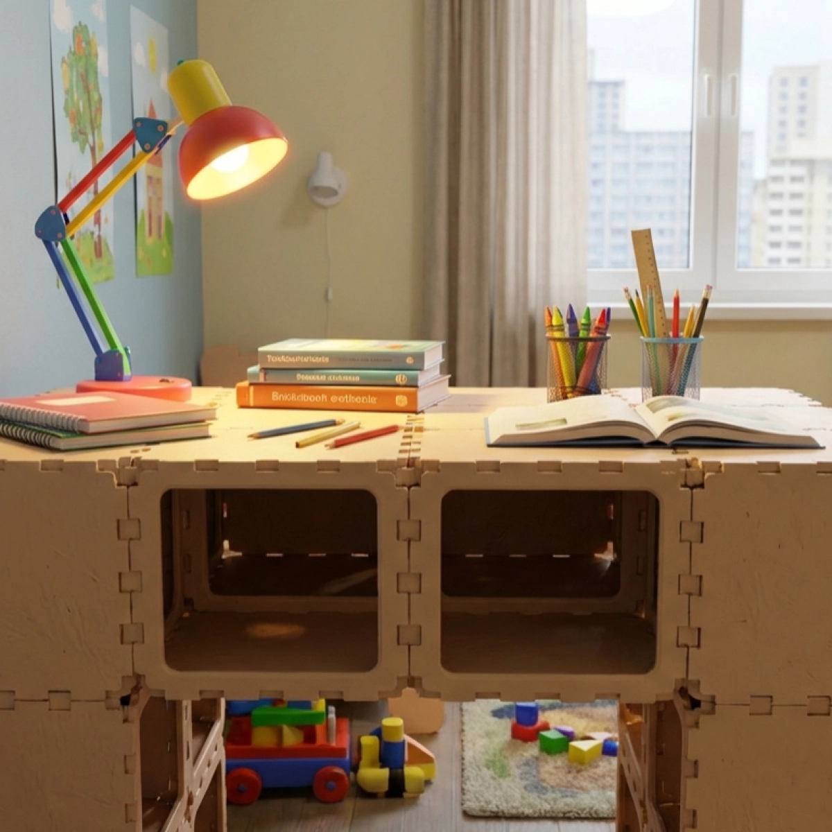 Modular kids desk made from durable Cubik.one cubes. Safe, stable, and perfect for studying, drawing, and creative activities in any child’s room or play area.