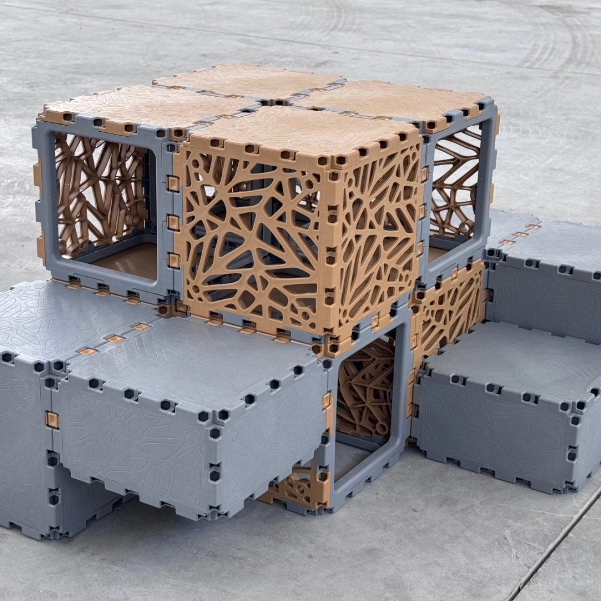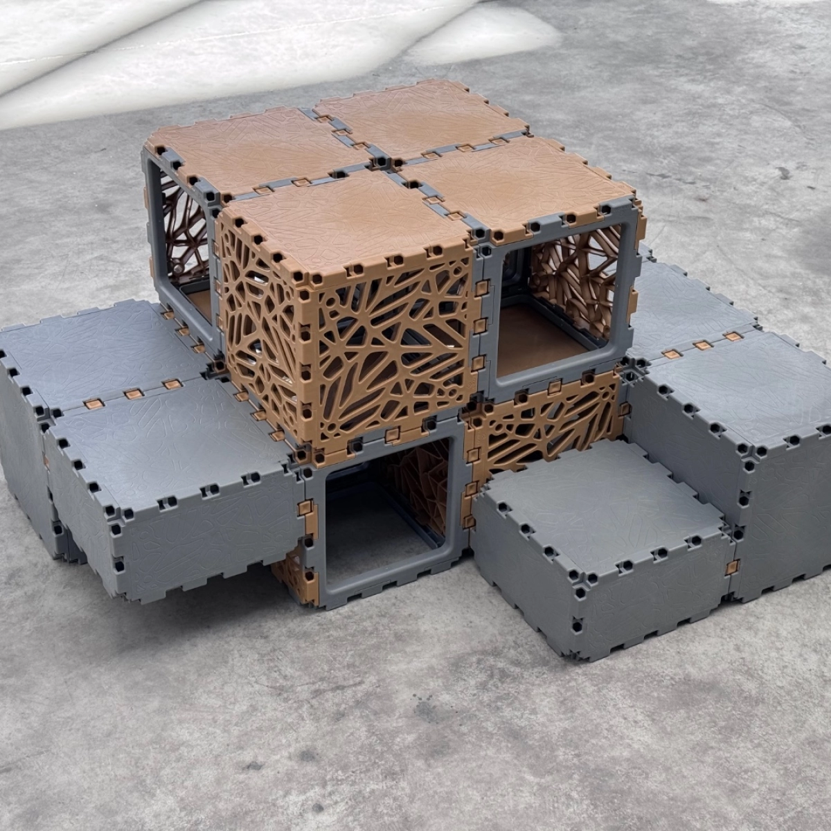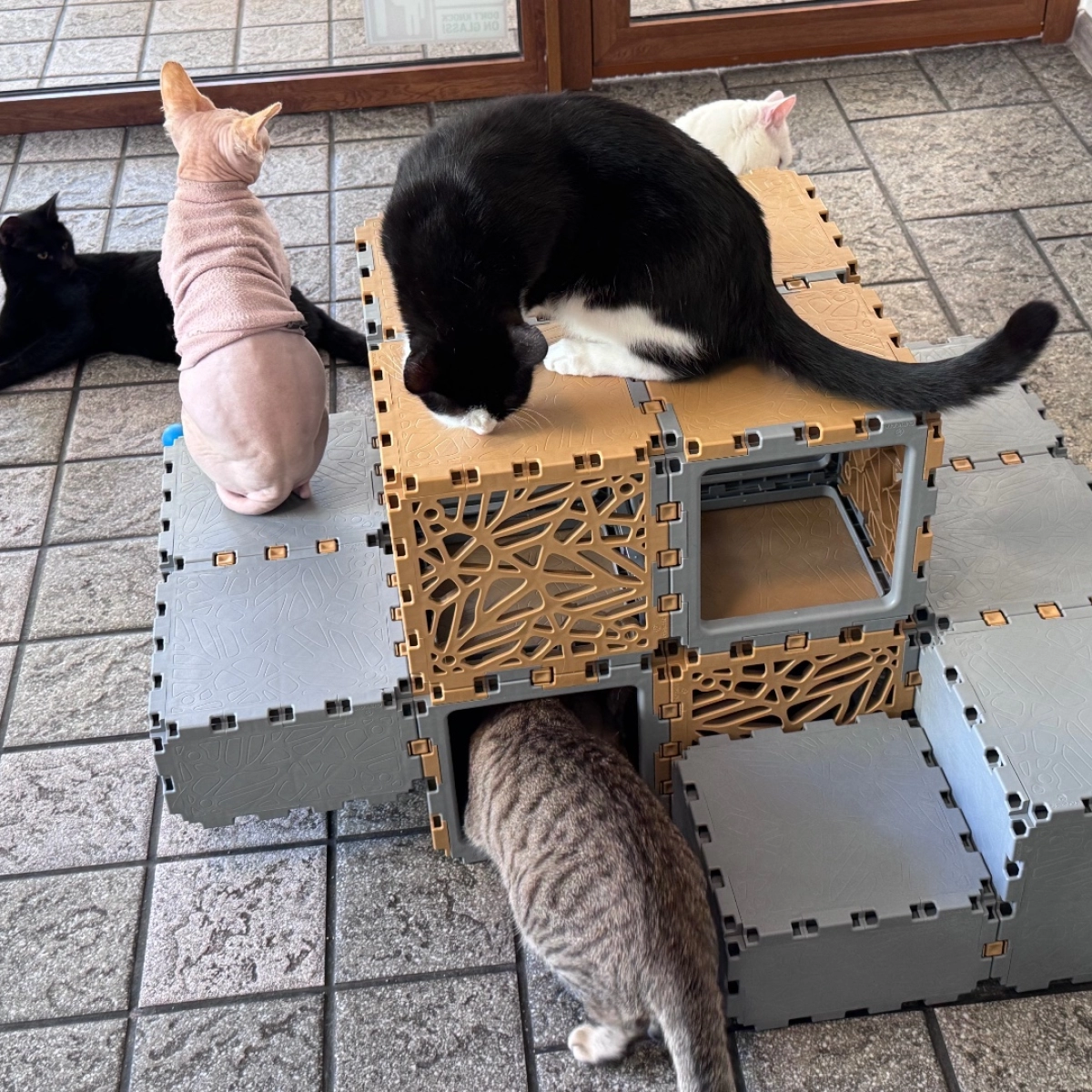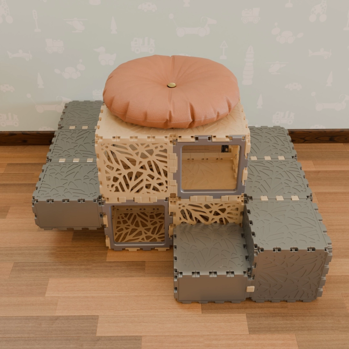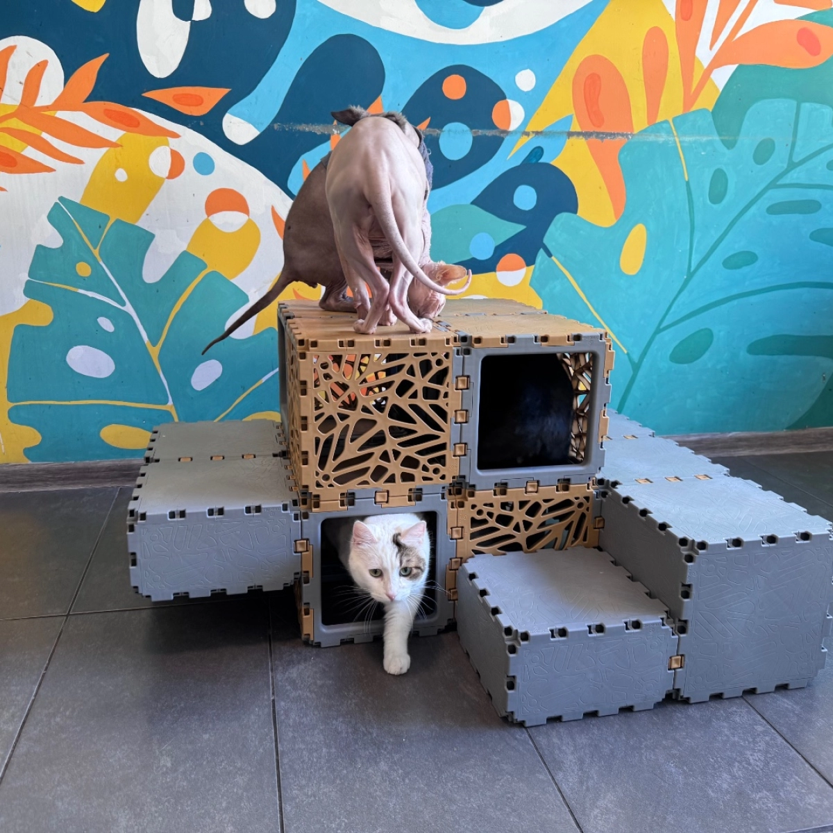 A playful modular structure built from Cubik.one cubes, designed for cats and small pets. It offers spaces to climb, hide, and rest, while doubling as a decorative element for home or studio. The setup shown is just one example — modules can be rearranged or expanded to suit any space and your pet’s curiosity.