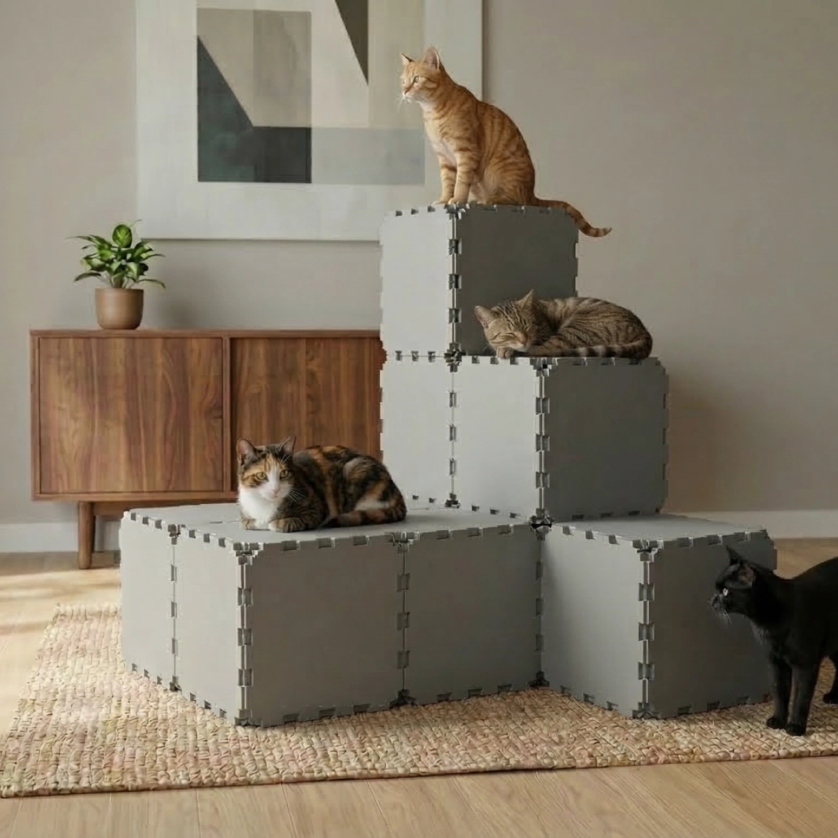 A clean and solid modular cat house made entirely from ZEN panels. Designed for those who value aesthetics and simplicity, it offers a stable, enclosed space perfect for rest and спокойного отдыха. Easy to assemble and visually minimal, it fits seamlessly into modern interiors while providing a cozy spot your cat will enjoy.