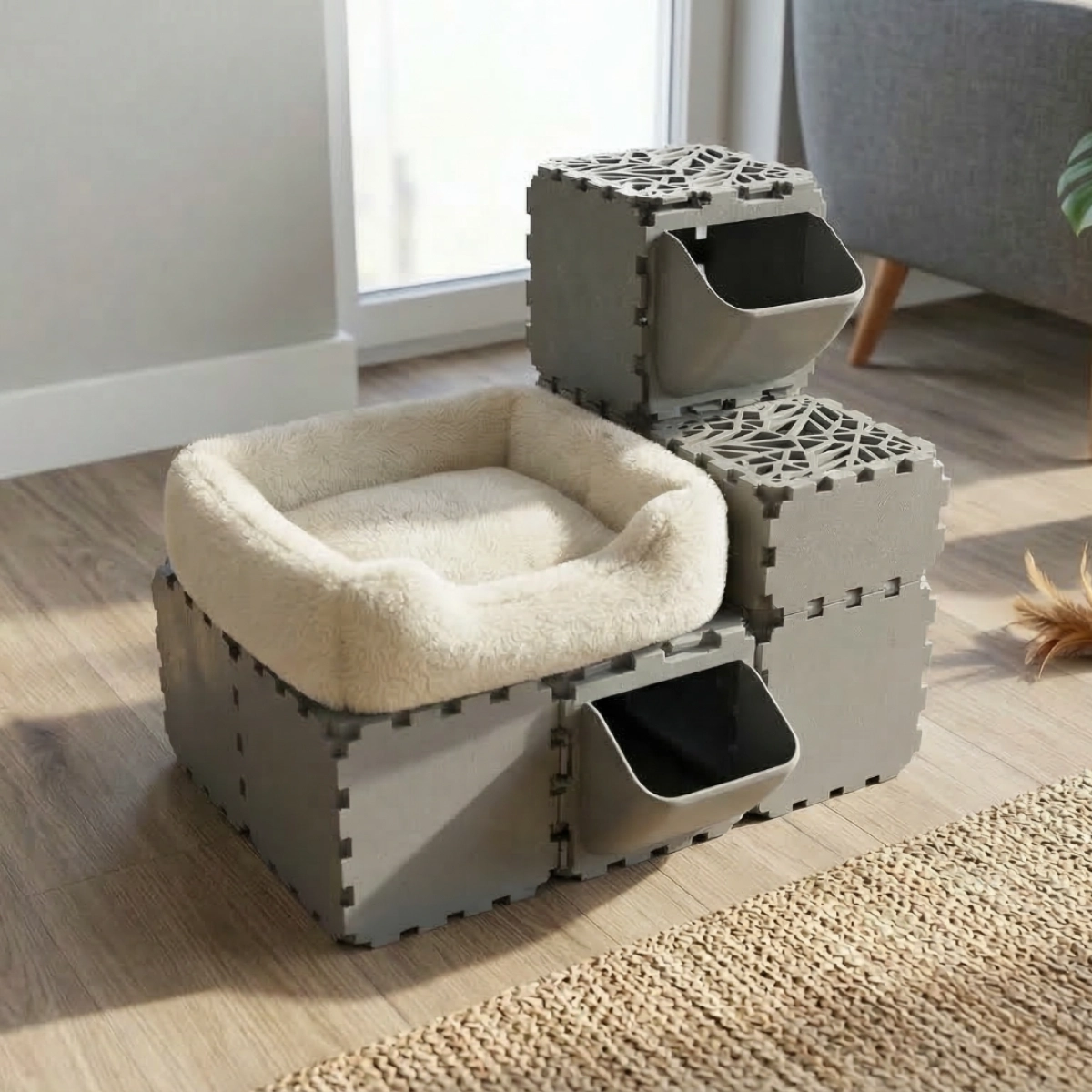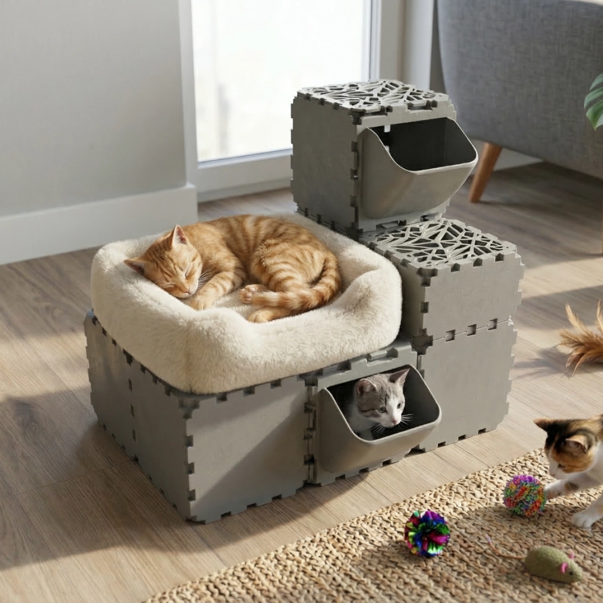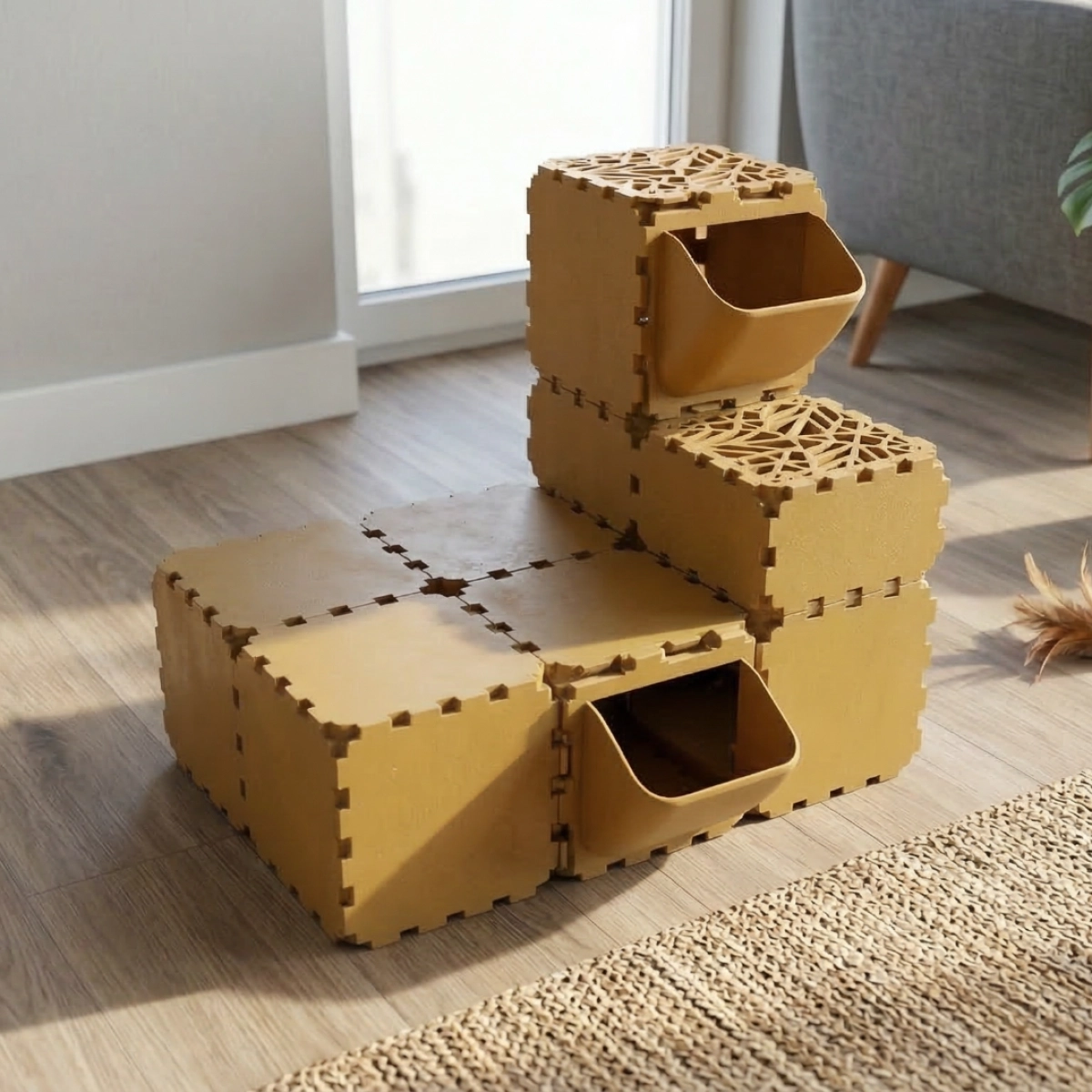A modular cat play house where FLORA panels are used as entrances and exits