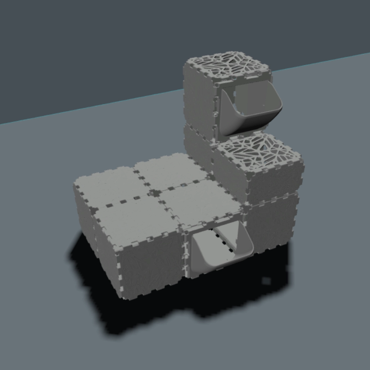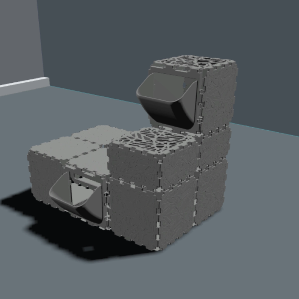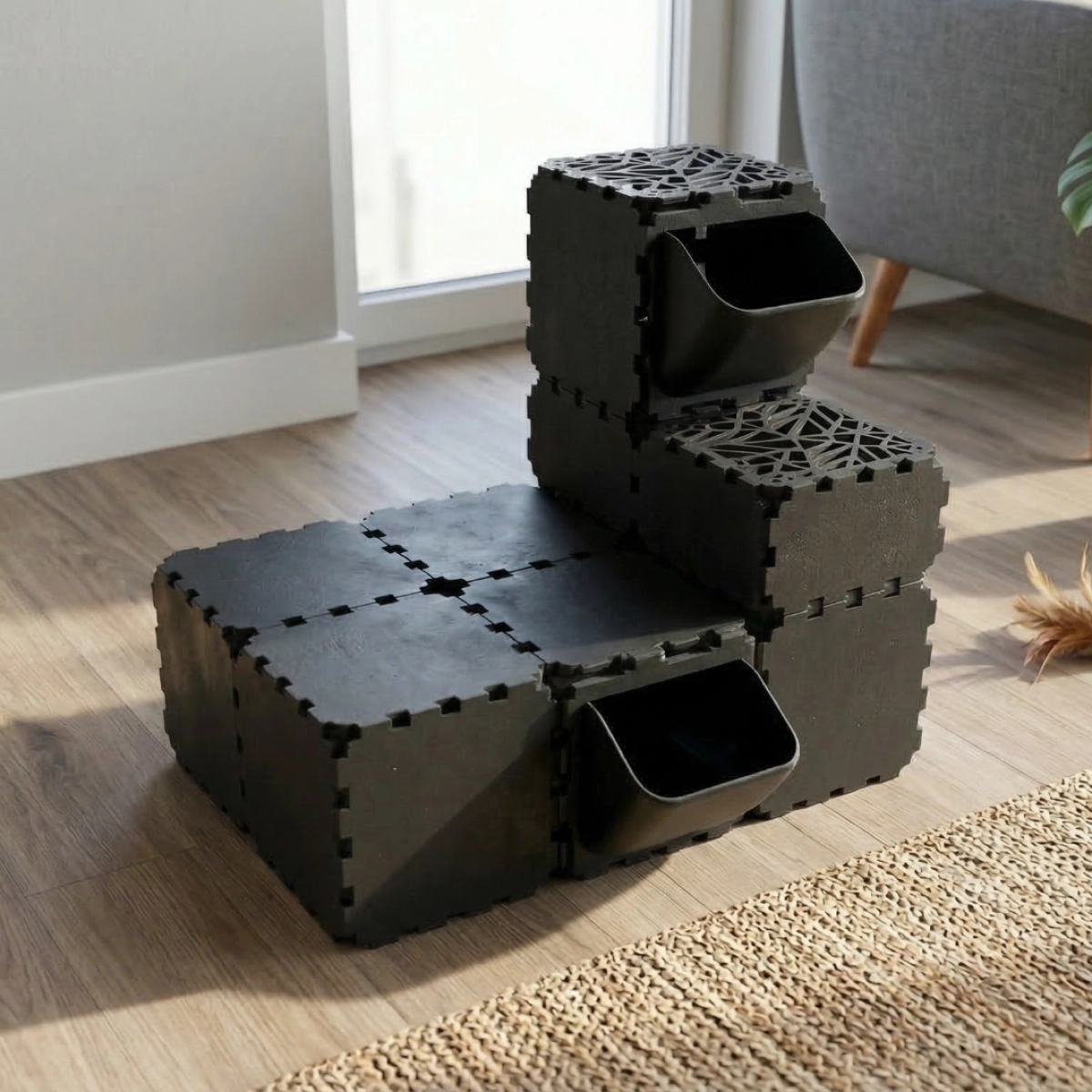 A modular cat play house where FLORA panels are used as entrances and exits