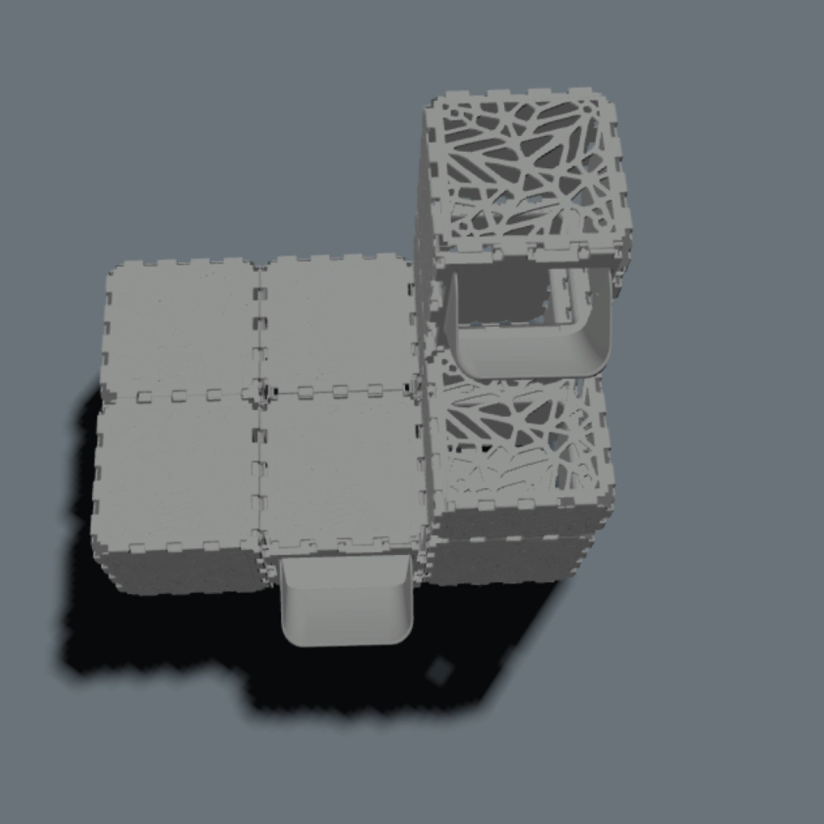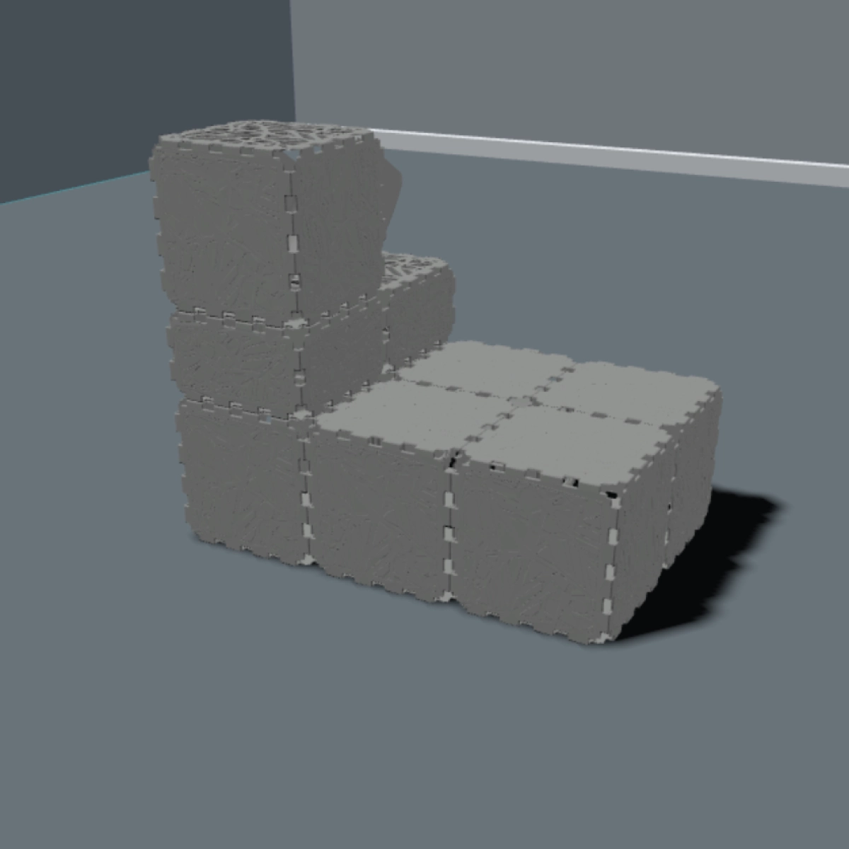 A modular cat play house where FLORA panels are used as entrances and exits, creating soft and comfortable access points for cats. Inside the structure, VOID panels form a hollow interior space, allowing cats to move freely, hide, and feel safe inside.