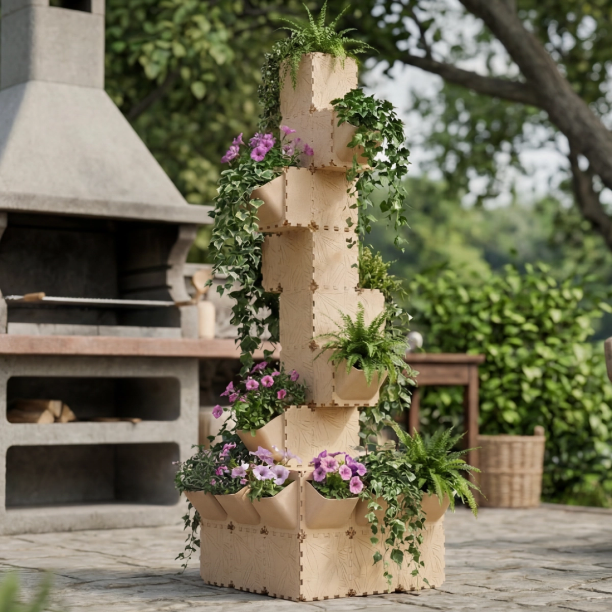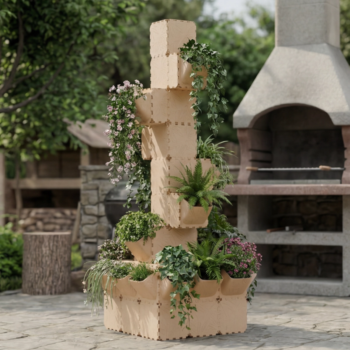En høj søjleformet krukke med Flora-sidepaneler designet til små planter og dekorativt grønt. Den lodrette form skaber en kompakt grøn accent, mens de fremspringende Flora-elementer tilføjer tekstur og dybde til overfladen. Velegnet til indgangspartier, terrasser, lobbyer og offentlige rum, både indendørs og udendørs.