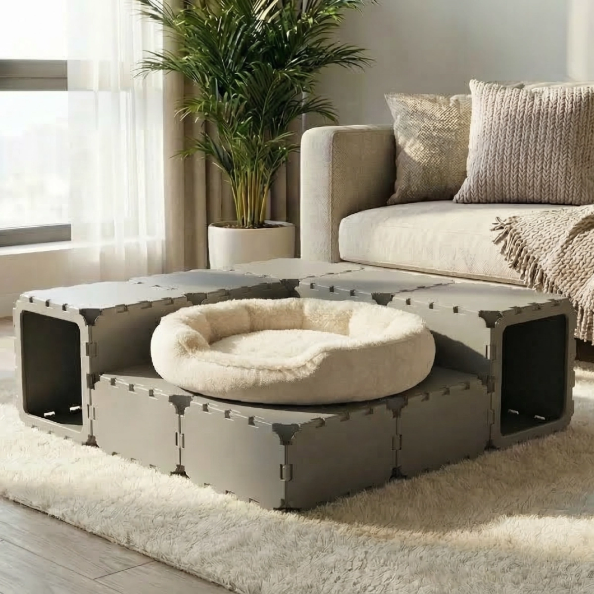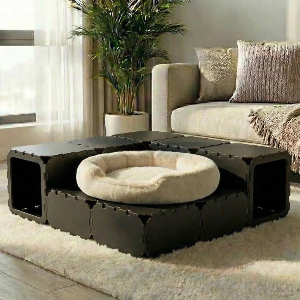 A cozy and playful cat house made from modular cubes, designed for both rest and fun. Cats can crawl through the tunnel built from VOID panels, hide inside, and sleep comfortably — they absolutely love it. Perfect for play, relaxation, and exploring their own little space.