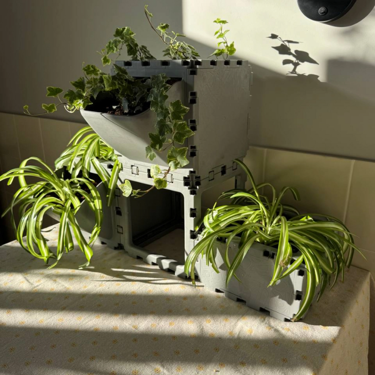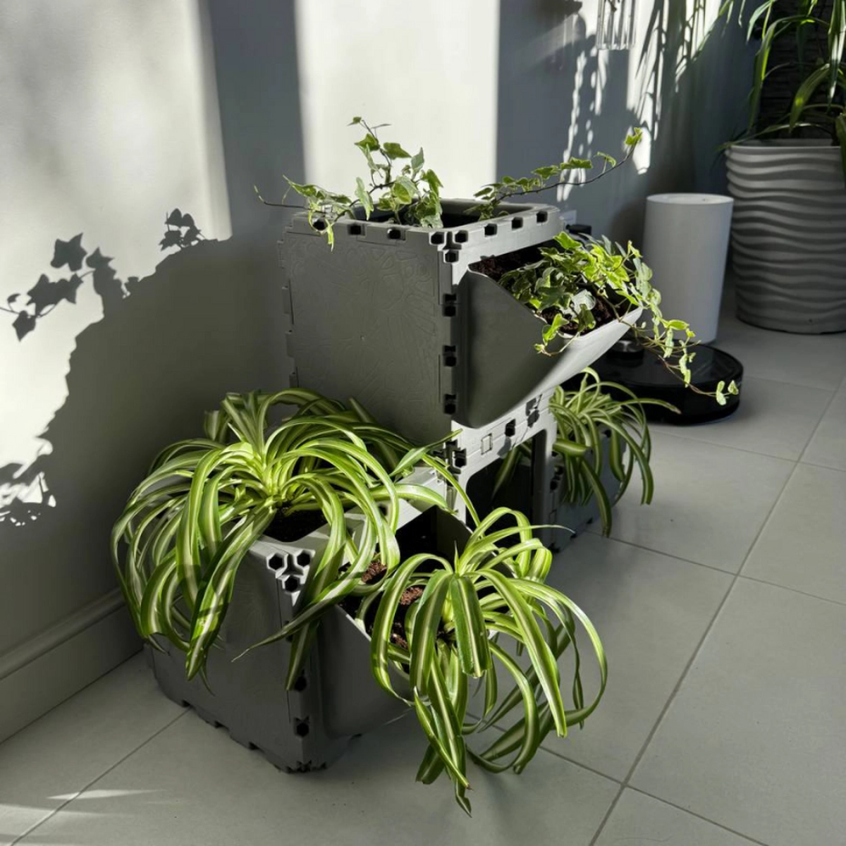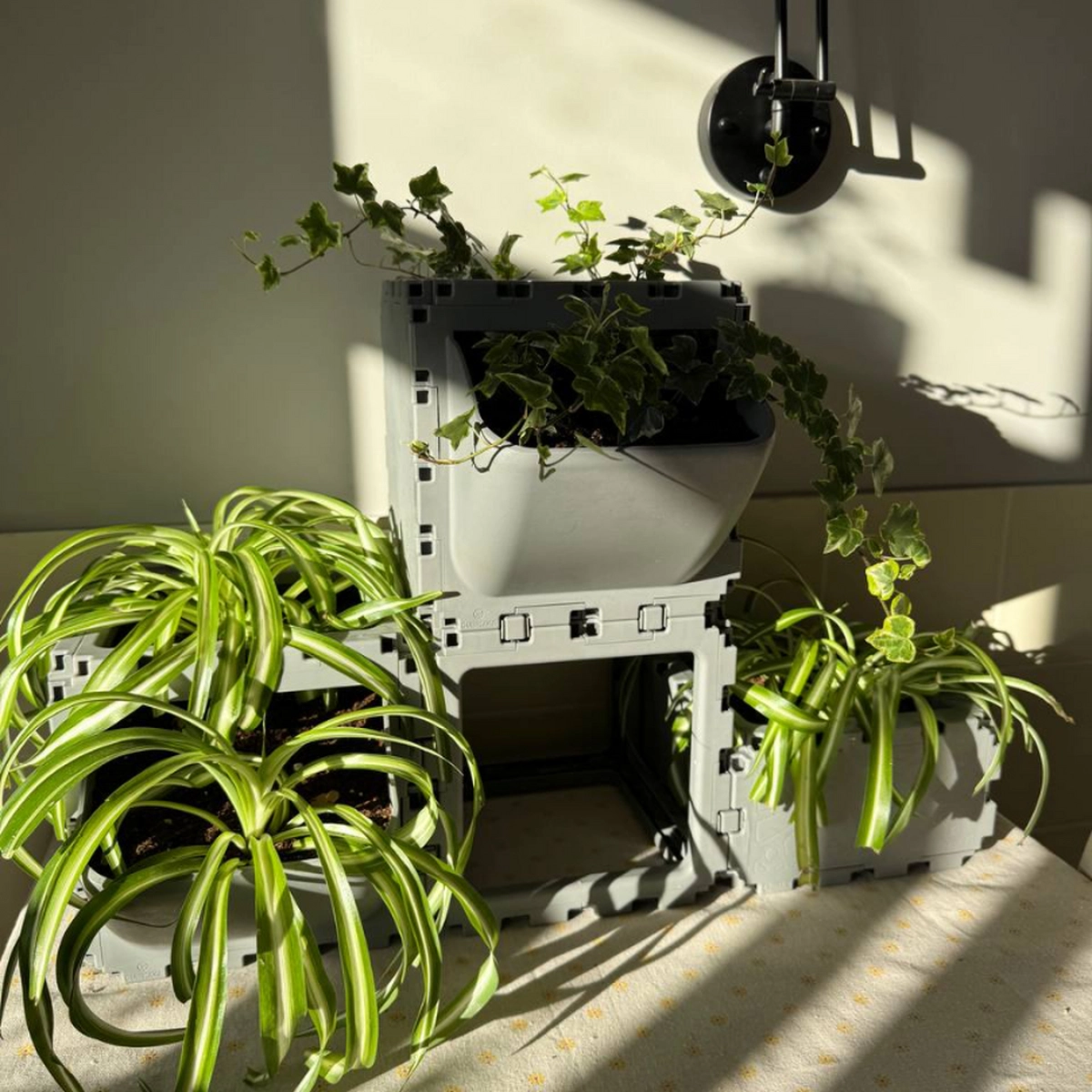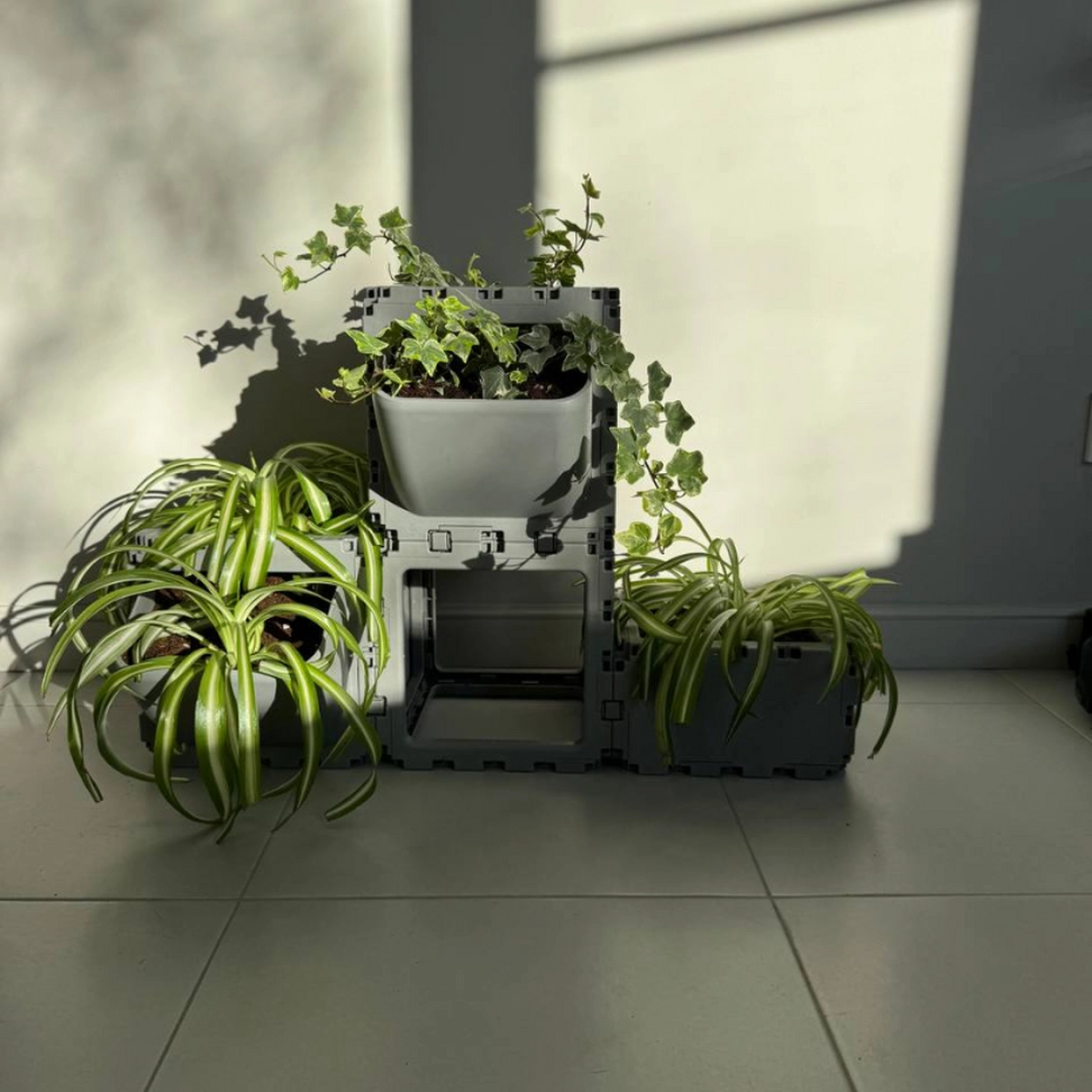 A compact composition made of 4 modular cubes, combining functionality and aesthetics. The structure is arranged at different heights, creating a dynamic and visually balanced setup for plants.