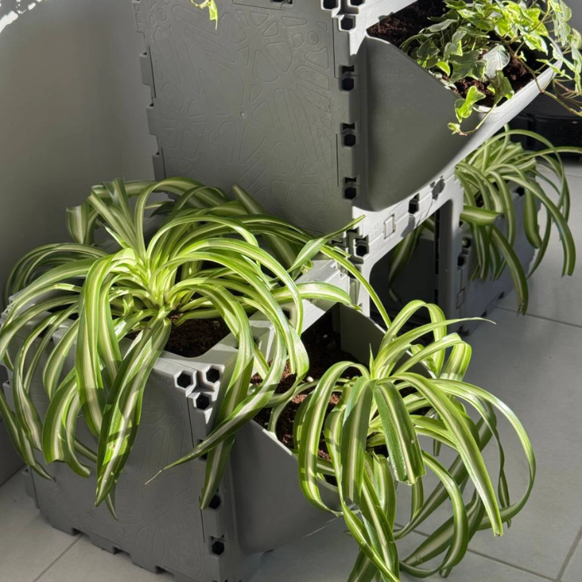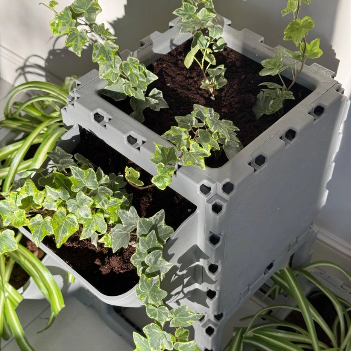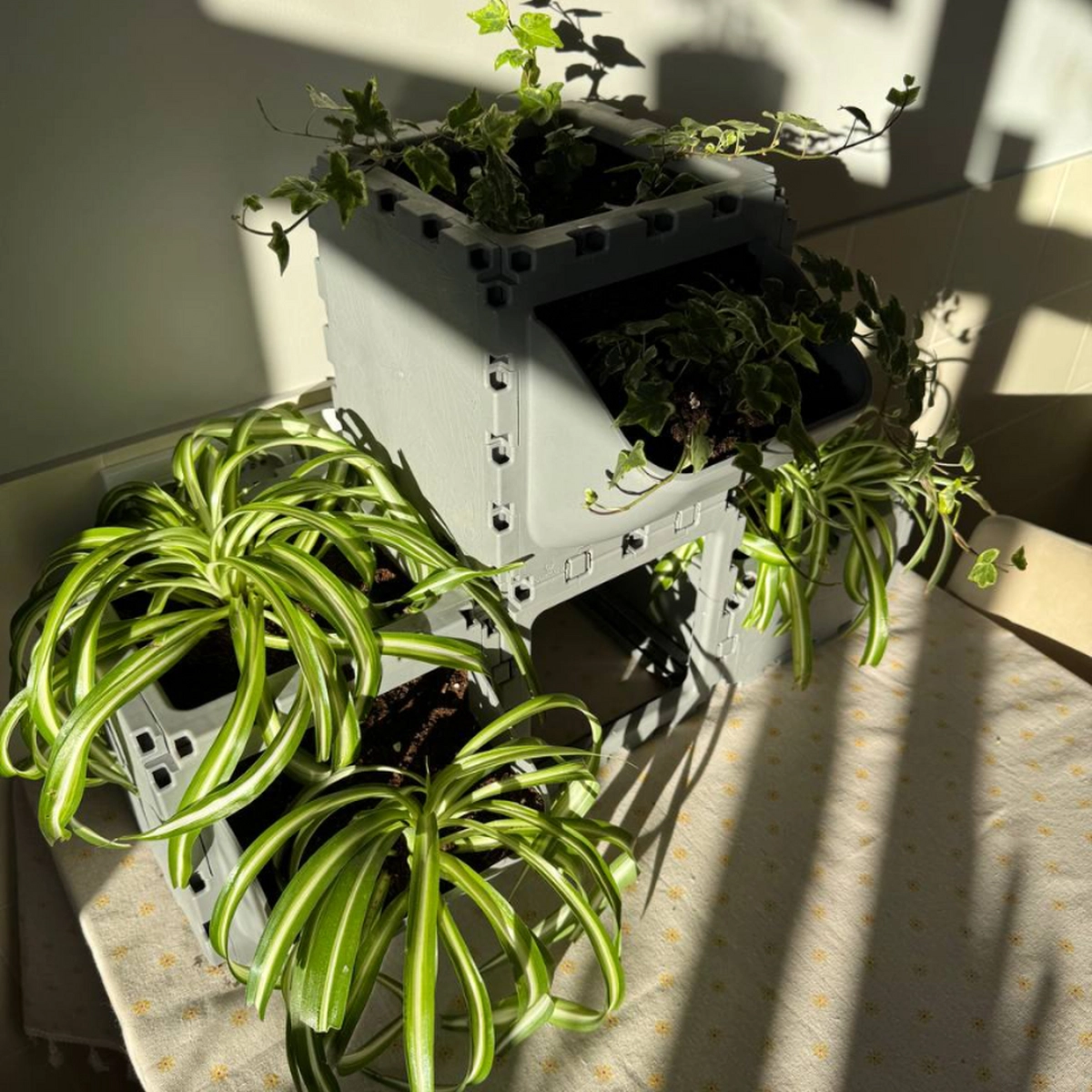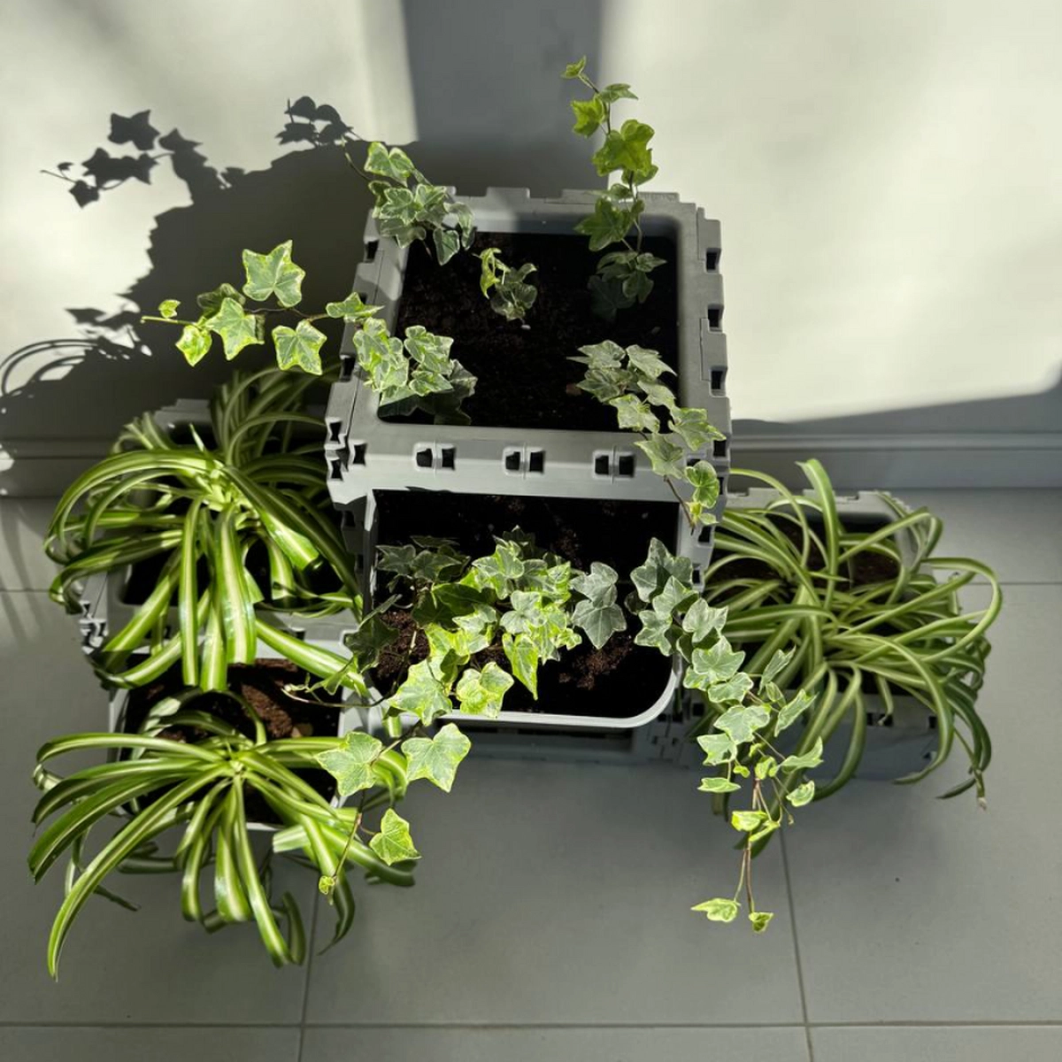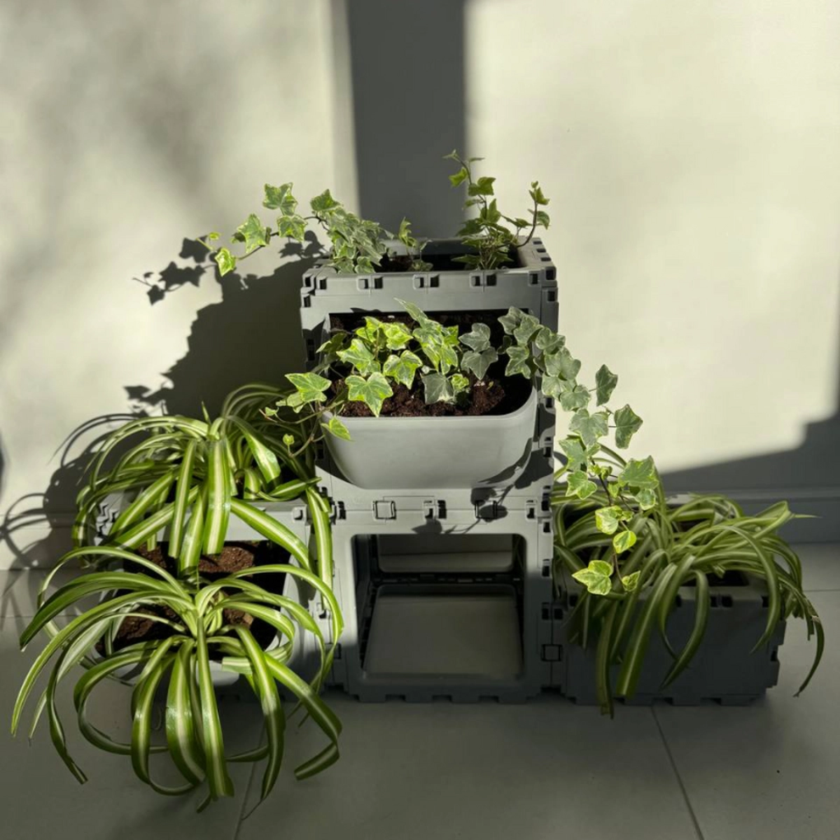 A compact composition made of 4 modular cubes, combining functionality and aesthetics. The structure is arranged at different heights, creating a dynamic and visually balanced setup for plants.