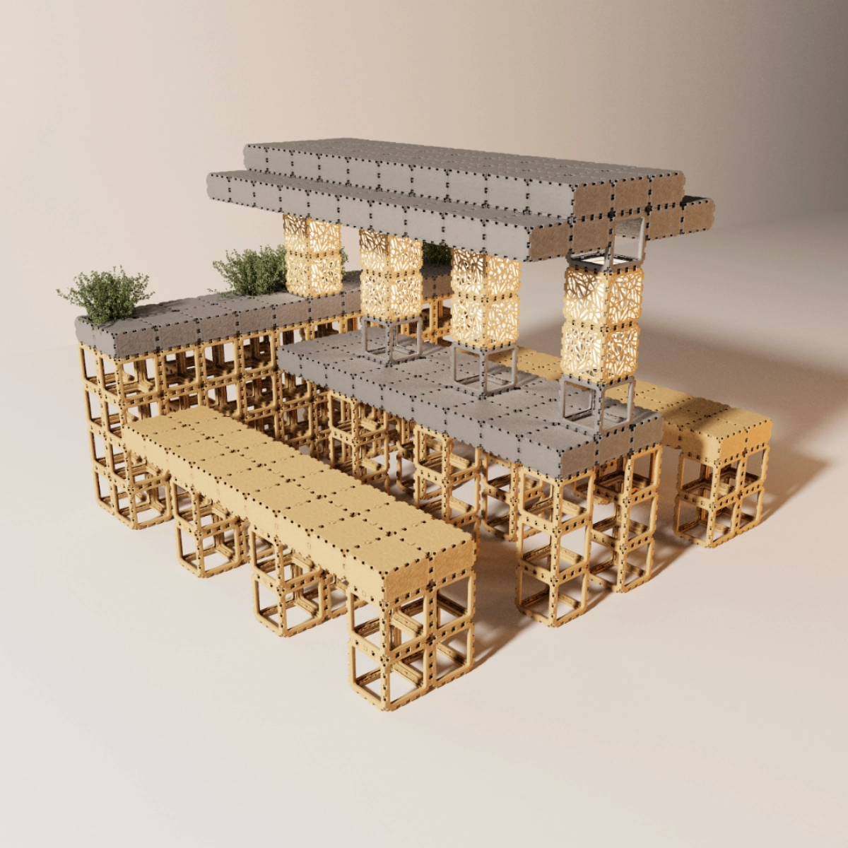 Una gran barra de comedor modular ensamblada con bloques Cubik.one. La estructura incluye dos largos niveles de mostradores y cuatro pilares decorativos verticales que sostienen la superficie superior. Los mostradores inferiores crean una amplia zona para sentarse, mientras que la parte superior elevada añade altura y presencia.