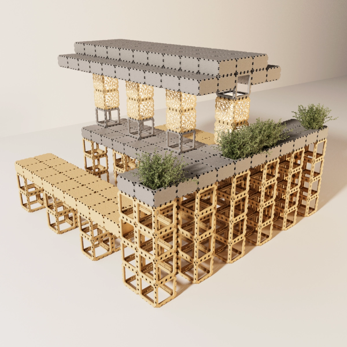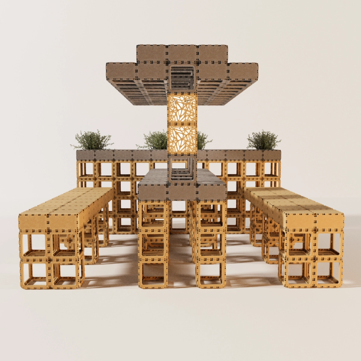 La construcción es estable, no requiere herramientas y es totalmente modular: se puede ampliar, remodelar o adaptar a cualquier evento o interior. Perfecta para cafeterías, terrazas, hoteles, oficinas abiertas o eventos temporales. Tiempo de montaje: entre 5 y 7 horas entre dos personas.