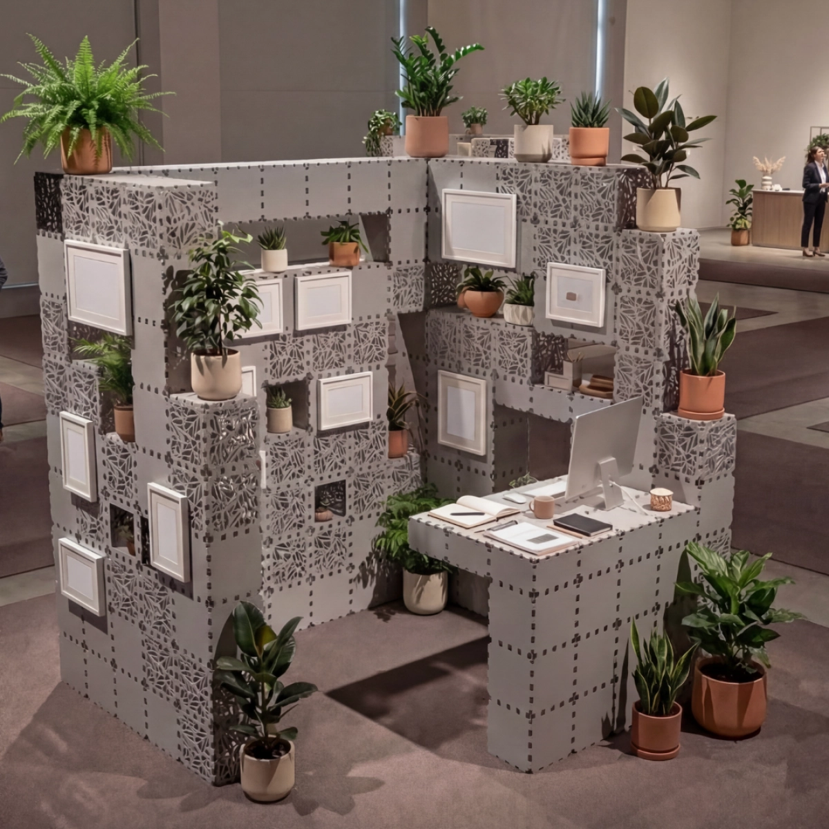 Una cabina modular para espacios de trabajo que combina escritorio, estanterías y divisiones verdes en un único sistema. Las secciones abiertas albergan plantas, marcos y decoración, creando una suave barrera visual al tiempo que mantienen el espacio luminoso y aireado. Adecuada para oficinas, exposiciones, salas de exhibición o espacios emergentes, se puede ampliar, reorganizar o reubicar fácilmente.