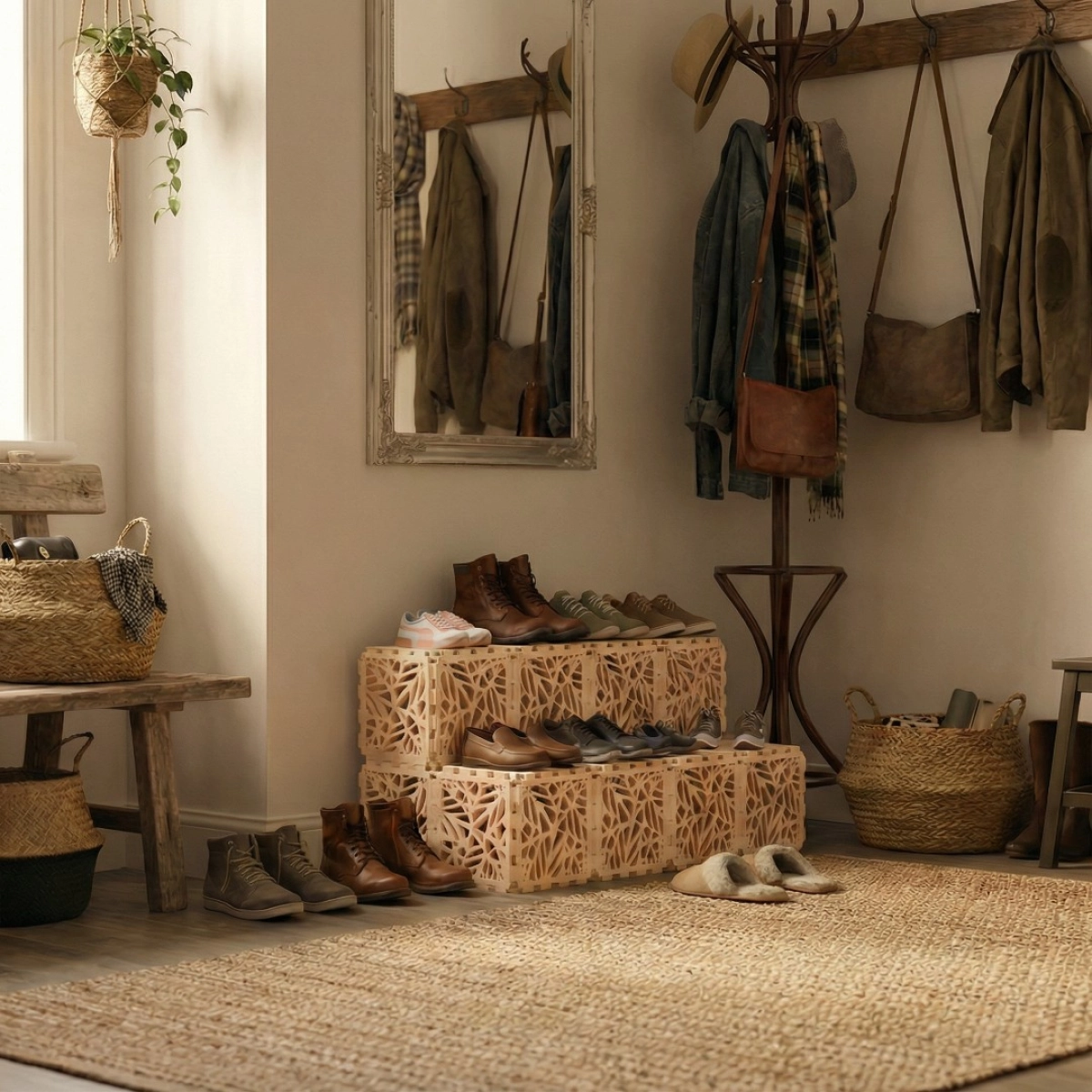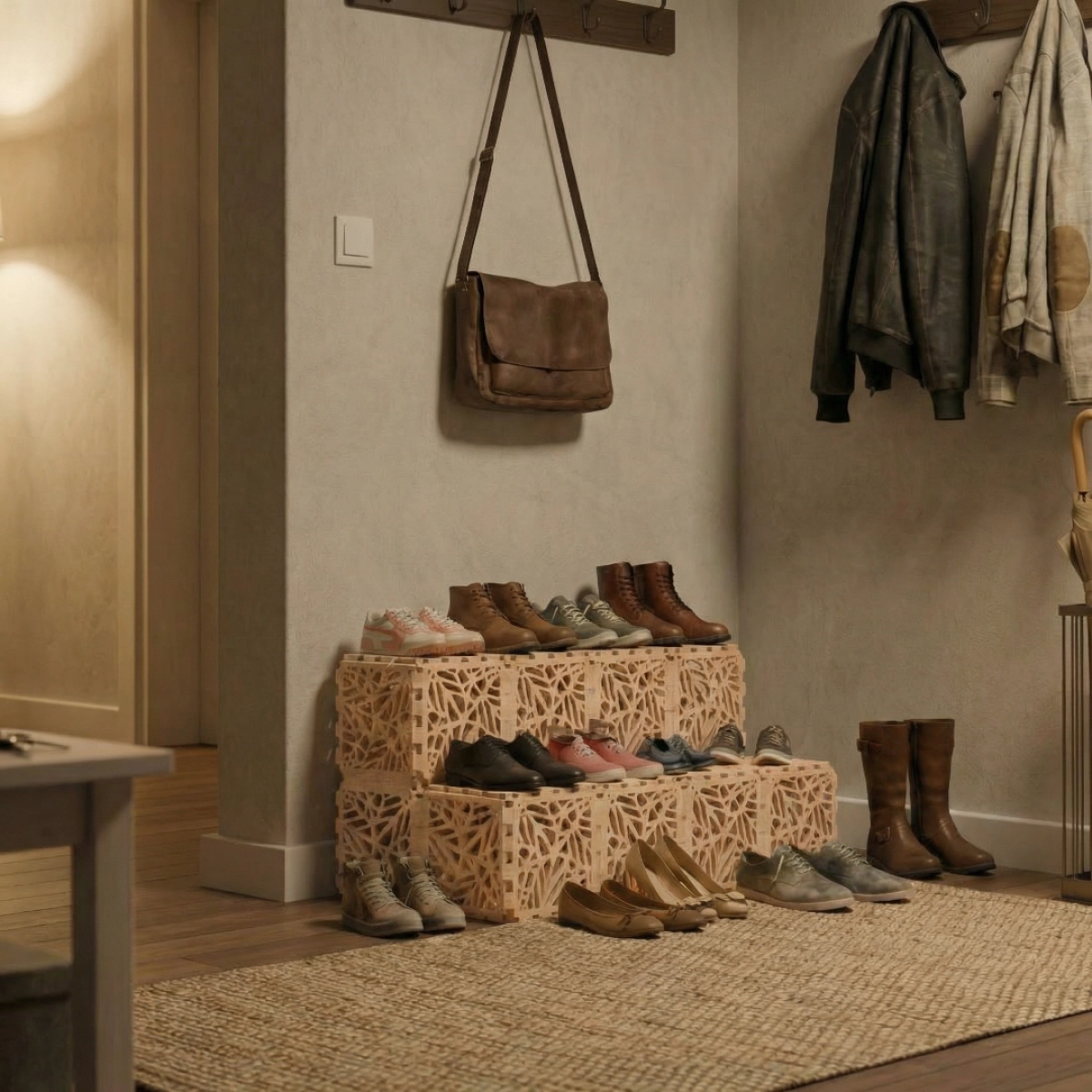 Un expositor modular perfecto para organizar o exhibir calzado en casa, en tiendas o en salas de exposición. Su estructura escalonada facilita el acceso y la visibilidad, mientras que su diseño calado lo hace ligero y elegante. Tiempo de montaje: unos 30 minutos.