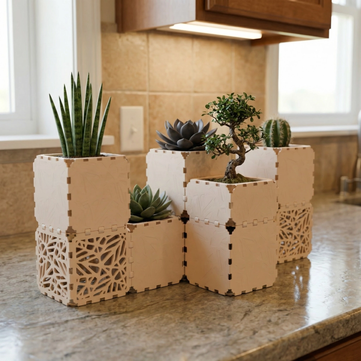 10 minikuution sarja, joka on luotu monipuolisten istutusjärjestelmien kokoamiseen pieniin sisätiloihin. Minimalistiset kuutiomoduulit voidaan järjestää lineaarisiksi kokoonpanoiksi, portaittaisiksi asetelmiksi, kulma-asetelmiksi tai monitasoisiksi näytteiksi. Yhdistä eri korkeuksia, muokkaa rakennetta ja mukauta asettelua, kun viherkokoelmasi kehittyy. Sopii mokkapaloille, yrteille ja pienille huonekasveille pöydille, hyllyille ja ikkunalaudoille.