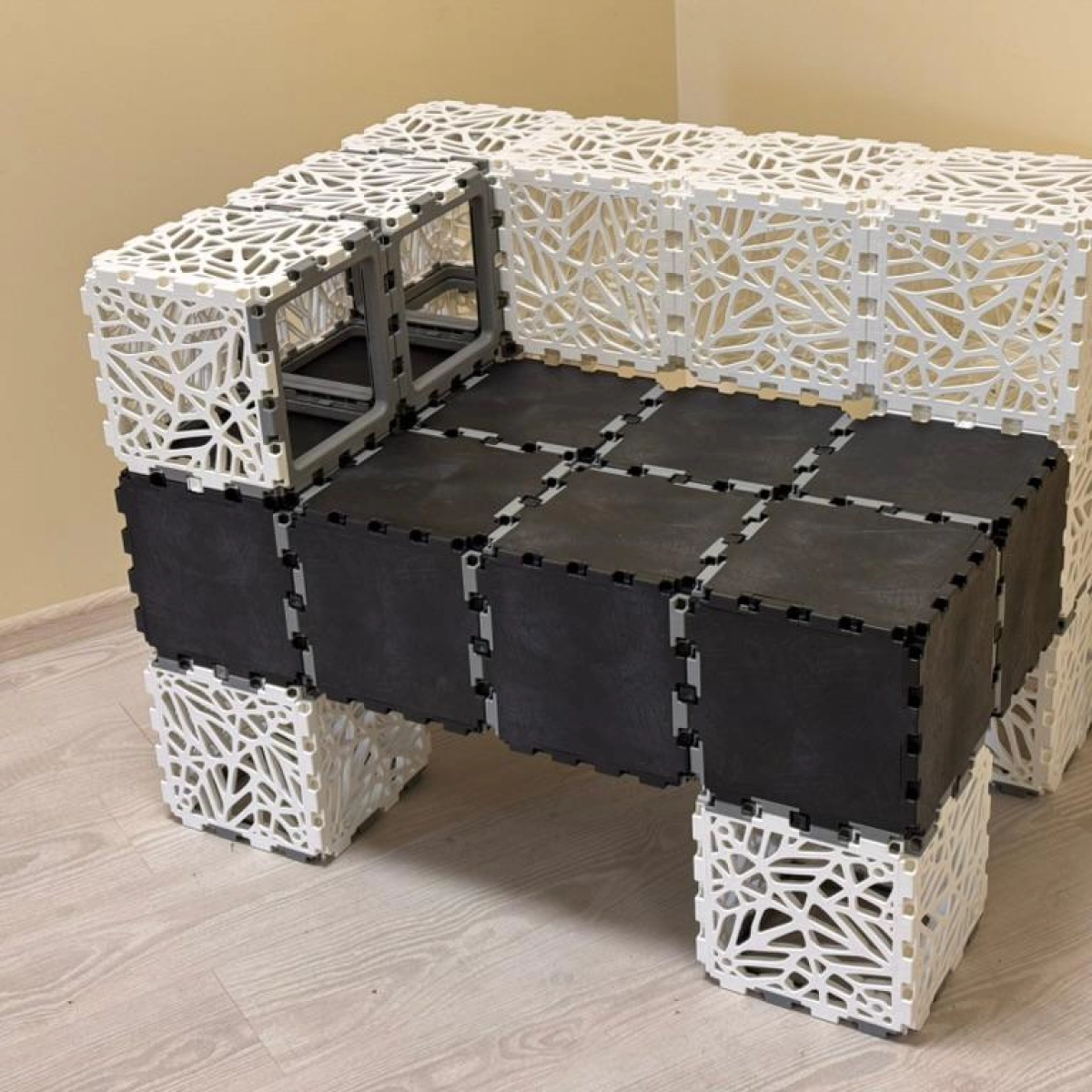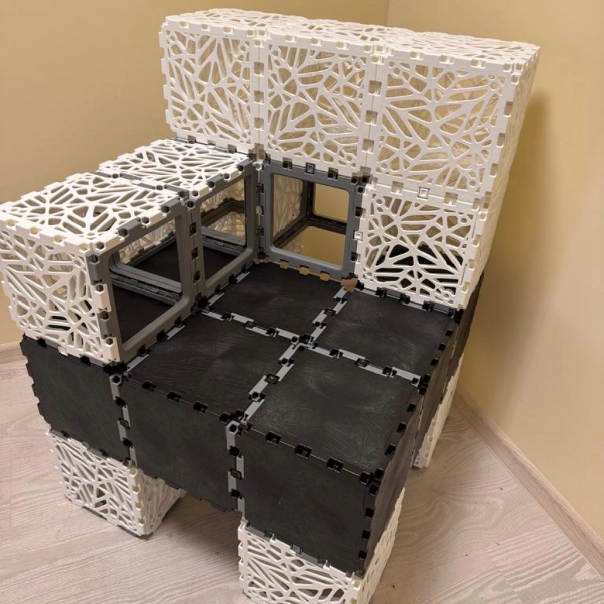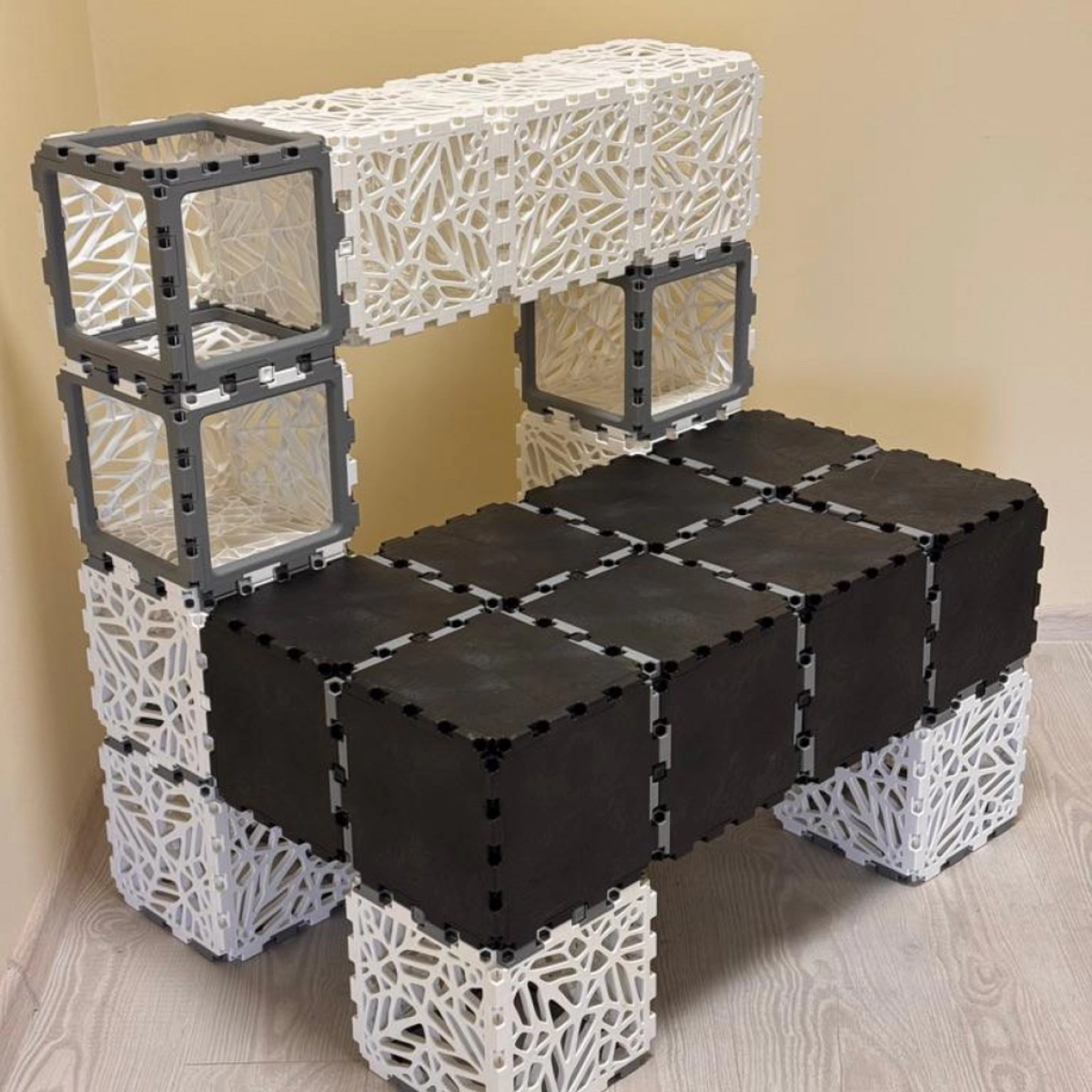 Build more than one thing from one box. In under an hour you can make a compact armchair, a small bench with a back, or a low console, then take it apart and build something else. The photos are examples only — we’re sure you’ll come up with something new and even better. The set includes everything needed for assembly: mixed facets, clips, gloves, and tweezers for removing clips. People, drinks, cushions and other props are not included :-)).