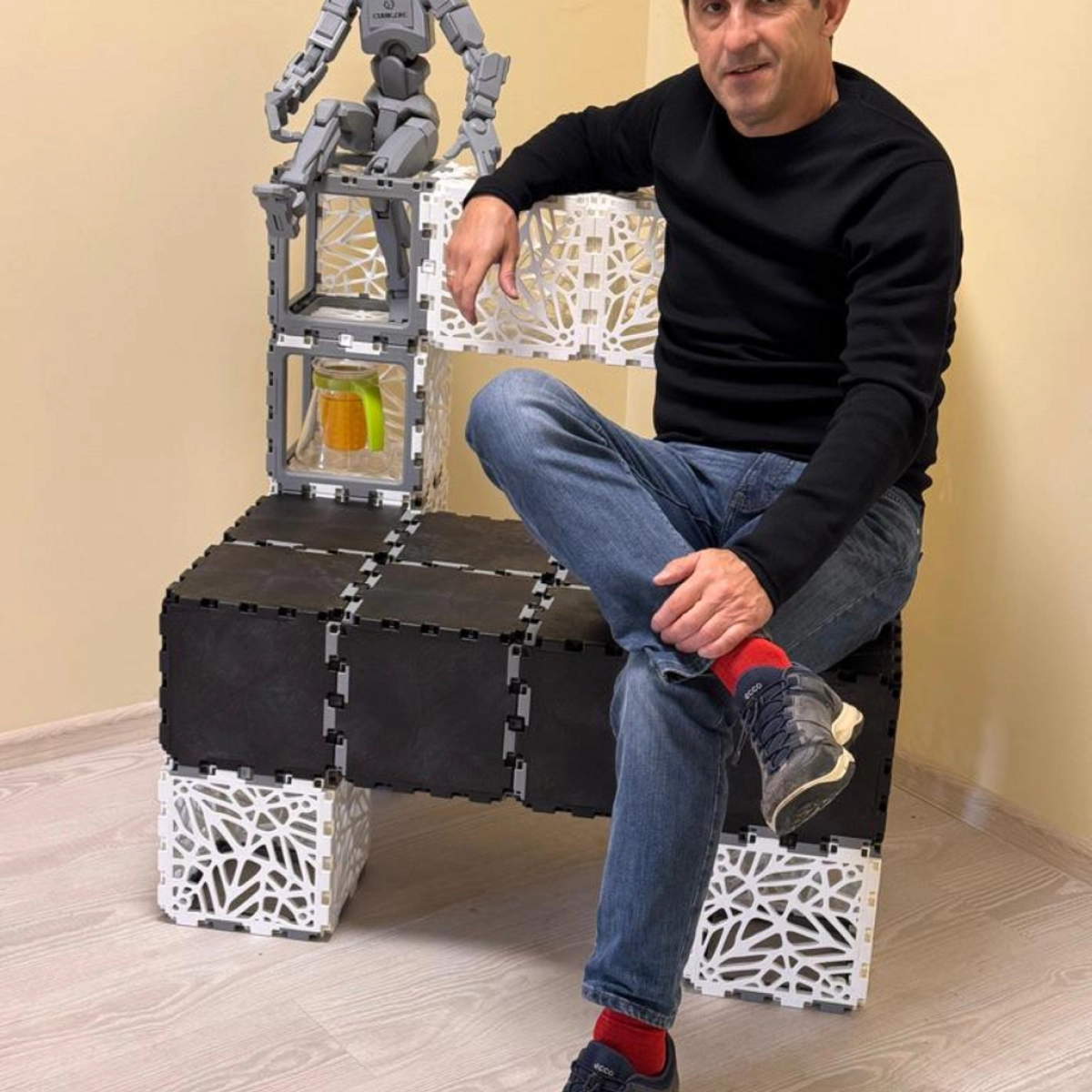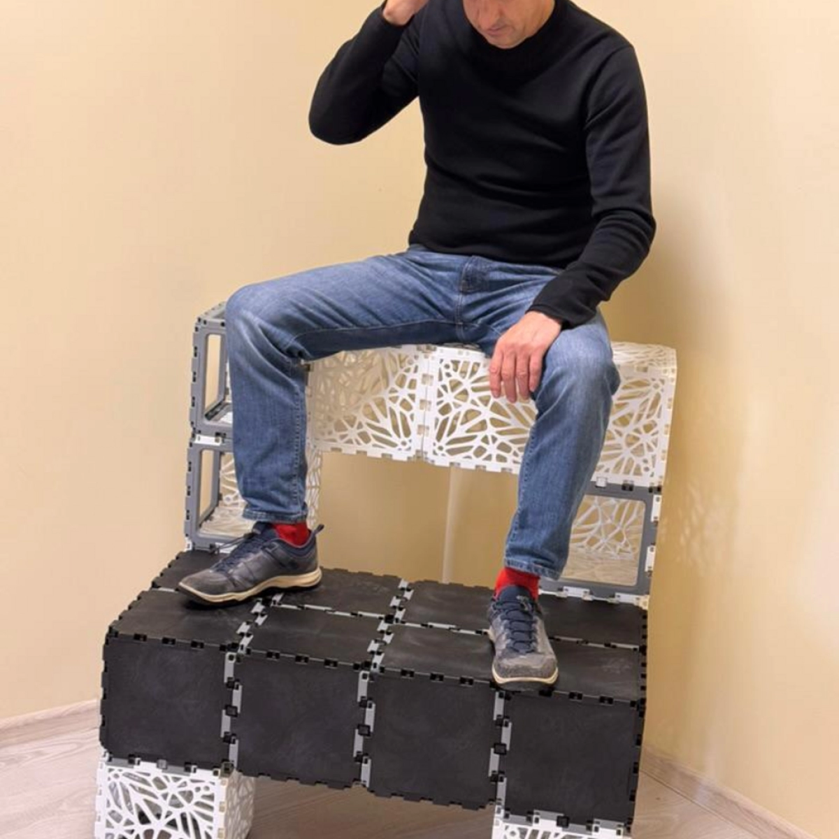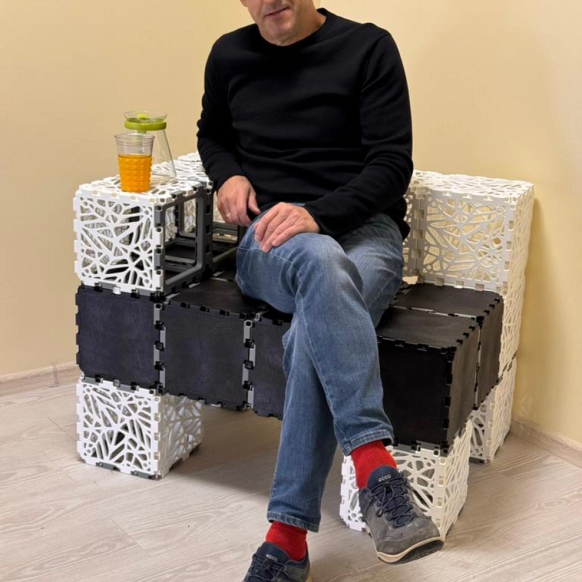 Build more than one thing from one box. In under an hour you can make a compact armchair, a small bench with a back, or a low console, then take it apart and build something else. The photos are examples only — we’re sure you’ll come up with something new and even better. The set includes everything needed for assembly: mixed facets, clips, gloves, and tweezers for removing clips. People, drinks, cushions and other props are not included :-)).