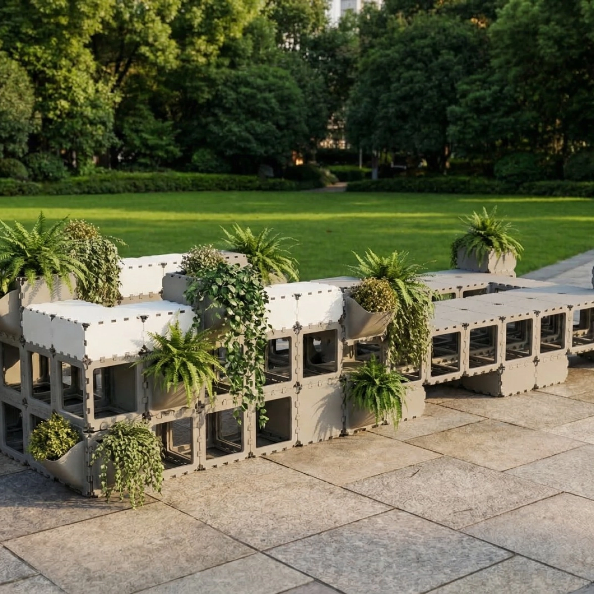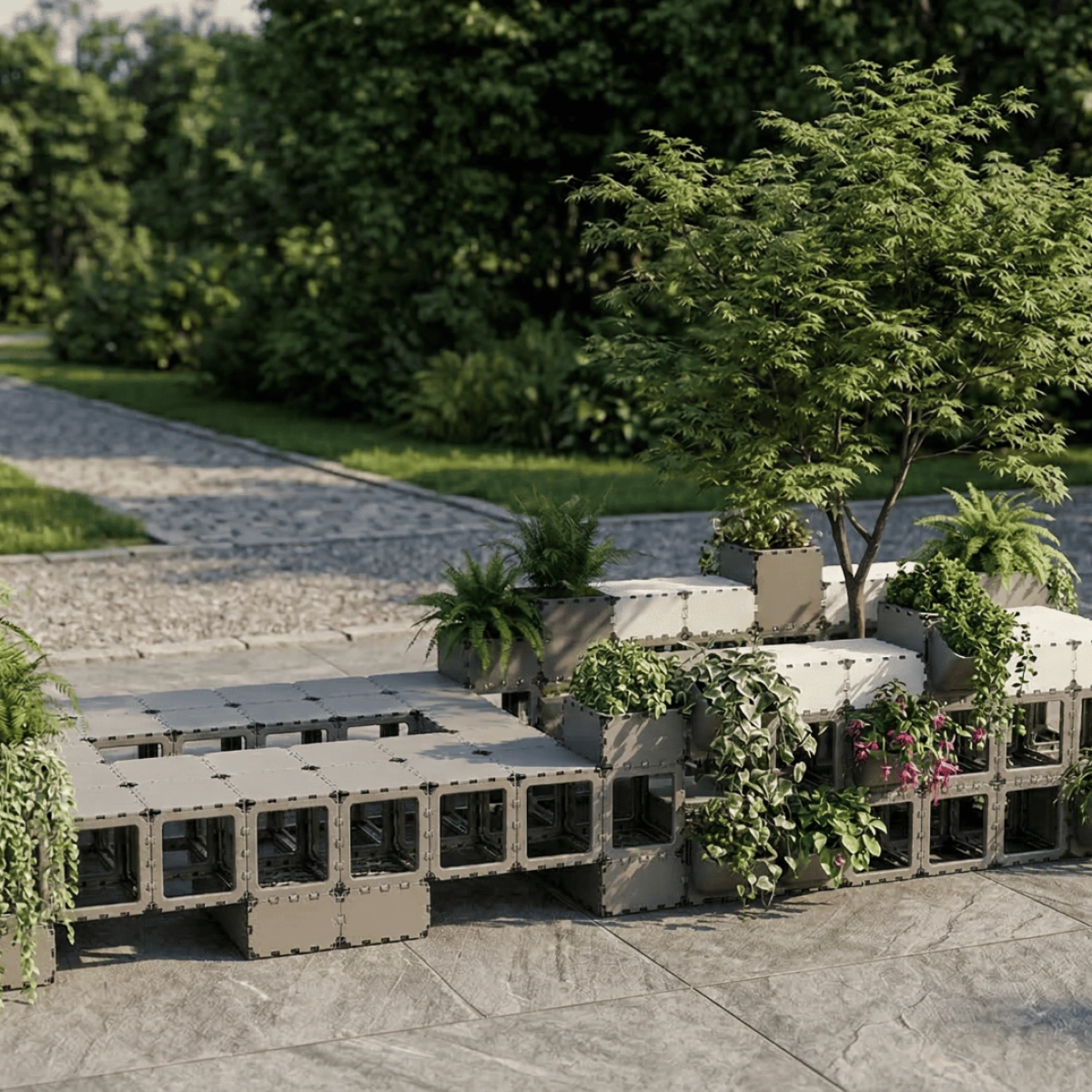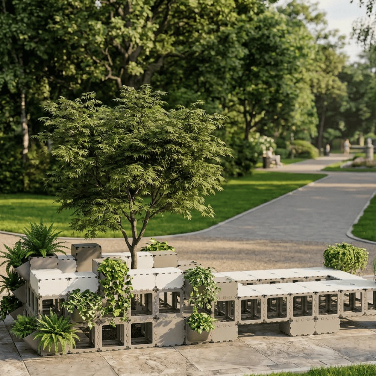 A modular seating area with integrated planters designed for public spaces, terraces, and lounge zones. This configuration combines seating, greenery, and clean architectural lines in one functional composition, creating a durable and visually striking solution that can be easily assembled, adapted, and reconfigured for different layouts. The tone and positioning here follow your Public Spaces catalog language around modularity, durability, aesthetics, and lounge/reception-style use cases.