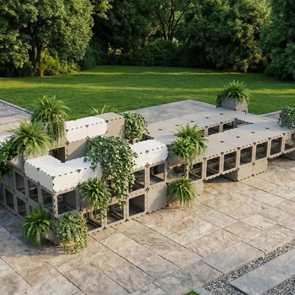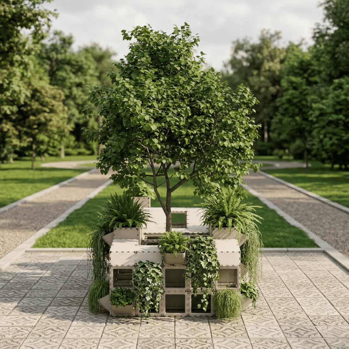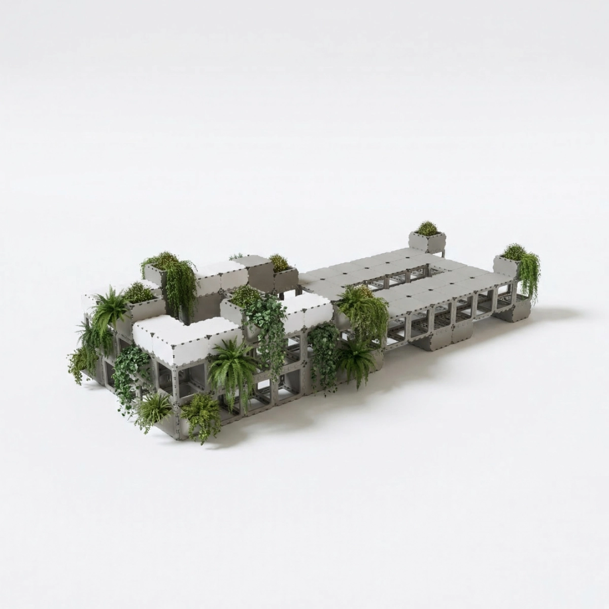 A modular seating area with integrated planters designed for public spaces, terraces, and lounge zones. This configuration combines seating, greenery, and clean architectural lines in one functional composition, creating a durable and visually striking solution that can be easily assembled, adapted, and reconfigured for different layouts. The tone and positioning here follow your Public Spaces catalog language around modularity, durability, aesthetics, and lounge/reception-style use cases.