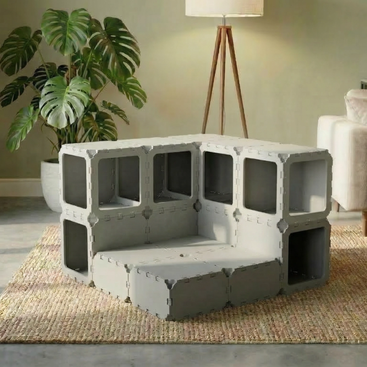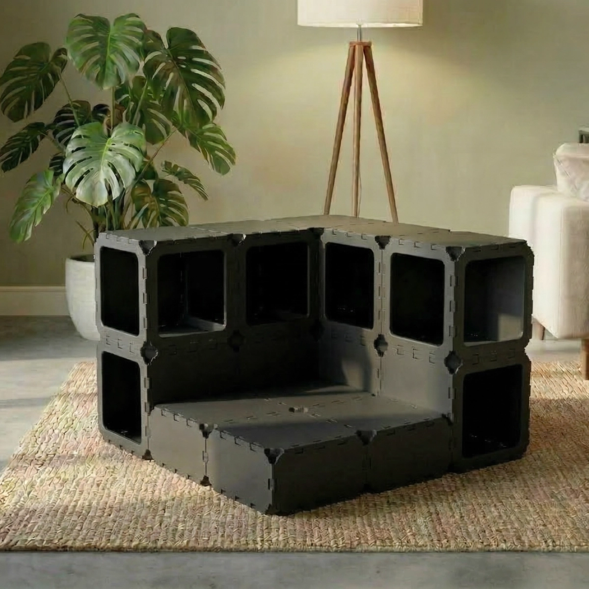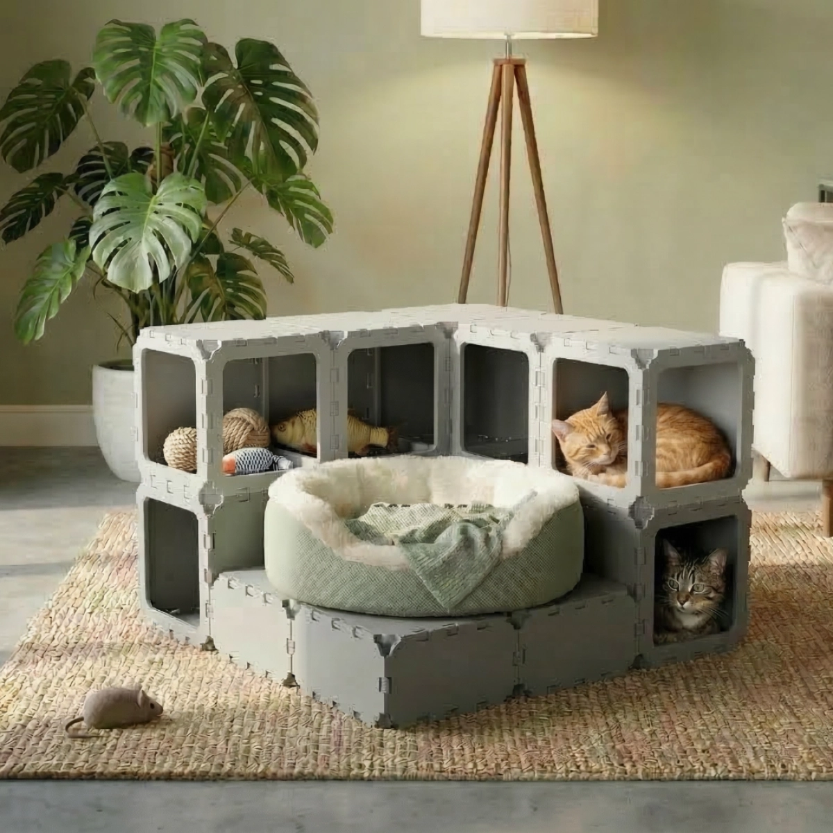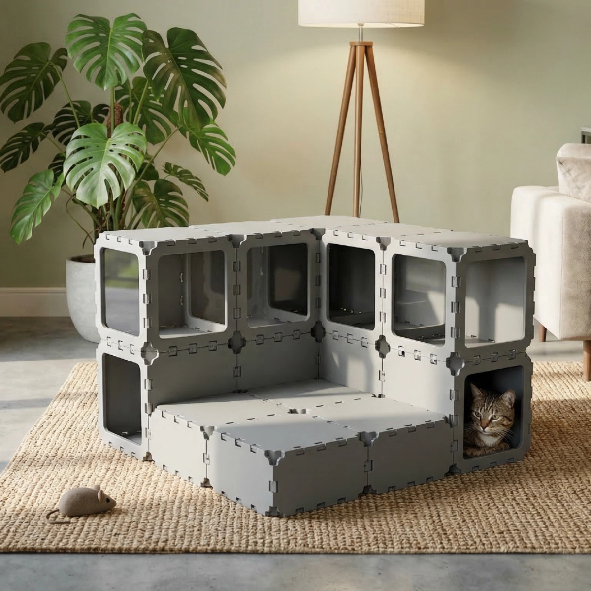 A functional and playful cat house made from modular cubes, featuring a two-level tunnel system. Cats can move through both levels, explore, hide, and choose their favorite spot to rest. The VOID panels create open, breathable spaces inside, making it a perfect place for sleeping and play — cats love spending time inside these tunnels.
