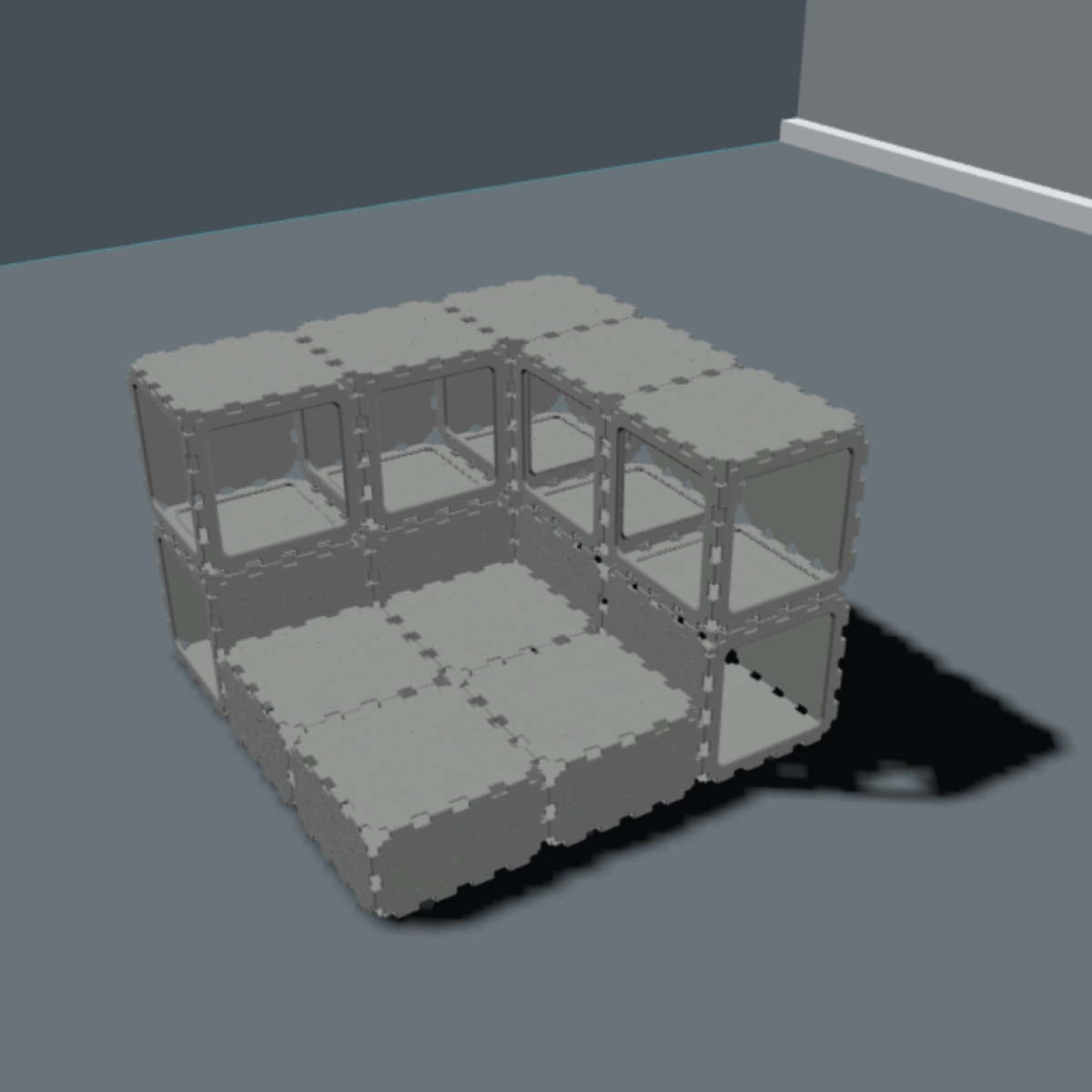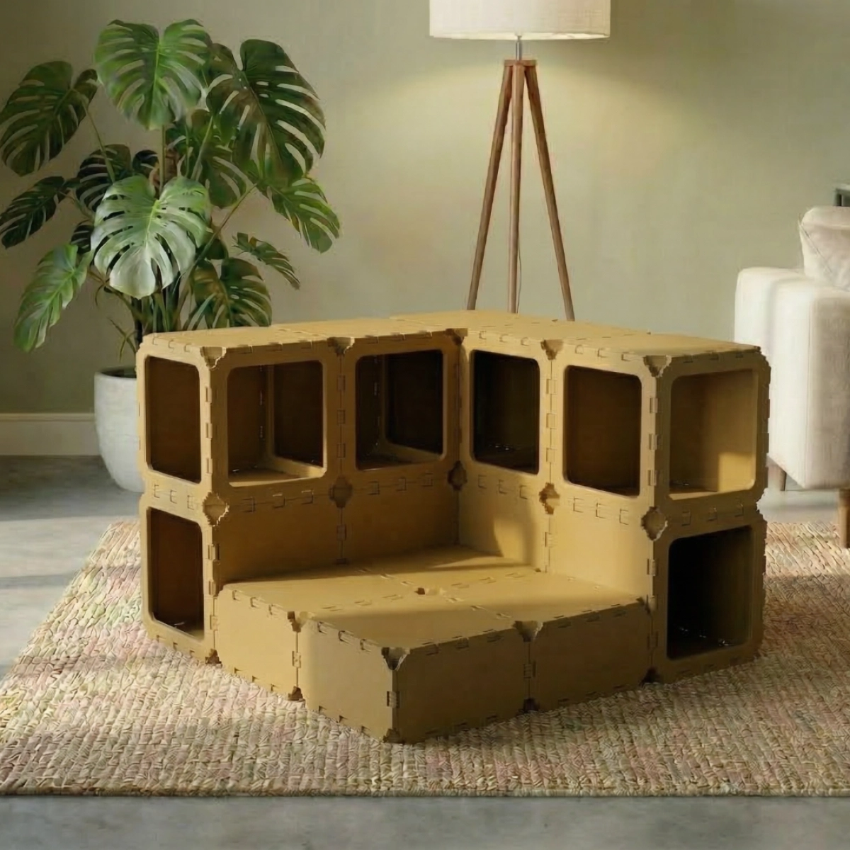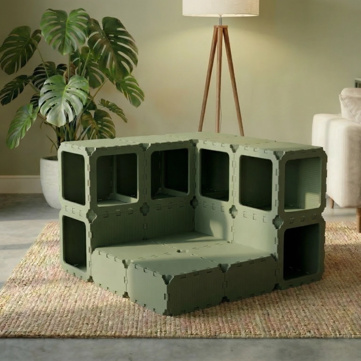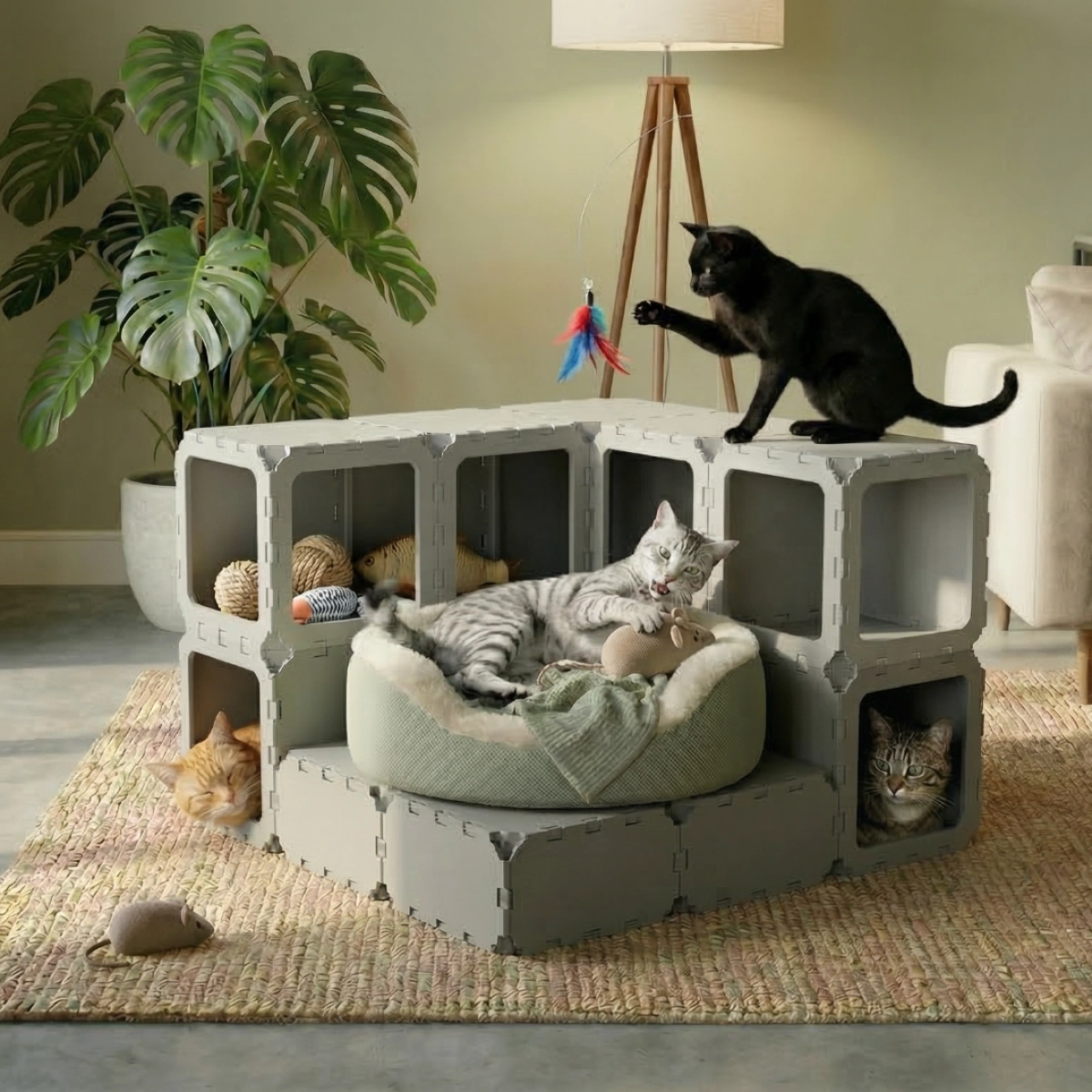 A functional and playful cat house made from modular cubes, featuring a two-level tunnel system. Cats can move through both levels, explore, hide, and choose their favorite spot to rest. The VOID panels create open, breathable spaces inside, making it a perfect place for sleeping and play — cats love spending time inside these tunnels.