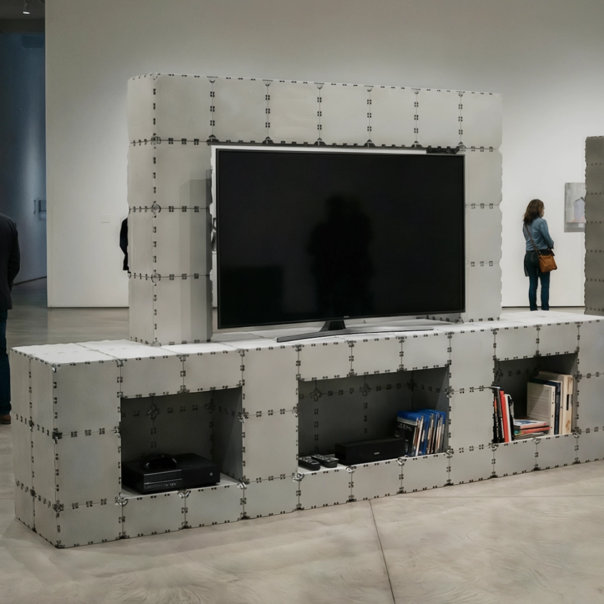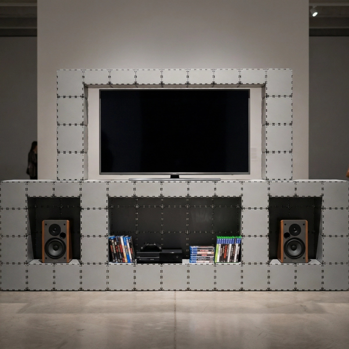 A modular media wall with integrated niches for TV, speakers, consoles, and decor. The clean, geometric layout works equally well in living rooms, hotel lounges, offices, or gaming spaces, and can be extended or reshaped as needed. Cable management and equipment are neatly hidden inside the structure.