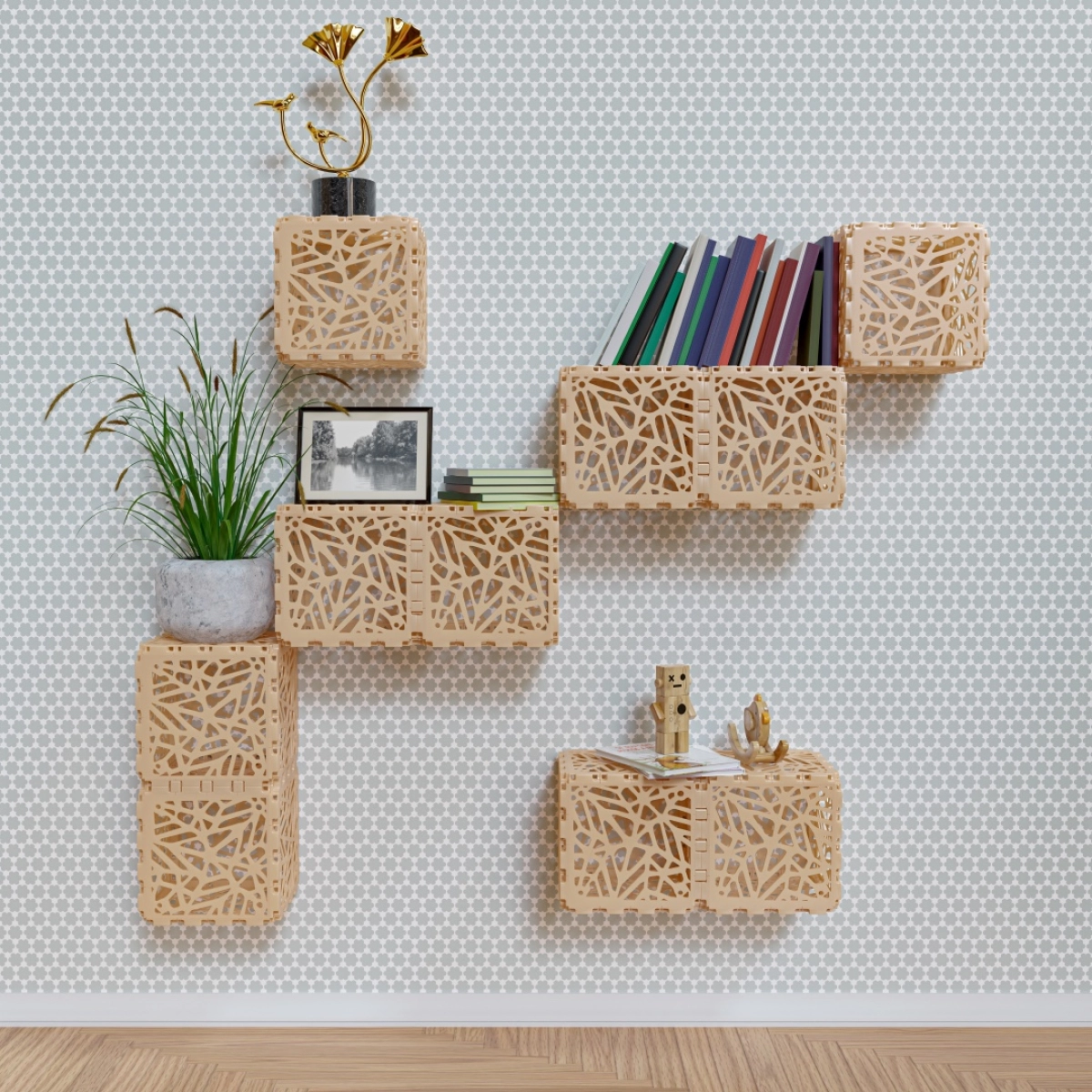 A light, decorative shelving system made from Cubik.one modules. It can be freely arranged to fit any wall space — for books, plants, or small decor. Each cube connects securely while keeping the structure visually open and airy. The layout shown is just one of many possible configurations. Half an hour is enough to assemble all the cubiks. There are holes in the facet design for attaching them to the wall.