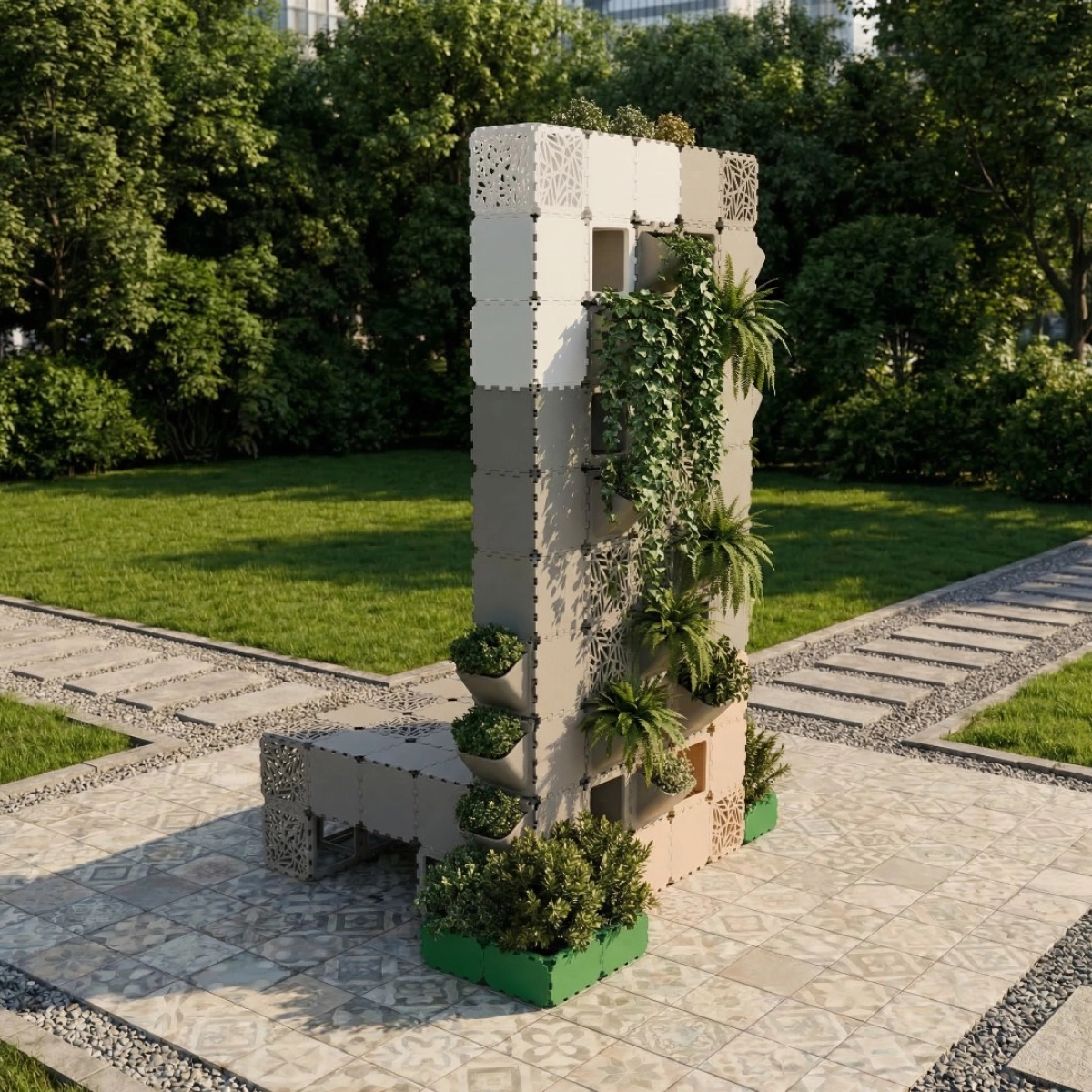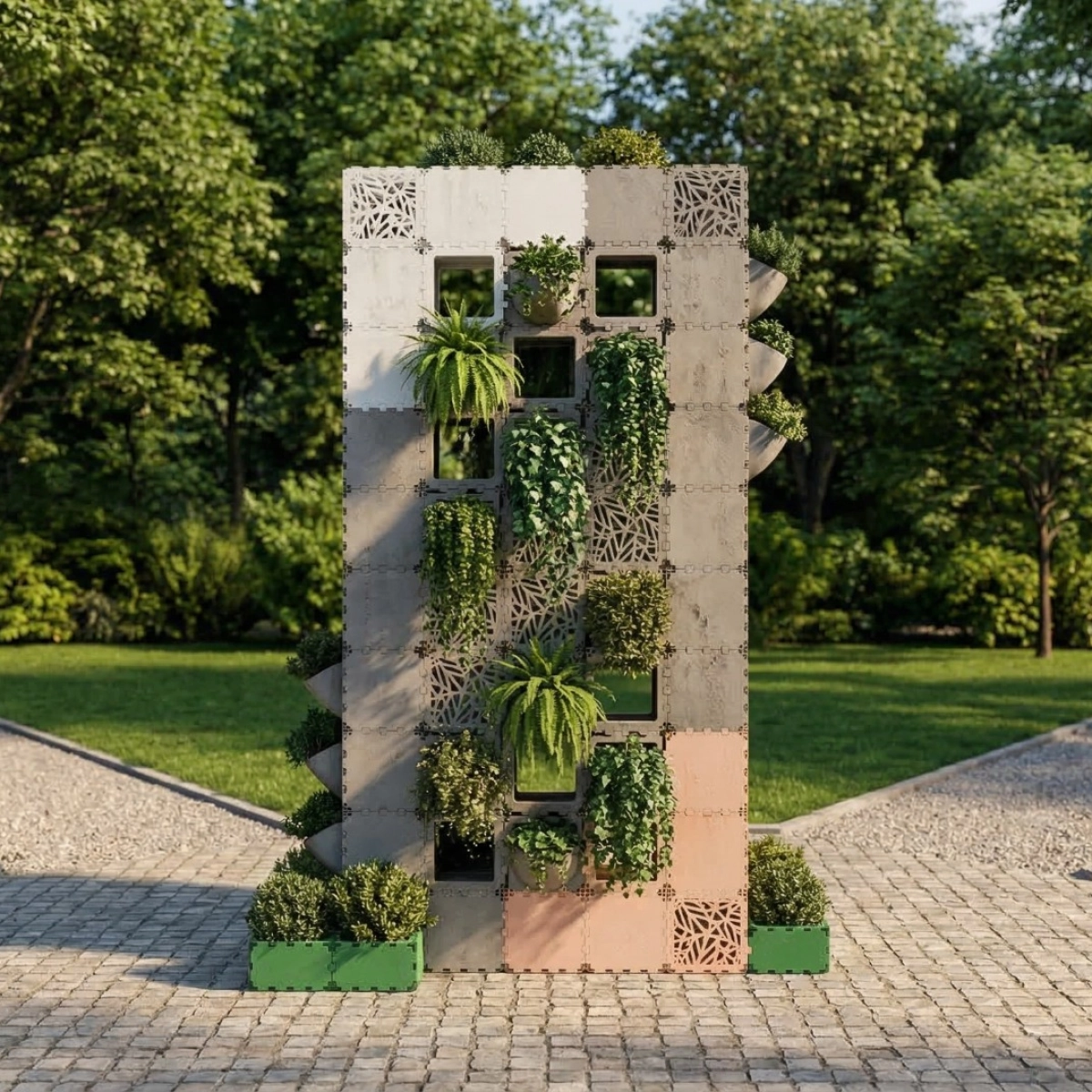 A modular vertical garden designed for urban environments, combining greenery with a compact architectural structure. The system integrates planting modules directly into the facade, allowing dense vertical landscaping in limited spaces. Suitable for courtyards, embankments, parks, and residential developments, it functions both as a visual landmark and as a natural zoning element. Easily scalable and adaptable to different heights and configurations.