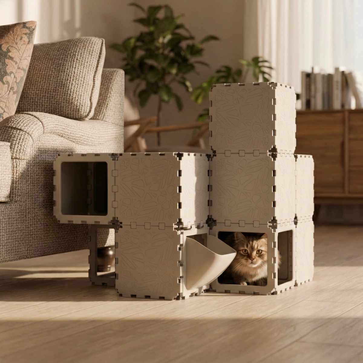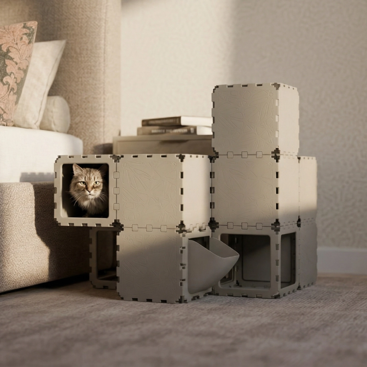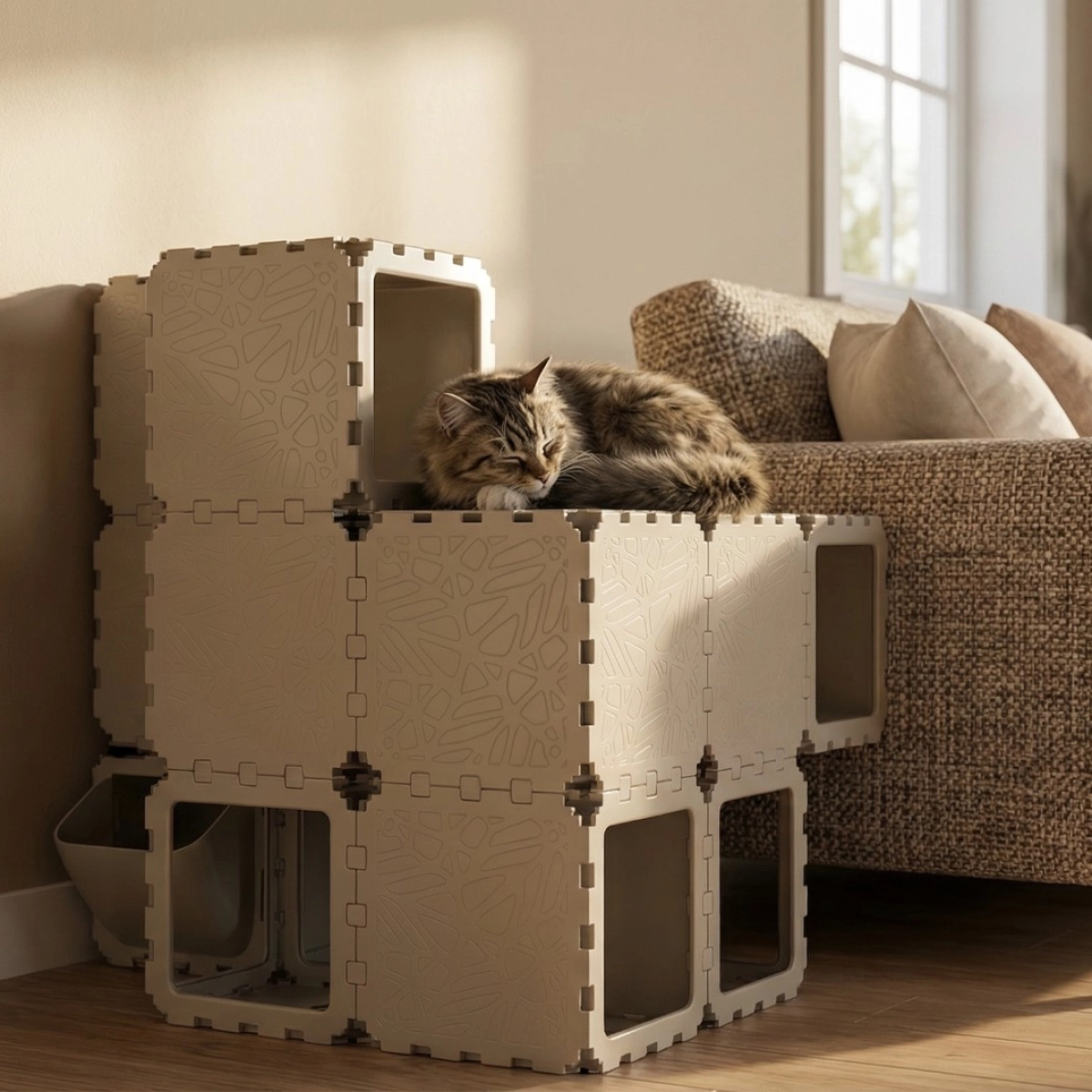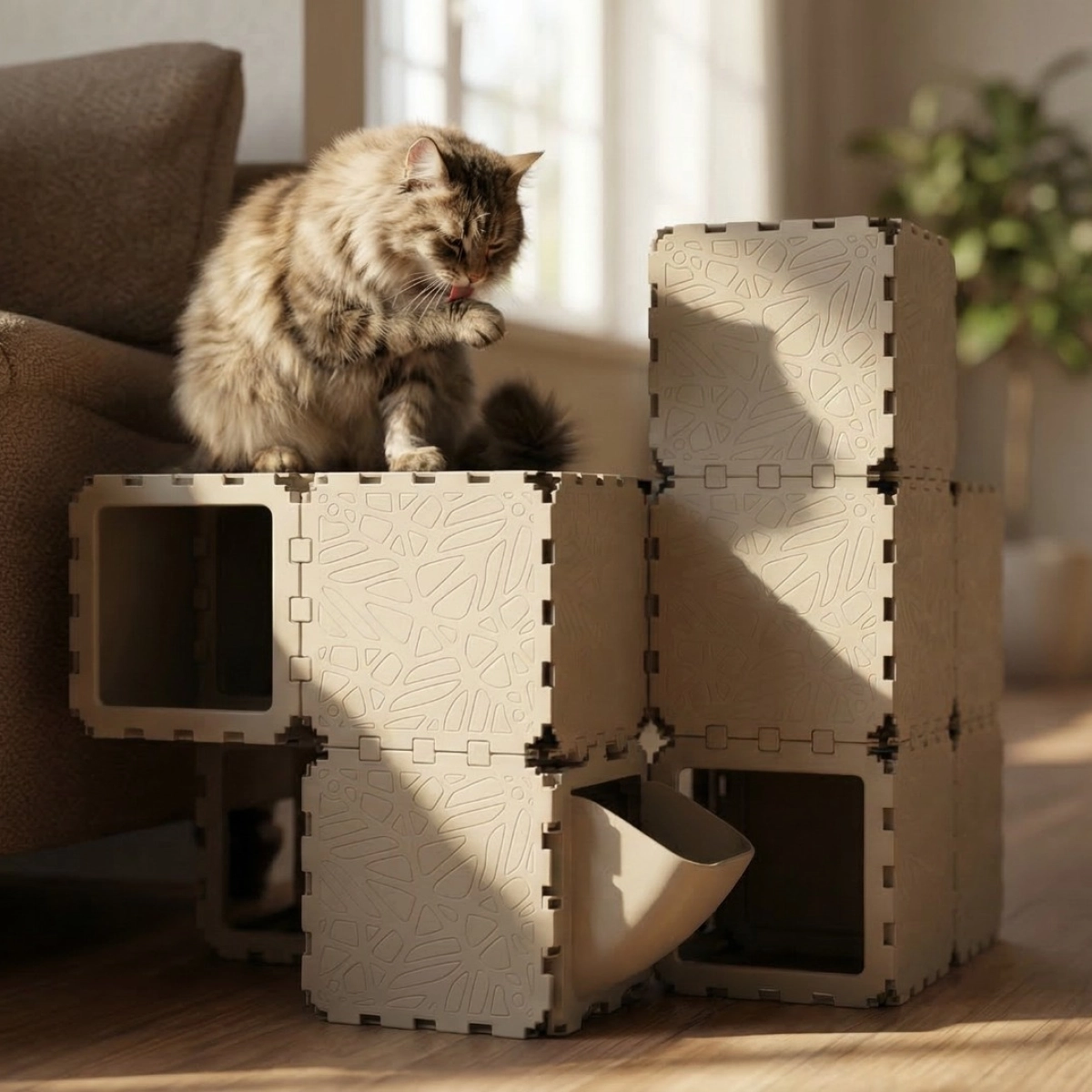 A modular indoor habitat designed for cats, combining rest, play, and movement zones within a compact cubic structure. Built from interlocking elements, the system forms enclosed hideouts, elevated platforms, and internal pathways that support natural feline behavior — climbing, hiding, and observing. The configuration integrates optional accessories such as a litter module and soft resting surfaces, making it suitable as a complete micro-environment for a single or multiple cats.