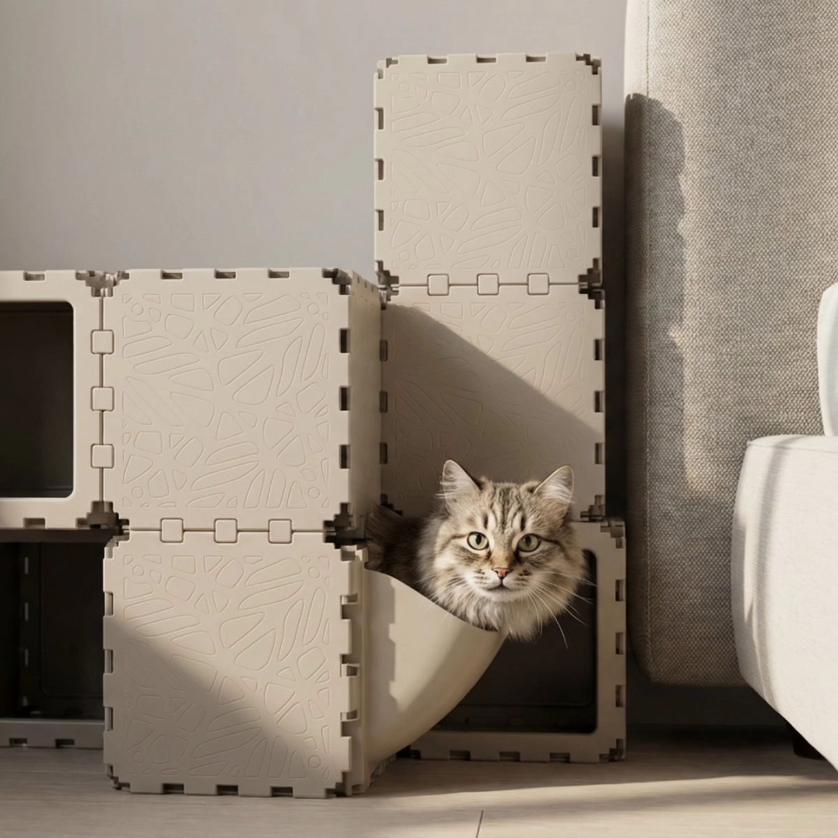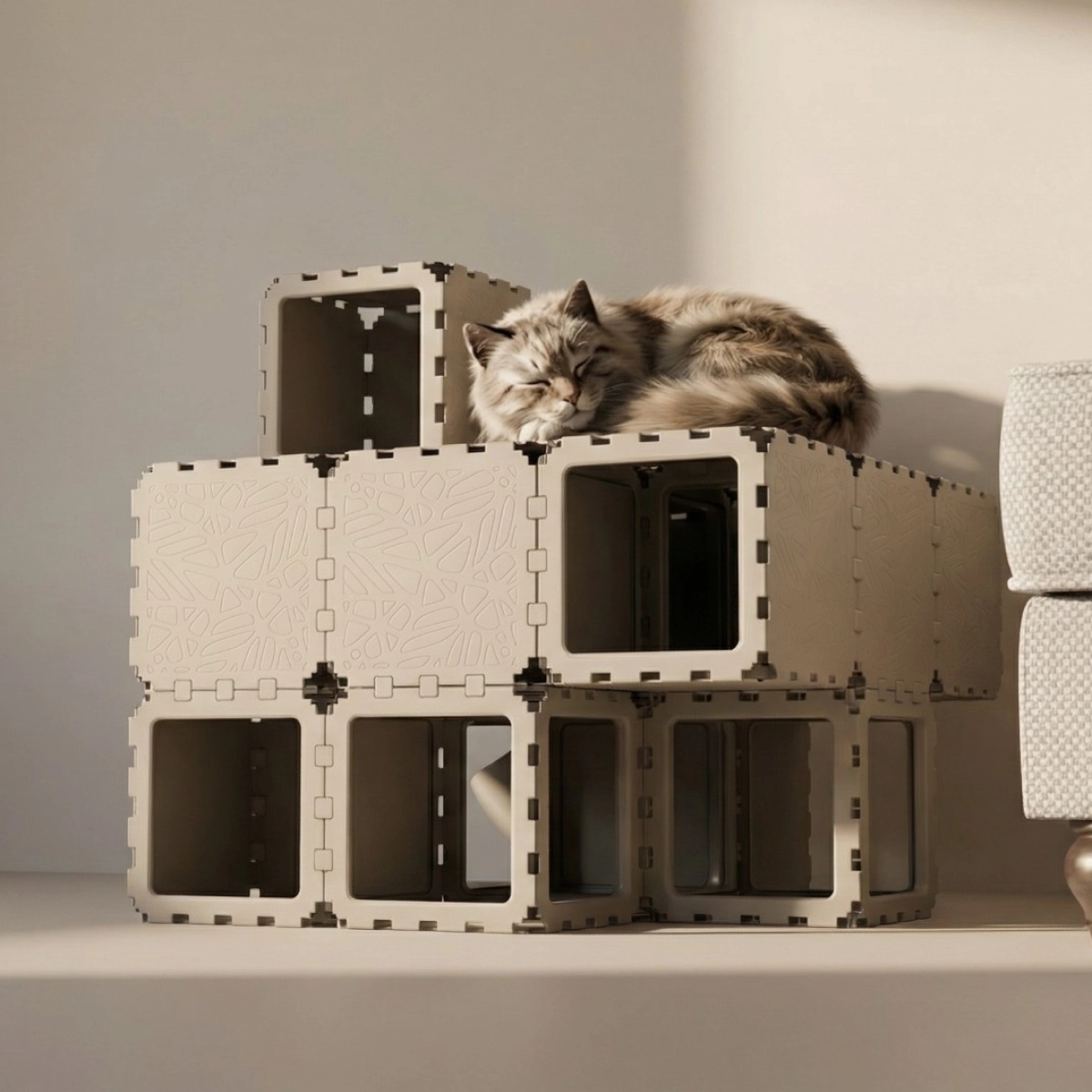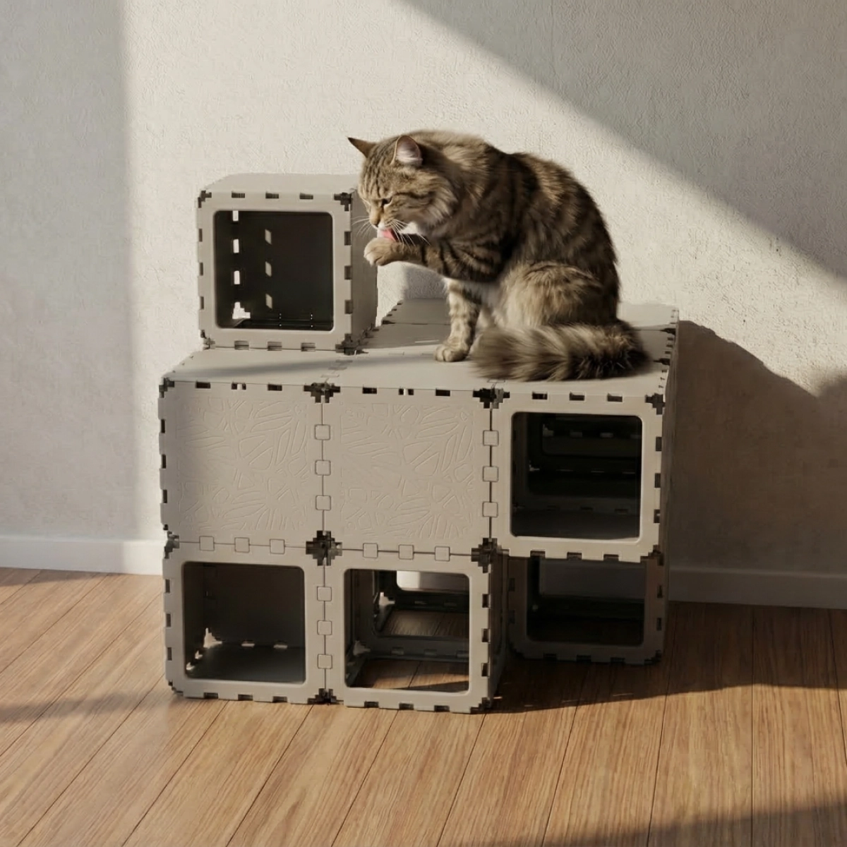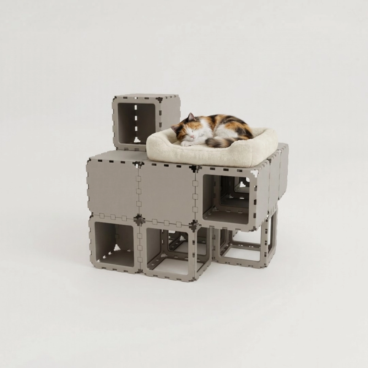 A modular indoor habitat designed for cats, combining rest, play, and movement zones within a compact cubic structure. Built from interlocking elements, the system forms enclosed hideouts, elevated platforms, and internal pathways that support natural feline behavior — climbing, hiding, and observing. The configuration integrates optional accessories such as a litter module and soft resting surfaces, making it suitable as a complete micro-environment for a single or multiple cats.