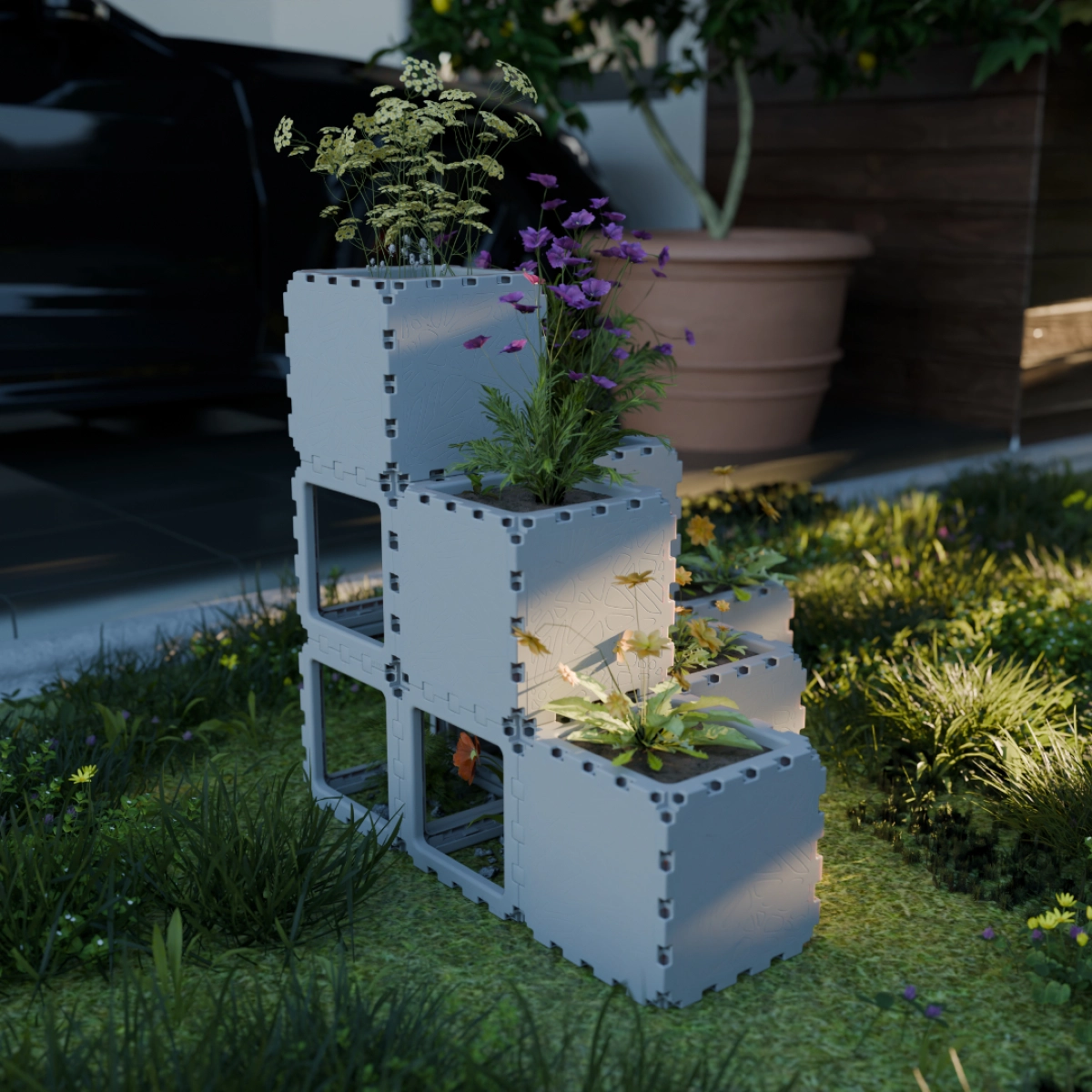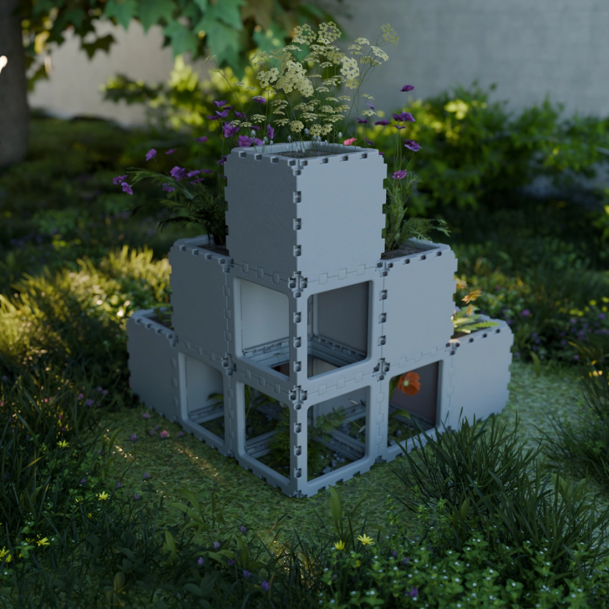 A stepped garden structure made from ten cubes. It creates a multi-level planting layout where plants grow at different heights, forming an expressive garden composition.