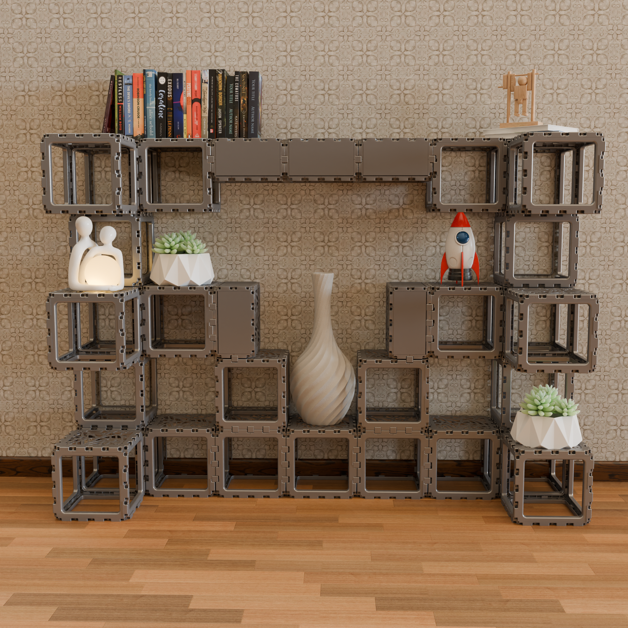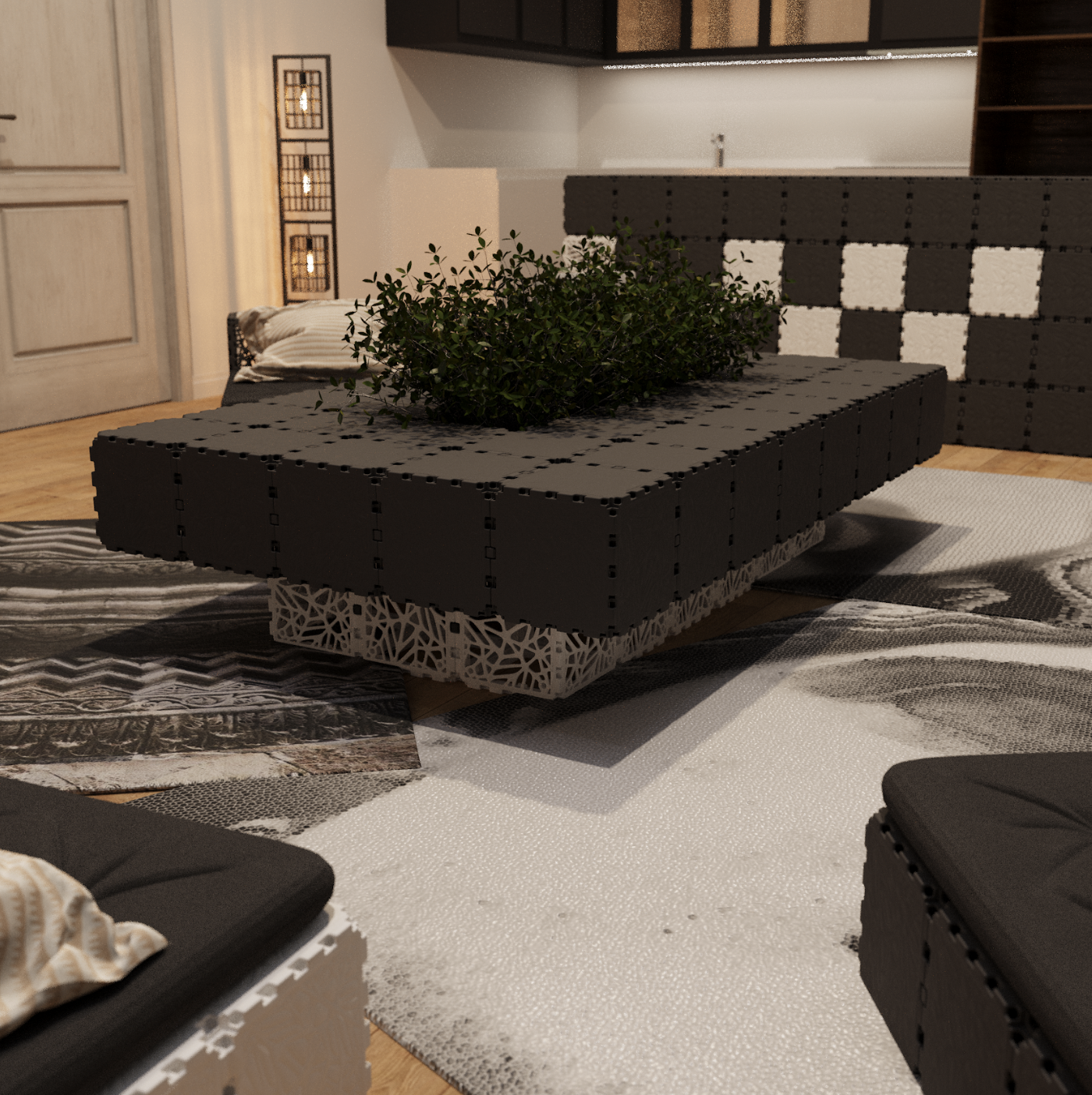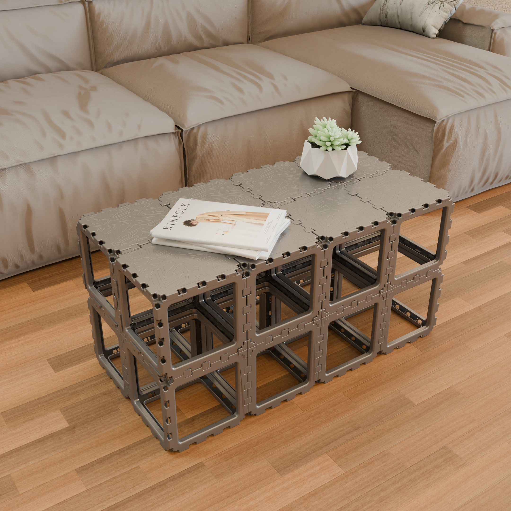 Tillför personlighet till dina gästutrymmen med kreativ inredning byggd med Cubik.One-kuber. Från planteringskärl till skiljeväggar - varje design visar upp modern elegans och modulär uppfinningsrikedom.