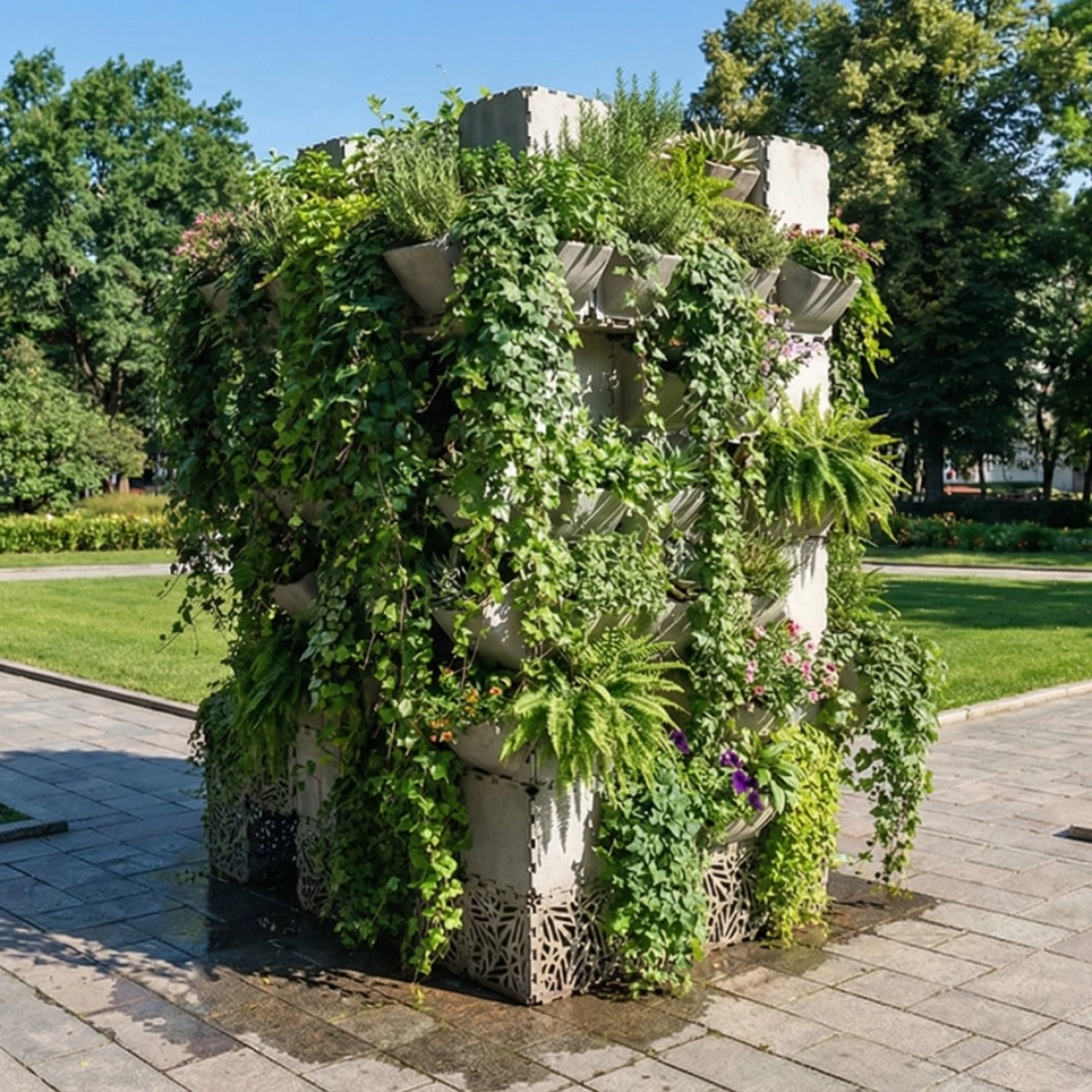 A freestanding modular vertical garden designed for courtyards, terraces, parks, and public outdoor spaces. Built from stackable Cubik.one modules, the structure forms a compact green volume with integrated planter elements on multiple sides, allowing climbing plants, flowers, ferns, and ornamental greenery to grow upward and cascade naturally. The result is a dense, layered green facade that adds softness, depth, and a strong biophilic accent to contemporary outdoor architecture.